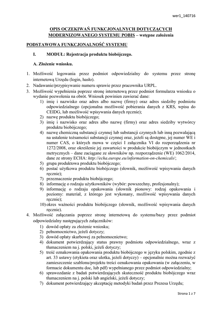 wer1_140716 OPIS OCZEKIWAŃ FUNKCJONALNYCH DOTYCZĄCYCH MODERNIZOWANEGO SYSTEMU POBIS – wstępne założenia PODSTAWOWA FUNKCJONALNOŚĆ SYSTEMU I. MODUŁ: Rejestracja produktu biobójczego. A. Złożenie wniosku. 1. Możliwość logowania przez podmiot odpowiedzialny do systemu przez stronę internetową Urzędu (login, hasło). 2. Nadawanie/przypisywanie numeru sprawie przez pracownika URPL. 3. Możliwość wypełnienia poprzez stronę internetową przez podmiot formularza wniosku o wydanie pozwolenia na obrót. Wniosek powinien zawierać dane: 1) imię i nazwisko oraz adres albo nazwę (firmy) oraz adres siedziby podmiotu odpowiedzialnego (opcjonalna możliwość pobierania danych z KRS, wpisu do CEIDG, lub możliwość wpisywania danych ręcznie); 2) nazwę produktu biobójczego; 3) imię i nazwisko oraz adres albo nazwę (firmy) oraz adres siedziby wytwórcy produktu biobójczego; 4) nazwę chemiczną substancji czynnej lub substancji czynnych lub inną pozwalającą na ustalenie tożsamości substancji czynnej oraz, jeżeli są dostępne, jej numer WE i numer CAS, o których mowa w części I załącznika VI do rozporządzenia nr 1272/2008, oraz określenie jej zawartości w produkcie biobójczym w jednostkach metrycznych – dane zaciągane ze słowników np. rozporządzenie (WE) 1062/2014, dane ze strony ECHA: http://echa.europe.eu/information-on-chemicals/; 5) grupa produktowa produktu biobójczego; 6) postać użytkowa produktu biobójczego (słownik, możliwość wpisywania danych ręcznie); 7) przeznaczenie produktu biobójczego; 8) informację o rodzaju użytkowników (wybór: powszechny, profesjonalny); 9) informację o rodzaju opakowania (słownik pionowy: rodzaj opakowania i poziomy: materiał, z którego jest wykonany, możliwość wpisywania danych ręcznie); 10) okres ważności produktu biobójczego (słownik, możliwość wpisywania danych ręcznie). 4. Możliwość załączania poprzez stronę internetową do systemu/bazy przez podmiot odpowiedzialny następujących załączników: 1) dowód opłaty za złożenie wniosku; 2) pełnomocnictwo, jeżeli dotyczy; 3) dowód opłaty skarbowej za pełnomocnictwo; 4) dokument potwierdzający status prawny podmiotu odpowiedzialnego, wraz z tłumaczeniem na j. polski, jeżeli dotyczy; 5) treść oznakowania opakowania produktu biobójczego w języku polskim, zgodnie z art. 33 ustawy (etykieta oraz ulotka, jeżeli dotyczy) – opcjonalnie można rozważyć zamieszczenie szablonu/projektu treści oznakowania opakowania (w załączeniu, w formacie dokumentu doc, lub pdf) wypełnianego przez podmiot odpowiedzialny; 6) sprawozdanie z badań potwierdzających skuteczność produktu biobójczego wraz tłumaczeniem na j. polski lub angielski, jeżeli dotyczy; 7) dokument potwierdzający akceptację metodyki badań przez Prezesa Urzędu; Strona 1 z 7 wer1_140716 8) oświadczenie o tożsamości produktu wnioskowanego z produktem badanym jeżeli dotyczy; 9) kartę charakterystyki produktu biobójczego, jeżeli dotyczy; 10) oświadczenie o roli substancji, jeżeli dotyczy; 11) upoważnienie do korzystania z danych, jeżeli dotyczy; 12) informację o nazwie dostawcy substancji czynnej lub dostawcy produktu biobójczego znajdującego się w wykazie, o którym mowa w art. 95 rozporządzenia 528/2012, którego produkty lub substancje podmiot odpowiedzialny będzie udostępniał po uzyskaniu pozwolenia na obrót (wybieranie ze strony ECHA: http://echa.europa.eu/information-on-chemicals/active-substance-suppliers/); 13) inne oświadczenia, badania, dokumenty - jeżeli dotyczy. 5. Możliwość załączania do systemu/bazy przez Urząd opinii, pism, uchwał, zaakceptowanych treści oznakowania itp. 6. Możliwość generowania wypełnionego wniosku przez podmiot i drukowania go, by złożyć wersję papierową w Urzędzie. 7. Możliwość drukowania wniosku, załączników, uzupełnień przez Urząd. 8. Możliwość wysyłki wypełnionego wniosku przez podmiot jako dokumentu elektronicznego z certyfikowanym podpisem elektronicznym. 9. Na każdym etapie procedowania wniosku – możliwość dodawania nowych wersji wniosku, wyjaśnień, uzupełnień oraz dodawania załączników. 10. Możliwość edycji przez Urząd złożonych wniosków – powinno być widoczne, co zostało poprawione. B. Etapy rozpatrywania wniosku/etapy postępowania 1. Weryfikacja opłaty – wykonuje pracownik Wydziału Rejestracji. 2. Ocena formalna/kompletności wniosku – wykonuje pracownik Wydziału Rejestracji. 3. Ocena merytoryczna – wstępna - wykonuje pracownik Wydziału Rejestracji. 4. Ocena merytoryczna – badanie skuteczności - wykonuje pracownik Wydziału Oceny Dokumentacji/dział oceny skuteczności. 5. Ocena merytoryczna – treść oznakowania - wykonuje pracownik Wydziału Oceny Dokumentacji/dział oceny treści oznakowania opakowania. 6. Przygotowanie decyzji - wykonuje pracownik Wydziału Rejestracji. Zgodnie z ustawą o produktach biobójczych, okres na rozpatrzenie wniosku (licząc od dnia złożenia kompletnego wniosku) wynosi 6 miesięcy. Zasadne byłoby monitorowanie etapów procedury z uwzględnieniem upływającego czasu (bieżąca obserwacja czasu pozostałego do wydania pozwolenia, dodanie obsługi zatrzymania procesu zliczania czasu, wszystko za pomocą formularzy i kalendarzy. W przypadku gdy wysyłany jest dokument poza Urząd, zliczanie czasu zliczania należy zatrzymać. C. Wyszukiwanie danych. 1. Możliwość wyszukiwania po wszystkich polach zawartych we wniosku/decyzji. 2. W Module Rejestracji POBIS proponujemy umożliwienie wyszukiwania produktów biobójczych na podstawie wszystkich wprowadzonych danych, tj. danych pochodzących z Strona 2 z 7 wer1_140716 wniosku (np.: nazwa, substancja czynna i jej zawartość, producent itd.) oraz informacji z wyników badań skuteczności, nawet wprowadzonych "ręcznie", określających w stosunku do jakich organizmów szkodliwych (rodzaje, gatunki, szczepy) wykazano skuteczne działanie produktu.
