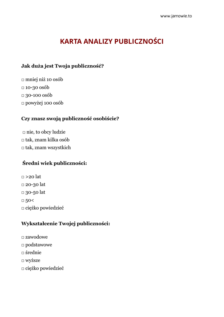 www.jamowie.to KARTA ANALIZY PUBLICZNOŚCI Jak duża jest Twoja publiczność? □ mniej niż 10 osób □ 10-30 osób □ 30-100 osób □ powyżej 100 osób Czy znasz swoją publiczność osobiście? □ nie, to obcy ludzie □ tak, znam kilka osób □ tak, znam wszystkich Średni wiek publiczności: □ >20 lat □ 20-30 lat □ 30-50 lat □ 50< □ ciężko powiedzieć Wykształcenie Twojej publiczności: □ zawodowe □ podstawowe □ średnie □ wyższe □ ciężko powiedzieć www.jamowie.to Zawód: □ uczniowie / studenci □ bezrobotni □ pracownicy fizyczni □ pracownicy umysłowi □ specjaliści □ kierownicy □ właściciele firm Grupa: □ jest jednolita, to osoby z jednego środowiska (np. z jednej firmy) □ jest zróżnicowana, to osoby z różnych środowisk Inne cechy grupy, które mogą być istotne (np. zainteresowania, zamożność, przynależność do grup, itp.) ......................................................................................................................................... ......................................................................................................................................... ......................................................................................................................................... .................................................................................................................................. Jaki jest główny powód, dla którego publiczność uczestniczy w prezentacji? □ rozrywka □ zdobycie wiedzy i / lub informacji na konkretny temat □ wysłuchanie idei □ zakup produktów / usług Jaki jest cel Twojej prezentacji? ......................................................................................................................................... ......................................................................................................................................... ......................................................................................................................................... www.jamowie.to Jakie będą efekty prezentacji? Z czym publiczność opuści salę? 1. .............................................................................................................................. 2. .............................................................................................................................. 3. .............................................................................................................................. Ile będzie trwała prezentacja? .............................................................................................................................. Czy prezentacja multimedialna jest czytelna? □ TAK □ NIE, dlaczego? – popraw prezentację .............................................................................................................................. .............................................................................................................................. Czy publiczność ma komfortowe warunki uczestnictwa w prezentacji? □ TAK □ NIE, dlaczego – czy możesz coś z tym zrobić? .............................................................................................................................. .............................................................................................................................. www.jamowie.to Wszelkie Prawa Zastrzeżone. Wykorzystanie w prasie, radiu, TV, serwisach internetowych oraz blogach materiałów publikowanych na blogu www.jamowie.to oraz wszystkich publikacji mojego autorstwa wymaga każdorazowego podania źródła i autora.