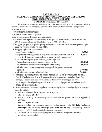 UCHWAŁA WALNEGO ZEBRANIA SPRAWOZDAWCZEGO CZŁONKÓW ROD„MODRZEW” W OSIELSKU z DNIA 10 kwietnia 2014 ROKU Uczestnicy walnego zebrania po zapoznaniu się z treścią sprawozdań z rocznej działalności zarządu, sprawozdań komisji statutowych i projektów: - planu pracy, - preliminarza finansowego - planu pracy na rzecz ogrodu oraz wystąpień w dyskusji postanawiają: 1. Zatwierdzić sprawozdanie zarządu w tym sprawozdanie finansowe za rok 2013 oraz za okres od 01.01.2014r. do 18.01.2014 r. 2. Przyjąć propozycję planu pracy zarządu, preliminarza finansowego oraz plan prac na rzecz ogrodu na rok 2014. 3. Przyjąć opłaty w wysokości: - za m2 pow. działki - 0,57zł - za pobranie energii elektr. wg. obowiązujących cen za kWh. - 0,58zł ( średnią cenę zaokrągloną w górę do pełnego grosza) - za ponowne podłączenie energii elektrycznej ( po odłączeniu za nieuregulowanie opłat) - 80,00zł - za pierwsze podłączenie energii elektrycznej - 25,00zł - ekwiwalent za nie przepracowaną godzinę pracy na rzecz ogrodu - 10,00zł - ekwiwalent za nie odbyty dyżur - 30,00zł 2 4. Przyjąć 1 godzinę pracy na rzecz ogrodu od 75 m powierzchni działki. 5. Zwolnić od obowiązku wykonywania pracy na rzecz ogrodu członków zarządu i przewodniczących komisji statutowych uznając, że ww. wykonując obowiązki regulaminowe wyczerpują tym samym obowiązek pracy na rzecz ogrodu. 6. Kontynuować ustalenia regulaminowo porządkowe obowiązujące w naszym ogrodzie i tak: - termin wnoszenia opłaty na rzecz ogrodu do – 31 maja 2014 r. - termin wpłaty uchwalonego ekwiwalentu za pracę na rzecz ogrodu i dyżury do – 31 lipca 2014 r. - termin opłaty za pobraną energię elektryczną – do 15 dnia każdego miesiąca za miniony miesiąc (od 1.04 do 15.10). Ostateczny termin opłaty - 15.10( rozliczenie końcowe – roczne) - zezwala się na parkowanie pojazdów samochodowych na terenie użytkowanej działki. - zabrania się parkowania pojazdów samochodowych na alejkach i drogach ogrodowych za wyjątkiem za i wyładunku materiałów budowlanych, nawozów itp. - utrzymać dyżury na dotychczas obowiązujących zasadach. - zezwala się na chów gołębi ( przy zachowaniu odpowiednich warunków sanitarnych w ilości określonej przez zarząd) - utrzymać zasadę wyłączeń prądu i wody działkowcom, którzy za ich zużycie nie uregulują opłat w ustalonych terminach, - o przebywaniu na działce gości bez obecności użytkownika działki, należy powiadomić gospodarza ogrodu, - na okres od 15 października do 15 marca pozostawić czynną tylko jedną bramę (2) a od 15 listopada zamknąć wszystkie szlabany oraz wyłączyć oświetlenie ogrodu, - w okresie od 1 maja do 15 września w godzinach od 1000 do 1700 obowiązuje zakaz wjazdu na teren działek ( szlabany zamknięte) - zobowiązuje się użytkowników działek do racjonalnej ( oszczędnej) gospodarki wodą - przed przystąpieniem do modernizacji ( budowy) altany, użytkownik działki jest zobowiązany powiadomić gospodarza ogrodu o terminie rozpoczęcia i zakończenia robót. - po modernizacji ( budowie) altany zobowiązuje się działkowców do wywozu gruzu i innych pozostałości z terenu działek i ogrodu na własny koszt, - wpłaty na rzecz ogrodu dokonywać na konto: ROD „Modrzew” w Osielsku Bank Spółdzielczy O/ Bydgoszcz ul. Kołłątaja 8 Nr 64 8142 0007 0000 1544 2000 0002 lub do kasjera w czasie dyżurów w Domu Działkowca. 7. Użytkownikom działek i członkom ich rodzin zabrania się: - wprowadzania i trzymania na terenie ogrodu psów bez smyczy i kagańca - udostępniania kluczy od bram i furtek ogrodu osobom nie będących członkami ogrodu - dokarmianie zwierząt poza terenem użytkowanej działki - wyrzucania trawy, roślin, gałęzi (nawet pociętych), gruzu do pojemników na śmieci - wywożenia w rejon pojemnika na śmieci mebli, lodówek, telewizorów itp. 8. Za wyrzucanie odpadów roślinnych i trawy do pojemnika na śmieci obciążać wyrzucającego częściowym zwrotem kosztów poniesionych przez ogród związanych z usuwaniem tych odpadów ( w 1/10 części pojemnika). 9. Zorganizować wywóz śmieci w okresie kwiecień – październik. Sekretarz Zarządu Prezes Zarządu