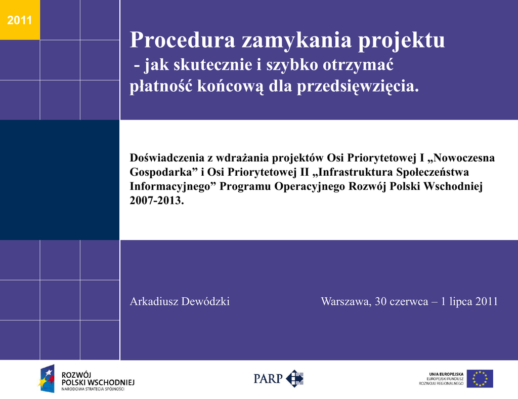 2011 Procedura zamykania projektu - jak skutecznie i szybko otrzymać płatność końcową dla przedsięwzięcia. Doświadczenia z wdrażania projektów Osi Priorytetowej I „Nowoczesna Gospodarka” i Osi Priorytetowej II „Infrastruktura Społeczeństwa Informacyjnego” Programu Operacyjnego Rozwój Polski Wschodniej 2007-2013. Arkadiusz Dewódzki Warszawa, 30 czerwca – 1 lipca 2011 Arkadiusz Dewódzki Warszawa, 30 czerwca – 1 lipca Miejscowość, data 2011 Płatność końcowa dla projektu DEFINICJA: refundacja części lub całości poniesionych wydatków kwalifikowalnych na realizację Projektu przekazywana Beneficjentowi w wyniku zatwierdzenia ostatniego wniosku o płatność (§ 1 pkt 10 umowy). KWOTA: określona w Harmonogramie Przekazywania Dofinansowania (załącznik do Umowy o dofinansowanie) - (§ 10 ust. 1 oraz § 12 ust. 7 pkt 10 umowy). WNIOSEK O PŁATNOŚĆ KOŃCOWĄ: składany w terminie 30 dni od dnia poniesienia ostatniego wydatku w Projekcie i nie później niż w dniu zakończenia realizacji Projektu (termin w § 6 ust. 2 umowy) Arkadiusz Dewódzki Warszawa, 30 czerwca – 1 lipca Miejscowość, data 2011 Warunki dokonania płatności końcowej - § 12 ust. 16 umowy 1) wniosek o płatność końcową zatwierdzony przez IP PO RPW; 2) przeprowadzona przez Instytucję Pośredniczącą PO RPW kontrola w siedzibie Beneficjenta lub w miejscu realizacji Projektu (zbadanie czy Projekt został zrealizowany zgodnie z wnioskiem o dofinansowanie Projektu oraz czy zakładane wskaźniki produktu zostały osiągnięte); 3) w Informacji pokontrolnej zostało potwierdzone, że realizacja projektu przebiegła prawidłowo lub ewentualnych nieprawidłowości zostały usunięte. Arkadiusz Dewódzki Warszawa, 30 czerwca – 1 lipca Miejscowość, data 2011 Arkadiusz Dewódzki Warszawa, 30 czerwca – 1 lipca Miejscowość, data 2011 Najczęściej występujące problemy Etap weryfikacji wniosku o płatność końcową 1) wydatki ogółem dla projektu, 2) harmonogramy realizacji przedsięwzięcia (Harmonogram Rzeczowo- Finansowy, Harmonogram Przekazywania Dofinansowania, Plan Finansowy Projektu, Tabela I wniosku o dofinansowanie „Kategorie Wydatków); 3) Tabela E wniosku o dofinansowanie niezgodna z danymi we wniosku o płatność końcową; 4) uchybienia „standardowe” w dokumentacji wniosku. Arkadiusz Dewódzki Warszawa, 30 czerwca – 1 lipca Miejscowość, data 2011 Najczęściej występujące problemy Etap przygotowania do kontroli na miejscu 1) przygotowanie dokumentacji do losowania próby dokumentów do kontroli, 2) dostępność przedstawicieli Beneficjenta w terminie kontroli proponowanym przez IP PO RPW; 3) przygotowanie przez Beneficjenta dokumentacji prezentowanej w Planie Kontroli Instytucji Pośredniczącej PO RPW. Arkadiusz Dewódzki Warszawa, 30 czerwca – 1 lipca Miejscowość, data 2011 Najczęściej występujące problemy Etap prowadzenia czynności kontrolnych na miejscu FINANSOWA REALIZACJA PROJEKTU: ewidencja księgowa (plan kont, kod księgowy, polityka rachunkowości – bardzo istotna czytelność księgowania w przypadku wydatków limitowanych), ewidencja środków trwałych – brak wszystkich wydatków, bądź ich niezgodność z danymi wykazanymi we wnioskach o płatność, sposób ujęcia gruntów (jeżeli występują) i przypisania ich do projektu, system ewidencjonowania dochodu w projekcie, opisy faktur i równoważnych dowodów księgowych. Arkadiusz Dewódzki Warszawa, 30 czerwca – 1 lipca Miejscowość, data 2011 Najczęściej występujące problemy Etap prowadzenia czynności kontrolnych na miejscu ZAMÓWIENIA PUBLICZNE: zasady prowadzenia zamówień w Instytucji Beneficjenta, obszerna dokumentacja, pytania Wykonawców i odpowiedzi Zamawiającego, ogłoszenia, protokół (kompletność, parafowanie, przejrzystość informacji), zabezpieczenia należytego wykonania umowy (ustanowienie i zwolnienie zabezpieczeń), ANEKSY do umów (art. 144 PZP). Arkadiusz Dewódzki Warszawa, 30 czerwca – 1 lipca Miejscowość, data 2011 Najczęściej występujące problemy Etap prowadzenia czynności kontrolnych na miejscu ROZLICZENIE VAT (JEŻELI KWALIFIKOWALNY): potwierdzenie oświadczeniem kwalifikowalności VAT, interpretacja indywidualna Izby Skarbowej (zapytanie + stanowisko Izby), ewentualne korekty deklaracji VAT, kontrole w zakresie prowadzenia rozliczeń VAT prowadzone przez inne uprawnione organy, opisy faktur i równoważnych dowodów księgowych. Arkadiusz Dewódzki Warszawa, 30 czerwca – 1 lipca Miejscowość, data 2011 Najczęściej występujące problemy Etap prowadzenia czynności kontrolnych na miejscu ARCHIWIZACJA DOKUMENTACJI: kontroli podlegają oryginały dokumentów, informacja o miejscach i jednostkach organizacyjnych odpowiedzialnych za przechowywanie i archiwizację dokumentacji w sposób i w terminie zgodnym z umową o dofinansowanie, dokumentacja zawierająca dane osobowe. PROMOCJA I INFORMACJA: flaga UE, zgodność z Zasadami promocji PO RPW, opisane nie tylko zakupione środki, ale również segregatory, teczki, itp. Arkadiusz Dewódzki Warszawa, 30 czerwca – 1 lipca Miejscowość, data 2011 Najczęściej występujące problemy Etap prowadzenia czynności kontrolnych na miejscu DOKUMENTACJA BUDOWY: dzienniki budowy (kompletność wpisów, w tym danych kierownika budowy, kierowników robót, inspektorów nadzoru inwestorskiego); roboty dodatkowe i zamienne (sposób dokumentowania, zasadność); ubezpieczenia i gwarancje (oryginały dokumentów, daty wystawienia, daty przedłożenia, zgodność z kontraktem) – weryfikujemy ubezpieczenia wykonawcy, jeżeli Zamawiający wymagał ich kontraktem!; dokumentacja powykonawcza (kompletność, zgodność danych z wykazanymi wskaźnikami produktu). Arkadiusz Dewódzki Warszawa, 30 czerwca – 1 lipca Miejscowość, data 2011 Najczęściej występujące problemy Etap prowadzenia czynności kontrolnych na miejscu DOKUMENTACJA ODBIOROWA: protokoły odbioru częściowego i końcowego 