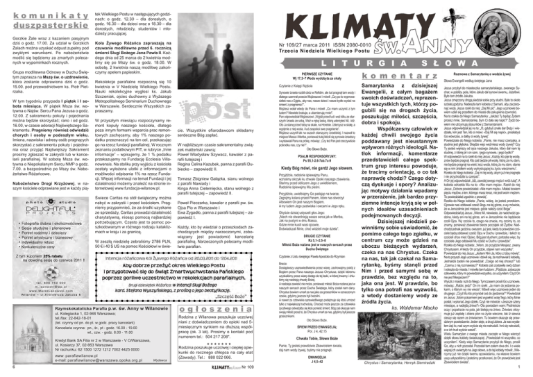 komunikaty duszpaster skie Gorzkie Żale wraz z kazaniem pasyjnym dziś o godz. 17.00. Za udział w Gorzkich Żalach można uzyskać odpust zupełny pod zwykłymi warunkami. Po nabożeństwie modlić się będziemy za zmarłych polecanych w wypominkach rocznych. Grupa modlitewna Odnowy w Duchu Świętym zaprasza na Mszę św. o uzdrowienie, która zostanie odprawiona dziś o godz. 15.00. pod przewodnictwem ks. Piotr Pietrzaka. W tym tygodniu przypada I piątek i I sobota miesiąca. W piątek Msza św. wotywna o Najśw. Sercu Pana Jezusa o godz. 12.00. Z sakramentu pokuty i pojednania można będzie skorzystać; rano i od godz. 16.00, w czasie adoracji Najświętszego Sakramentu. Pragniemy również odwiedzić chorych i osoby w podeszłym wieku. Imiona, nazwiska i adresy osób pragnących skorzystać z sakramentu pokuty i pojednania oraz przyjąć Najświętszy Sakrament prosimy zgłaszać w zakrystii lub w kancelarii parafialnej. W sobotę Msza św. wotywna o Niepokalanym Sercu NMP o godz. 7.00. a bezpośrednio po Mszy św. Nabożeństwo Różańcowe. Nabożeństwo Drogi Krzyżowej, w naszym kościele odprawiane jest w każdy pią- tek Wielkiego Postu w następujących godzinach: o godz. 12.30 – dla dorosłych, o godz. 16.30 – dla dzieci oraz o 18.30 – dla dorosłych, młodzieży, studentów i młodzieży pracującej. Koła Żywego Różańca zapraszają na czuwanie modlitewne przed 6. rocznicą śmierci Sługi Bożego Jana Pawła II. Każdego dnia od 25 marca do 2 kwietnia modlimy się po Mszy św. o godz. 18.00. W sobotę, 2 kwietnia naszą modlitwę zakończymy apelem papieskim. Nr 109/27 marca 2011 ISSN 2080-0010 Trzecia Niedziela Wielkiego Postu L I T U R G I A PIERWSZE CZYTANIE Wj 17,3–7 Woda wydobyta ze skały Rekolekcje parafialne rozpoczną się 10 kwietnia w V Niedzielę Wielkiego Postu. Nauki rekolekcyjne wygłosi ks. Jakub Szczeniak, ojciec duchowny z Wyższego Metropolitalnego Seminarium Duchownego w Warszawie. Serdecznie Wszystkich zapraszamy. W przyszłym miesiącu rozpoczynamy remont kopuły naszego kościoła, dlatego poza innym formami wsparcia prac remontowych zachęcamy, aby 1% naszego podatku przeznaczyć na ten cel, przekazując go na rzecz fundacji parafialnej. W rocznym zeznaniu podatkowym PIT, w rubryce „Inne informacje” – wpisujemy, że 1 % podatku przekazujemy na Fundację Ecclesia Villanowensis. Na stoliku przy wyjściu z kościoła zostały wyłożone ulotki z informacjami o możliwości odpisania 1% na rzecz Fundacji. Więcej informacji na temat Fundacji i jej działalności możemy znaleźć na stronie internetowej www.fundacja-wilanow.pl. Świece Caritas na stół świąteczny można nabyć w zakrystii i przed kościołem. Pragniemy przypomnieć, że za środki uzyskane ze sprzedaży, Caritas prowadzi działalność charytatywną, niosąc pomocą najbardziej potrzebującym. Często jest to pomoc poszkodowanym w różnego rodzaju kataklizmach w kraju i za granicą. W zeszłą niedzielę zebraliśmy 2786 PLN, 50 € i 40 $ US na pomoc Kościołowi w świe- Czytanie z Księgi Wyjścia cie. Wszystkim ofiarodawcom składamy serdeczne Bóg zapłać. W najbliższym czasie sakramentalny związek małżeński zawrą: Paweł Władysław Szywacz, kawaler z parafii tutejszej i Regina Celina Kazubek, panna z parafii Dubiecko – zapowiedź II. Tomasz Zbigniew Gałązka, stanu wolnego z parafii Nawiady i Kinga Anna Cielemięcka, stanu wolnego z parafii tutejszej – zapowiedź II. Paweł Pieczarka, kawaler z parafii pw. św. Ojca Pio w Warszawie i Ewa Zygadło, panna z parafii tutejszej – zapowiedź I. Każdy, kto by wiedział o przeszkodach zachodzących między narzeczonymi, zobowiązany jest powiadomić kancelarię parafialną. Narzeczonych polecamy modlitwie parafian. Synowie Izraela rozbili obóz w Refidim, ale lud pragnął tam wody i dlatego szemrał przeciw Mojżeszowi i mówił: „Czy po to wyprowadziłeś nas z Egiptu, aby nas, nasze dzieci i nasze bydło wydać na śmierć z pragnienia?”. Mojżesz wołał wtedy do Pana i mówił: „Co mam uczynić z tym ludem? Niewiele brakuje, a ukamienują mnie!”. Pan odpowiedział Mojżeszowi: „Wyjdź przed lud i weź kilku ze starszych Izraela ze sobą. Weź w rękę laskę, którą uderzyłeś Nil, i idź. Oto Ja stanę przed tobą na skale, na Horebie. Uderzysz w skałę, a wypłynie z niej woda, i lud zaspokoi swe pragnienie”. Mojżesz uczynił tak na oczach starszyzny izraelskiej. I nazwał to miejsce Massa i Meriba, ponieważ tutaj kłócili się synowie izraelscy i wystawiali Pana na próbę, mówiąc: „Czy też Pan jest rzeczywiście pośrodku nas, czy nie?”. Oto Słowo Boże. PSALM RESPONSORYJNY: Ps 95,1-2.6-7ab.7c-9 Kiedy Bóg mówi, nie gardź Jego słowem. Przyjdźcie, radośnie śpiewajmy Panu, wznośmy okrzyki ku chwale Opoki naszego zbawienia. Stańmy przed obliczem Jego z uwielbieniem, Radośnie śpiewajmy Mu pieśni. Przyjdźcie, uwielbiajmy Go padając na twarze, Zegnijmy kolana przed Panem, które nas stworzył Albowiem On jest naszym Bogiem, A my ludem Jego pastwiska i owcami w Jego ręku. Obyście dzisiaj usłyszeli głos Jego: „Niech nie stwardnieją wasze serca jak w Meriba, Jak na pustyni w dniu Massa, Gdzie mnie kusili wasi ojcowie, Doświadczali Mnie, choć widzieli moje dzieła”. DRUGIE CZYTANIE Rz 5,1–2.5–8 Miłość Boża rozlana jest w naszych sercach przez Ducha Świętego Czytanie z Listu świętego Pawła Apostoła do Rzymian Rzymskokatolicka Parafia p.w. św. Anny w Wilanowie ul. Kolegiacka 1, 02-946 Warszawa; tel./fax: 22-842-18-01 (tel. czynny od pn. do pt. w godz. pracy kancelarii) Kancelaria czynna: pn., śr., pt - godz. 16.00 - 19.00 wt., czw. - godz. 8.00 - 11.00 Kredyt Bank SA Filia nr 2 w Warszawie - V O/Warszawa, ul. Kosiarzy 37, 02-953 Warszawa Nr rachunku: 62 1500 1272 1212 7002 4425 0000 www: parafiawilanow.pl e-mail: [email protected] 6 ogłoszenia Rodzina z Wilanowa poszukuje uczciwej niani z doświadczeniem do opieki nad 5miesięcznym sy