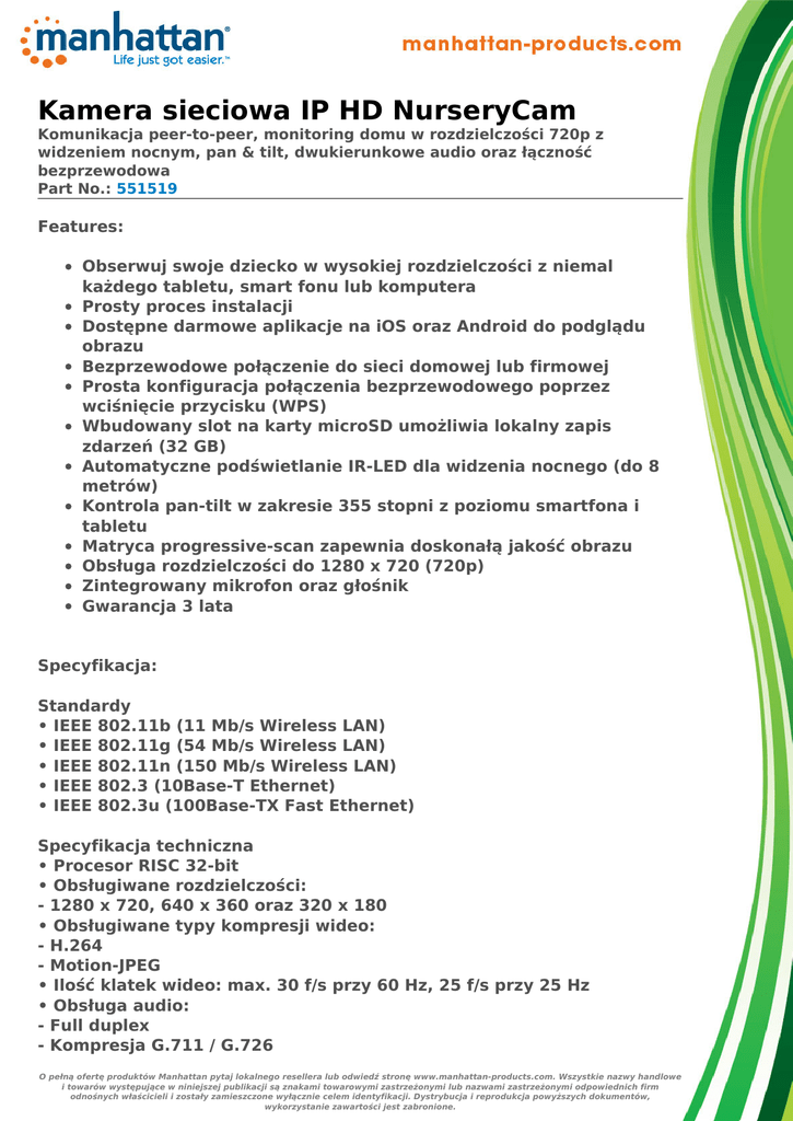Kamera sieciowa IP HD NurseryCam Komunikacja peer-to-peer, monitoring domu w rozdzielczości 720p z widzeniem nocnym, pan & tilt, dwukierunkowe audio oraz łączność bezprzewodowa Part No.: 551519 Features: Obserwuj swoje dziecko w wysokiej rozdzielczości z niemal każdego tabletu, smart fonu lub komputera Prosty proces instalacji Dostępne darmowe aplikacje na iOS oraz Android do podglądu obrazu Bezprzewodowe połączenie do sieci domowej lub firmowej Prosta konfiguracja połączenia bezprzewodowego poprzez wciśnięcie przycisku (WPS) Wbudowany slot na karty microSD umożliwia lokalny zapis zdarzeń (32 GB) Automatyczne podświetlanie IR-LED dla widzenia nocnego (do 8 metrów) Kontrola pan-tilt w zakresie 355 stopni z poziomu smartfona i tabletu Matryca progressive-scan zapewnia doskonałą jakość obrazu Obsługa rozdzielczości do 1280 x 720 (720p) Zintegrowany mikrofon oraz głośnik Gwarancja 3 lata Specyfikacja: Standardy • IEEE 802.11b (11 Mb/s Wireless LAN) • IEEE 802.11g (54 Mb/s Wireless LAN) • IEEE 802.11n (150 Mb/s Wireless LAN) • IEEE 802.3 (10Base-T Ethernet) • IEEE 802.3u (100Base-TX Fast Ethernet) Specyfikacja techniczna • Procesor RISC 32-bit • Obsługiwane rozdzielczości: - 1280 x 720, 640 x 360 oraz 320 x 180 • Obsługiwane typy kompresji wideo: - H.264 - Motion-JPEG • Ilość klatek wideo: max. 30 f/s przy 60 Hz, 25 f/s przy 25 Hz • Obsługa audio: - Full duplex - Kompresja G.711 / G.726 O pełną ofertę produktów Manhattan pytaj lokalnego resellera lub odwiedź stronę www.manhattan-products.com. Wszystkie nazwy handlowe i towarów występujące w niniejszej publikacji są znakami towarowymi zastrzeżonymi lub nazwami zastrzeżonymi odpowiednich firm odnośnych właścicieli i zostały zamieszczone wyłącznie celem identyfikacji. Dystrybucja i reprodukcja powyższych dokumentów, wykorzystanie zawartości jest zabronione. - Mikrofon: wbudowany - Głośnik: wbudowany - Wyjście audio jack: 3,5 mm - Wejście audio jack: 3,5 mm • Certyfikaty: FCC Class B, RoHS, CE Przetwornik i układ optyczny: • Przetwornik 1/4" Progressive Scan CMOS • 1 000 000 pikseli • Wskaźnik S/N (sygnał/szum): > 48 dB • Manualna regulacja jasności i kontrastu • Automatyczny balans bieli (WB) oraz kompensacja tylnego oświetlenia (BLC) • Minimalne natężenie światła: 0,4 lux przy F2.0 • Długość ogniskowej: 3.6 mm Kontrola Pan/Tilt: • Zakres ruchu: 355° w poziomie oraz 90° w pinie • Sterowanie z poziomu tabletu lub smartfona • 8 pozycji patrolowych Sieć: • Złącze LAN: port RJ-45 w do podłączenia do sieci 10/100 Mb/s Ethernet • Moduł bezprzewodowy b/g/n ze stałą anteną Zasilanie • Zewnętrzy adapter zasilania 5V DC, 2A Minimalne wymagania systemowe: • iPhone lub iPad • Smartfon lub tablet z systemem Android 4.x Parametry fizyczne: • Obudowa: plastik • Wymiary: 112 (l) x 90 (w) x 116 (h) mm • Waga: 0.275 kg • Temperatura pracy: -10 – 50°C • Wilgotność pracy: 10 - 90% RH, nieskondensowana Zawartość opakowania • Kamera sieciowa IP HD NurseryCam • Zasilacz • Instrukcja szybkiej instalacji • Uchwyty i akcesoria do montażu ściennego • Kabel sieciowy RJ45 Cat5 1,2m O pełną ofertę produktów Manhattan pytaj lokalnego resellera lub odwiedź stronę www.manhattan-products.com. Wszystkie nazwy handlowe i towarów występujące w niniejszej publikacji są znakami towarowymi zastrzeżonymi lub nazwami zastrzeżonymi odpowiednich firm odnośnych właścicieli i zostały zamieszczone wyłącznie celem identyfikacji. Dystrybucja i reprodukcja powyższych dokumentów, wykorzystanie zawartości jest zabronione. O pełną ofertę produktów Manhattan pytaj lokalnego resellera lub odwiedź stronę www.manhattan-products.com. Wszystkie nazwy handlowe i towarów występujące w niniejszej publikacji są znakami towarowymi zastrzeżonymi lub nazwami zastrzeżonymi odpowiednich firm odnośnych właścicieli i zostały zamieszczone wyłącznie celem identyfikacji. Dystrybucja i reprodukcja powyższych dokumentów, wykorzystanie zawartości jest zabronione.