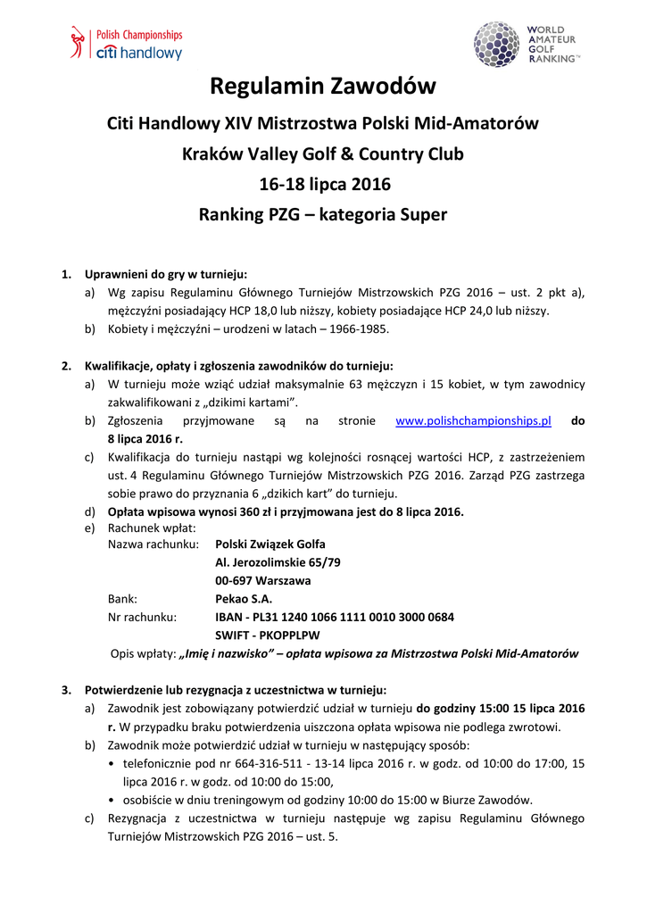 Regulamin Zawodów Citi Handlowy XIV Mistrzostwa Polski Mid-Amatorów Kraków Valley Golf & Country Club 16-18 lipca 2016 Ranking PZG – kategoria Super 1. Uprawnieni do gry w turnieju: a) Wg zapisu Regulaminu Głównego Turniejów Mistrzowskich PZG 2016 – ust. 2 pkt a), mężczyźni posiadający HCP 18,0 lub niższy, kobiety posiadające HCP 24,0 lub niższy. b) Kobiety i mężczyźni – urodzeni w latach – 1966-1985. 2. Kwalifikacje, opłaty i zgłoszenia zawodników do turnieju: a) W turnieju może wziąć udział maksymalnie 63 mężczyzn i 15 kobiet, w tym zawodnicy zakwalifikowani z „dzikimi kartami”. b) Zgłoszenia przyjmowane są na stronie www.polishchampionships.pl do 8 lipca 2016 r. c) Kwalifikacja do turnieju nastąpi wg kolejności rosnącej wartości HCP, z zastrzeżeniem ust. 4 Regulaminu Głównego Turniejów Mistrzowskich PZG 2016. Zarząd PZG zastrzega sobie prawo do przyznania 6 „dzikich kart” do turnieju. d) Opłata wpisowa wynosi 360 zł i przyjmowana jest do 8 lipca 2016. e) Rachunek wpłat: Nazwa rachunku: Polski Związek Golfa Al. Jerozolimskie 65/79 00-697 Warszawa Bank: Pekao S.A. Nr rachunku: IBAN - PL31 1240 1066 1111 0010 3000 0684 SWIFT - PKOPPLPW Opis wpłaty: „Imię i nazwisko” – opłata wpisowa za Mistrzostwa Polski Mid-Amatorów 3. Potwierdzenie lub rezygnacja z uczestnictwa w turnieju: a) Zawodnik jest zobowiązany potwierdzić udział w turnieju do godziny 15:00 15 lipca 2016 r. W przypadku braku potwierdzenia uiszczona opłata wpisowa nie podlega zwrotowi. b) Zawodnik może potwierdzić udział w turnieju w następujący sposób: • telefonicznie pod nr 664-316-511 - 13-14 lipca 2016 r. w godz. od 10:00 do 17:00, 15 lipca 2016 r. w godz. od 10:00 do 15:00, • osobiście w dniu treningowym od godziny 10:00 do 15:00 w Biurze Zawodów. c) Rezygnacja z uczestnictwa w turnieju następuje wg zapisu Regulaminu Głównego Turniejów Mistrzowskich PZG 2016 – ust. 5. d) Zawodnik niezrzeszony w PZG i biorący udział w turnieju, zobowiązany jest do przedstawienia certyfikatu wystawionego przez narodowy związek/federacje potwierdzający jego aktualny HCP w wersji papierowej do Biura Zawodów lub wysyłając e-mail na adres poczty elektronicznej [email protected] najpóźniej do godziny 15:00 15 lipca 2016 r. Osoba, która tego nie zrobi nie może wziąć udziału w turnieju. 4. Format turnieju; tees, klasyfikacje: a) Turniej rozgrywany będzie w formacie stroke play na 54 dołkach (3 rundy x 18 dołków): 16 lipca – I runda, 17 lipca – II runda, CUT – wg zapisu Regulaminu Głównego Turniejów Mistrzowskich PZG 2016 – ust. 12, 18 lipca – III runda (finałowa). b) Tee – turniejowe PZG: długość pola dla mężczyzn (żółte) – z uwzględnieniem zmian długości dozwolonych przez Europejską Federację Golfa (EGA), długość pola dla kobiet (czerwone) – z uwzględnieniem zmian długości dozwolonych przez Europejską Federację Golfa (EGA). c) Dogrywka wg zapisu Regulaminu Głównego Turniejów Mistrzowskich PZG 2016 – ust. 13. 5. Zwycięzcy turnieju: a) Zwycięzcy turnieju Mistrzostw Polski Mid-Amatorów w klasyfikacji stroke play brutto otrzymują następujące tytuły: I miejsce – Mistrz Polski Mid-Amatorów, II miejsce – I Wicemistrz Polski Mid-Amatorów, III miejsce – II Wicemistrz Polski Mid-Amatorów, I miejsce – Mistrzyni Polski Mid-Amatorów, II miejsce – I Wicemistrzyni Polski Mid-Amatorów, III miejsce – II Wicemistrzyni Polski Mid-Amatorów. b) Nagrody w klasyfikacji generalnej stroke play netto wg zapisów Regulaminu Głównego Turniejów Mistrzowskich PZG 2015 – ust 14 i 16. 6. Ranking PZG: Punkty do rankingu otrzymają członkowie PZG wg Regulaminu Rankingu PZG 2016. 2 Citi Handlowy XIV Mistrzostwa Polski Mid-Amatorów, Kraków Valley Golf & Country Club, 16-18 lipca 2016