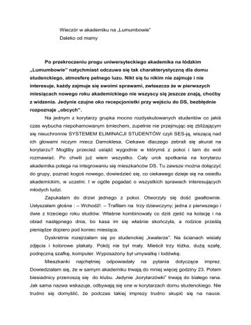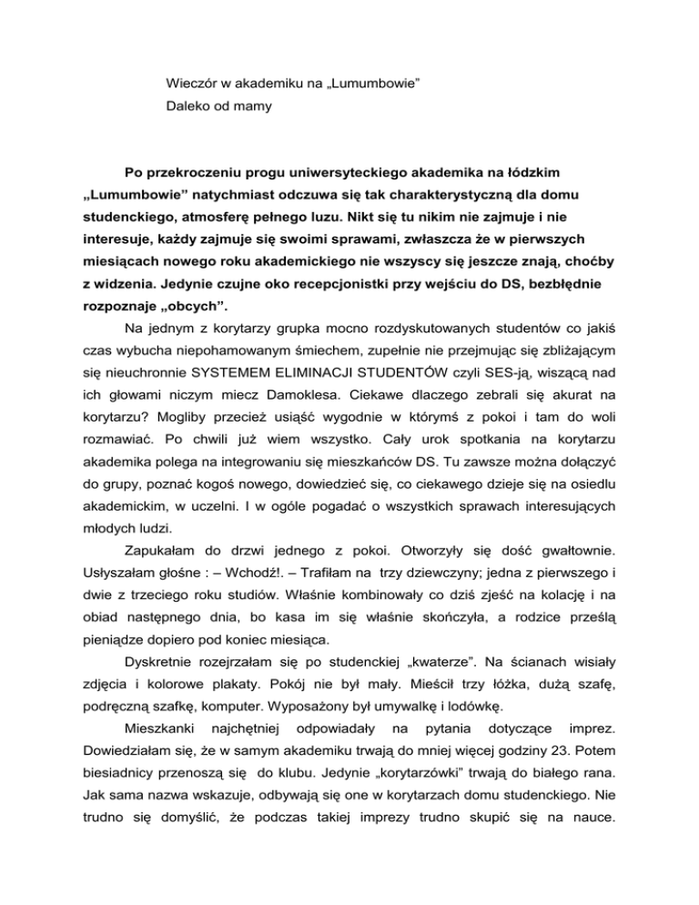 Wieczór w akademiku na „Lumumbowie” Daleko od mamy Po przekroczeniu progu uniwersyteckiego akademika na łódzkim „Lumumbowie” natychmiast odczuwa się tak charakterystyczną dla domu studenckiego, atmosferę pełnego luzu. Nikt się tu nikim nie zajmuje i nie interesuje, kaŜdy zajmuje się swoimi sprawami, zwłaszcza Ŝe w pierwszych miesiącach nowego roku akademickiego nie wszyscy się jeszcze znają, choćby z widzenia. Jedynie czujne oko recepcjonistki przy wejściu do DS, bezbłędnie rozpoznaje „obcych”. Na jednym z korytarzy grupka mocno rozdyskutowanych studentów co jakiś czas wybucha niepohamowanym śmiechem, zupełnie nie przejmując się zbliŜającym się nieuchronnie SYSTEMEM ELIMINACJI STUDENTÓW czyli SES-ją, wiszącą nad ich głowami niczym miecz Damoklesa. Ciekawe dlaczego zebrali się akurat na korytarzu? Mogliby przecieŜ usiąść wygodnie w którymś z pokoi i tam do woli rozmawiać. Po chwili juŜ wiem wszystko. Cały urok spotkania na korytarzu akademika polega na integrowaniu się mieszkańców DS. Tu zawsze moŜna dołączyć do grupy, poznać kogoś nowego, dowiedzieć się, co ciekawego dzieje się na osiedlu akademickim, w uczelni. I w ogóle pogadać o wszystkich sprawach interesujących młodych ludzi. Zapukałam do drzwi jednego z pokoi. Otworzyły się dość gwałtownie. Usłyszałam głośne : – Wchodź!. – Trafiłam na trzy dziewczyny; jedna z pierwszego i dwie z trzeciego roku studiów. Właśnie kombinowały co dziś zjeść na kolację i na obiad następnego dnia, bo kasa im się właśnie skończyła, a rodzice prześlą pieniądze dopiero pod koniec miesiąca. Dyskretnie rozejrzałam się po studenckiej „kwaterze”. Na ścianach wisiały zdjęcia i kolorowe plakaty. Pokój nie był mały. Mieścił trzy łóŜka, duŜą szafę, podręczną szafkę, komputer. WyposaŜony był umywalkę i lodówkę. Mieszkanki najchętniej odpowiadały na pytania dotyczące imprez. Dowiedziałam się, Ŝe w samym akademiku trwają do mniej więcej godziny 23. Potem biesiadnicy przenoszą się do klubu. Jedynie „korytarzówki” trwają do białego rana. Jak sama nazwa wskazuje, odbywają się one w korytarzach domu studenckiego. Nie trudno się domyślić, Ŝe podczas takiej imprezy trudno skupić się na nauce. Mieszkańcy jednak wiedzą o nich wcześniej i wówczas inaczej planuję wkuwanie wiedzy. Zawsze teŜ znajdzie się w akademiku spokojniejsze miejsce, gdzie moŜna przygotować się do zajęć lub sprawdzianu, jeśli zaistnieje taka potrzeba. Jedna z mieszkanek, Kasia, zwierzyła mi się, Ŝe póki do sesji jeszcze kilka tygodni, nauka nie jest dla niej najwaŜniejszym zajęciem. Chętniej wybiera się ze znajomymi na piwo, ogląda telewizję, uprawia gry komputerowe. Gdy jednak starczy jeszcze czasu, chętnie sięga po ksiąŜki. Gdy kończyłam z Kasią rozmowę, pojawił się Maciek, mieszkaniec sąsiedniego pokoju. – Największy luzak akademika – jak określiły kolegę trzy goszczące mnie dziewczyny. Bezceremonialnie rozsiadł się na jednym z łóŜek, zapalił papierosa i ku naszemu najwyŜszemu zdumieniu smętnie wyznał, Ŝe zbliŜające się święta nie słuŜą mu, bo... coraz częściej tęskni za rodzinnym domem. Dziewczyny pół Ŝartem pół serio pocieszyły kolegę, Ŝe kaŜdego lokatora akademika, w mniejszym lub większym stopniu, taka nostalgia kiedyś dopada. Maciek przyjął to z widoczną ulgą i wyrzucił z siebie, Ŝe właściwie to opuścił swój pokój, bo zirytował go kolega, który nie potrafił sam... wyprasować koszuli na wieczorne spotkanie z dziewczyną. W rodzinnym domu robiła to wyłącznie mamusia. A tu trzeba samemu łapać za Ŝelazko. Czas w akademiku mijał bardzo szybko. Zanim się zorientowałam był juŜ bardzo późny wieczór. Miałam właśnie opuszczać DS, gdy dostrzegłam wychodzącą z jednego z pokoi dziewczynę obładowaną walizkami. Wyglądało to na wyprowadzkę. I tak rzeczywiście było. Dowiedziałam się, Ŝe Anka opuszcza właśnie akademik, bo ma dosyć hałasu i... beznadziejnego towarzystwa. Przed domem studenckim czekała juŜ na nią taksówka, którą miała pojechać dwie ulice dalej, gdzie wynajęła mieszkanie „na mieście” wraz z kuzynką. Większość moich rozmówców uwaŜa jednak akademik za rozwiązanie dobre dla studentów spoza Łodzi. Pobyt w nim, kosztuje bowiem mniej niŜ wynajęcie prywatnej kwatery, co waŜne jest zwłaszcza dla słuchaczy o mniej zasobnym portfelu. Warunki socjalne są teŜ dobre. Ponadto dom studencki stanowi świetne miejsce do poznania nowych kolegów, często bardzo ciekawych ludzi i nawiązania wieloletnich przyjaźni. Uczy równieŜ samodzielności, umiejętności „bycia” w grupie i stwarza warunki do korzystania z uroków Ŝakowskiego Ŝycia, jakich nie spotka się na Ŝadnej prywatnej kwaterze. Aby się o tym przekonać wystarczy po latach porozmawiać z byłymi mieszkańcami akademików... PAULINA ZYCH