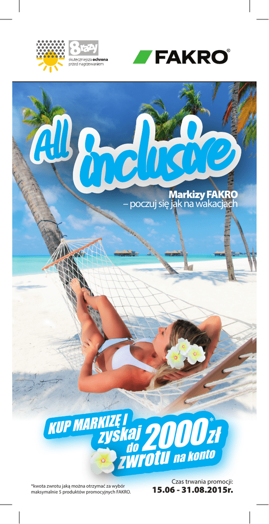 All inclusive Markizy FAKRO – poczuj się jak na wakacjach ! A J C O M O PR ĘI KUP MARKIZ kaj * zw na konto zys 0 zł 0 0 2 rotu do *kwota zwrotu jaką można otrzymać za wybór maksymalnie 5 produktów promocyjnych FAKRO. Czas trwania promocji: 15.06 - 31.08.2015r. All e v i s u l inc Markizy FAKRO – poczuj się jak na wakacjach Kiedy na zewnątrz zaczyna się upał, a Ty marzysz o zacienionym pomieszczeniu w swoim domu – zastosuj Markizę, która skutecznie cię przed nim ochroni. Inwestując w Markizę zyskujesz skuteczną ochronę przed nagrzewaniem pomieszczeń oraz zwrot części kosztów poniesionych na jej zakup. Markizy FAKRO to . . . SKUTECZNA OCHRONA PRZED UPAŁEM Markiza stanowi optymalne rozwiązanie jako ochrona przed nadmiernym ciepłem słonecznym. Absorbuje promieniowanie słoneczne już przed szybą i emituje ciepło na zewnątrz, przez co w słoneczne dni bardzo dobrze chroni wnętrze przed uciążliwym upałem. Markiza chroni pomieszczenie do 8 razy lepiej w porównaniu z osłonami wewnętrznymi, co w praktyce powoduje spadek temperatury wnętrza nawet o 100C. DOPŁYW NATURALNEGO ŚWIATŁA I ZAPEWNIENIE WIDOCZNOŚCI NA ZEWNĄTRZ Okna zasłonięte markizami w przeciwieństwie do rolet zewnętrznych umożliwiają napływ naturalnego światła i zapewniają widoczność na zewnątrz. Markizy przepuszczają wystarczającą ilość światła aby nie używać dodatkowego oświetlenia. Możemy swobodnie obserwować okolice, a jednocześnie dają poczucie prywatności chroniąc wnętrze przed obserwatorami z zewnątrz. OCHRONA PRZED OWADAMI Zasunięta markiza elektryczna na oknie pionowym oprócz ochrony przed nagrzewaniem pomieszczenia pełni funkcje moskitiery. Gdy okno jest otwarte rozwinięta markiza chroni wnętrze przed owadami. ENERGOOSZCZĘDNOŚĆ Markiza ogranicza zużycie energii w urządzeniach klimatyzacyjnych. Rozwinięta markiza w ciągu chłodnych nocy chroni wnętrze przed stratami ciepła poprawiając współczynnik przenikania ciepła okna aż do 16%. W ten sposób obniżamy rachunki za ogrzewanie. OCHRONA PRZED SZKODLIWYM PROMIENIOWANIEM UV Markiza ogranicza przenikanie szkodliwego promieniowania UV do wnętrza pomieszczenia. Zaciągnięta markiza pomaga chronić przedmioty i materiały znajdujące się we wnętrzu przed szkodliwym promieniowaniem UV, które powoduje ich odbarwianie. Jak skorzystać z promocji? 1. W terminie od 15.06.2015 do 31.08.2015 kup Markizę FAKRO 2. Oblicz wartość zwrotu - maksymalnie za 5 produktów. zwrot 300zł Zwrot przy zakupieMarkiz: - VMZ Solar - automatyczna obsługa, - VMZ Z-Wave – sterowana za pomocą pilota lub przełącznika naściennego. zwrot 400zł Zwrot przy zakupie Markizolet: - VMB Solar – automatyczna obsługa, - VMB Z-Wave – sterowana za pomocą pilota lub przełącznika naściennego. pieczątka firmowa 3. Do dnia 30.09.2015 wejdź na stronę www.fakro.pl i prześlij elektroniczne zgłoszenie: - elektroniczny formularz zgłoszeniowy, - skan dowodu wpłaty zaliczki, - skan dowodu zakupu. 4. Po pozytywnej weryfikacji przesłanego zgłoszenia promocyjnego otrzymasz zwrot na podane w formularzu zgłoszeniowym konto bankowe. Szczegóły na stronie www.fakro.pl