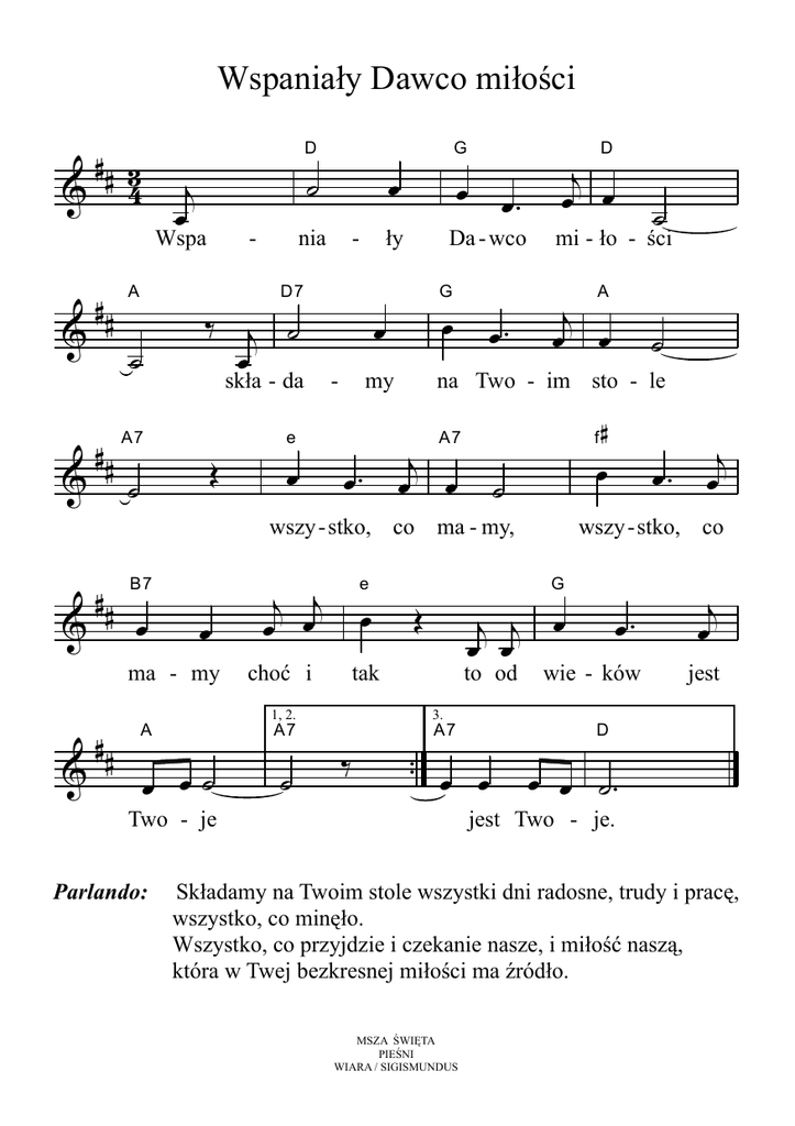 Wspaniały Dawco miłości # & # 43 D ˙ j œ Wspa & ## A - œ nia - ˙ skła - da # # A7 & ˙ Œ e œ G œ œ. j œ œ j œ œ A j œ œ A7 f & B7 œ œ ma - my & ## A œ œ˙ j j œ œ e œ choć i Œ ˙ to od 3. A7 A7 .. œ œ Two - je Parlando: œ. j œ wszy-stko, co œ. j œ wie - ków jest j j œ œ œ tak ‰ # G 1, 2. ˙ ˙ œ wszy-stko, co ma - my, ## ˙ mi - ło - ści na Two - im sto - le my œ. œ. Da - wco œ - D œ ły D7 ‰ j ˙ œ G D œ œ ˙. jest Two - je. Składamy na Twoim stole wszystki dni radosne, trudy i pracę, wszystko, co minęło. Wszystko, co przyjdzie i czekanie nasze, i miłość naszą, która w Twej bezkresnej miłości ma źródło. MSZA ŚWIĘTA PIEŚNI WIARA / SIGISMUNDUS