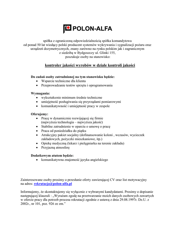 spółka z ograniczoną odpowiedzialnością spółka komandytowa od ponad 50 lat wiodący polski producent systemów wykrywania i sygnalizacji pożaru oraz urządzeń dozymetrycznych, znany zarówno na rynku polskim jak i zagranicznym z siedzibą w Bydgoszczy ul. Glinki 155, poszukuje osoby na stanowisko: kontroler jakości wyrobów w dziale kontroli jakości Do zadań osoby zatrudnionej na tym stanowisku będzie: Wsparcie techniczne dla klienta Przeprowadzanie testów sprzętu i oprogramowania Wymagania: wykształcenie minimum średnie techniczne umiejętność posługiwania się przyrządami pomiarowymi komunikatywność i umiejętność pracy w zespole Oferujemy: Pracę w dynamicznie rozwijającej się firmie (najwyższa technologia – najwyższa jakość) Stabilne zatrudnienie w oparciu o umowę o pracę Praca od poniedziałku do piątku Atrakcyjny pakiet socjalny (dofinansowanie koloni , wczasów, wycieczek zakładowych, pożyczki mieszkaniowe, itp.) Opiekę medyczną (lekarz i pielęgniarka na terenie zakładu) Przyjazną atmosferę Dodatkowym atutem będzie: komunikatywna znajomość języka angielskiego Zainteresowane osoby prosimy o przesłanie oferty zawierającej CV oraz list motywacyjny na adres: [email protected] Informujemy, że skontaktujemy się wyłącznie z wybranymi kandydatami. Prosimy o dopisanie następującej klauzuli : „Wyrażam zgodę na przetwarzanie moich danych osobowych zawartych w ofercie pracy dla potrzeb procesu rekrutacji zgodnie z ustawą z dnia 29.08.1997r. Dz.U. z 2002r., nr 101, poz. 926 ze zm.”