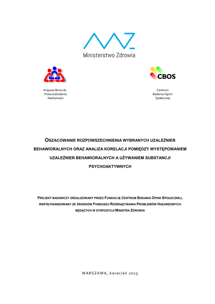 Krajowe Biuro ds. Przeciwdziałania Narkomanii Centrum Badania Opinii Społecznej OSZACOWANIE ROZPOWSZECHNIENIA WYBRANYCH UZALEŻNIEŃ BEHAWIORALNYCH ORAZ ANALIZA KORELACJI POMIĘDZY WYSTĘPOWANIEM UZALEŻNIEŃ BEHAWIORALNYCH A UŻYWANIEM SUBSTANCJI PSYCHOAKTYWNYCH PROJEKT BADAWCZY ZREALIZOWANY PRZEZ FUNDACJĘ CENTRUM BADANIA OPINII SPOŁECZNEJ, WSPÓŁFINANSOWANY ZE ŚRODKÓW FUNDUSZU ROZWIĄZYWANIA PROBLEMÓW HAZARDOWYCH BĘDĄCYCH W DYSPOZYCJI MINISTRA ZDROWIA WARSZAWA, kwiecień 2015 Znak jakości przyznany CBOS przez Organizację Firm Badania Opinii i Rynku PRA R CY ANK IETE RSK IEJ GWA RAN CJA JAKO ŚCI 9 stycznia 2015 roku Spis treści INFORMACJA O PROJEKCIE BADAWCZYM..................................................................................................... 5 CZĘŚĆ I ROZPOWSZECHNIENIE WYBRANYCH UZALEŻNIEŃ BEHAWIORALNYCH I ICH ZWIĄZEK Z UŻYWANIEM SUBSTANCJI PSYCHOAKTYWNYCH ................................................... 7 STRESZCZENIE .......................................................................................................................................... 9 WPROWADZENIE ...................................................................................................................................... 14 METODOLOGIA ........................................................................................................................................ 21 Dobór próby ....................................................................................................................................... 25 Metoda badawcza ............................................................................................................................. 27 Poziom realizacji i ważenie wyników ................................................................................................. 28 Zastosowane procedury kontroli ...................................................................................................... 31 WYNIKI .................................................................................................................................................... 35 1. HAZARD .............................................................................................................................................. 37 1.1. Portret społeczno-demograficzny graczy ................................................................................... 37 1.1.1. Zagrożenie uzależnieniem od hazardu .................................................................................. 49 1.1.2. Zróżnicowania społeczno-demograficzne uzależnienia od hazardu ...................................... 50 1.2. Poziom ryzyka uzależnienia a rodzaj uprawianych gier na pieniądze ....................................... 61 1.3. Przyczyny grania ........................................................................................................................ 64 1.3.1. Duża wygrana i jej przeznaczenie .......................................................................................... 66 1.4. Percepcja problemu uzależnienia .............................................................................................. 68 1.4.1. Potencjał uzależniający poszczególnych gier ........................................................................ 69 1.5. Rozumienie terminów „hazard” i „hazardzista” ........................................................................... 72 1.5.1. Reakcja otoczenia na grę ....................................................................................................... 74 1.5.2. Autodefinicja graczy ............................................................................................................... 75 1.6. Czynniki ryzyka i czynniki chroniące przed patologicznym hazardem ....................................... 76 1.7. Oszacowanie liczby osób uprawiających patologiczny hazard .................................................. 77 2. PRACA ................................................................................................................................................ 82 2.1. Zasięg zjawiska .......................................................................................................................... 82 2.2. Zagrożenie uzależnieniem od pracy a wiek ............................................................................... 83 2.3. Zagrożenie uzależnieniem od pracy a płeć ............................................................................... 86 2.4. Zagrożenie uzależnieniem od pracy a aktywność zawodowa................................................... 88 2.5. Zagrożenie uzależnieniem od pracy a motywacje do pracy....................................................... 94 2.6. Zagrożenie uzależnieniem od pracy w opinii otoczenia ........................................................... 100 2.7. Zagrożenie uzależnieniem od pracy a skłonność do innych uzależnień behawioralnych ...... 102 3. INTERNET .......................................................................................................................................... 106 3.1. Zasięg zjawiska ........................................................................................................................ 106 3.3. Zagrożenie uzależnieniem od Internetu a wiek ........................................................................ 107 3.3. Zagrożenie uzależnieniem od Internetu a płeć......................................................................... 110 3.4. Zagrożenie uzależnieniem od Internetu a miejsce zamieszkania ............................................ 111 3.5. Zagrożenie uzależnieniem od Internetu a czas spędzany w sieci i sposób łączenia .............. 113 3.6. Zagrożenie uzależnieniem od Internetu a rodzaje aktywności prowadzonej w sieci ............... 115 3.7. Zagrożenie uzależnieniem od Internetu a nawiązywanie r