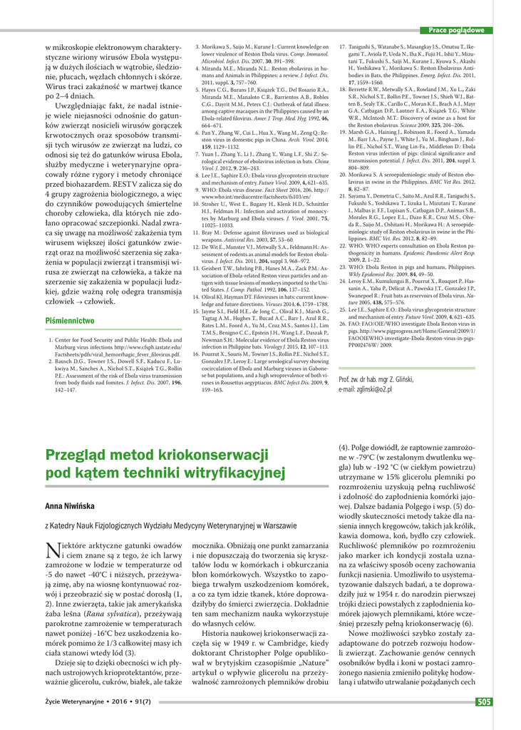 Prace poglądowe w mikroskopie elektronowym charakterystyczne wiriony wirusów Ebola występują w dużych ilościach w wątrobie, śledzionie, płucach, węzłach chłonnych i skórze. Wirus traci zakaźność w martwej tkance po 2–4 dniach. Uwzględniając fakt, że nadal istnieje wiele niejasności odnośnie do gatunków zwierząt nosicieli wirusów gorączek krwotocznych oraz sposobów transmisji tych wirusów ze zwierząt na ludzi, co odnosi się też do gatunków wirusa Ebola, służby medyczne i weterynaryjne opracowały różne rygory i metody chroniące przed biohazardem. RESTV zalicza się do 4 grupy zagrożenia biologicznego, a więc do czynników powodujących śmiertelne choroby człowieka, dla których nie zdołano opracować szczepionki. Nadal zwraca się uwagę na możliwość zakażenia tym wirusem większej ilości gatunków zwierząt oraz na możliwość szerzenia się zakażenia w populacji zwierząt i transmisji wirusa ze zwierząt na człowieka, a także na szerzenie się zakażenia w populacji ludzkiej, gdzie ważną rolę odegra transmisja człowiek → człowiek. Piśmiennictwo 1.Center for Food Security and Public Health: Ebola and Marburg virus infections http://www.cfsph.iastate.edu/ Factsheets/pdfs/viral_hemorrhagic_fever_filovirus.pdf. 2.Bausch D.G., Towner J.S., Dowell S.F., Kaducu F., Lukwiya M., Sanches A., Nichol S.T., Książek T.G., Rollin P.E.: Assessment of the risk of Ebola virus transmission from body fluids nad fomites. J. Infect. Dis. 2007, 196, 142–147. 3. Morikawa S., Saijo M., Kurane I.: Current knowledge on lower virulence of Reston Ebola virus. Comp. Immunol. Microbiol. Infect. Dis. 2007, 30, 391–398. 4.Miranda M.E., Miranda N.L.: Reston ebolavirus in humans and Animals in Philippines: a review. J. Infect. Dis. 2011, suppl. 3, 757–760. 5. Hayes C.G., Burans J.P., Książek T.G., Del Rosario R.A., Miranda M.E., Manaloto C.R., Barrientos A.B., Robles C.G., Dayrit M.M., Peters C.J.: Outbreak of fatal illness among captive macaques in the Philippines caused by an Ebola-related filovirus. Amer. J. Trop. Med. Hyg. 1992, 46, 664–671. 6. Pan Y., Zhang W., Cui L., Hua X., Wang M., Zeng Q.: Reston virus in domestic pigs in China. Arch. Virol. 2014, 159, 1129–1132. 7. Yuan J., Zhang Y., Li J., Zhang Y., Wang L.F., Shi Z.: Serological evidence of ebolavirus infection in bats. China Virol. J. 2012, 9, 236–243. 8. Lee J.E., Saphire E.O.: Ebola virus glycoprotein structure and mechanism of entry. Future Virol. 2009, 4, 621–635. 9. WHO: Ebola virus disease. Fact Sheet 2016, 206, http:// www.who.int/mediacentre/factsheets/fs103/en/ 10.Stroher U., West E., Bugany H., Klenk H.D., Schnittler H.J., Feldman H.: Infection and activation of monocytes by Marburg and Ebola viruses. J. Virol. 2001, 75, 11025–11033. 11.Bray M.: Defense against filoviruses used as biological weapons. Antiviral Res. 2003, 57, 53–60. 12. De Wit E., Munster V.J., Metwally S.A., Feldmann H.: Assessment of rodents as animal models for Reston ebolavirus. J. Infect. Dis. 2011, 204, suppl 3, 968–972. 13. Geisbert T.W., Jahrling P.B., Hanes M.A., Zack P.M.: Association of Ebola-related Reston virus particles and antigen with tissue lesions of monkeys imported to the United States. J. Comp. Pathol. 1992, 106, 137–152. 14. Olival KJ, Hayman DT. Filoviruses in bats: current knowledge and future directions. Viruses 2014, 6, 1759–1788. 15. Jayme S.I., Field H.E., de Jong C., Olival K.J., Marsh G., Tagtag A.M., Hughes T., Bucad A.C., Barr J., Azul R.R., Rates L.M., Foord A., Yu M., Cruz M.S., Santos I.J., Lim T.M.S., Benigno C.C., Epstein J.H., Wang L.F., Daszak P., Newman S.H.: Molecular evidence of Ebola Reston virus infection in Philippine bats. Virology J. 2015, 12, 107–113. 16. Pourrut X., Souris M., Towner J.S., Rollin P.E., Nichol S.T., Gonzalez J.P., Leroy E.: Large serological survey showing cocirculation of Ebola and Marburg viruses in Gabonese bat populations, and a high seroprevalence of both viruses in Rousettus aegyptiacus. BMC Infect Dis. 2009, 9, 159–163. Przegląd metod kriokonserwacji pod kątem techniki witryfikacyjnej Anna Niwińska z Katedry Nauk Fizjologicznych Wydziału Medycyny Weterynaryjnej w Warszawie N iektóre arktyczne gatunki owadów i ciem znane są z tego, że ich larwy zamrożone w lodzie w temperaturze od -5 do nawet -40°C i niższych, przeżywają zimę, aby na wiosnę kontynuować rozwój i przeobrazić się w postać dorosłą (1, 2). Inne zwierzęta, takie jak amerykańska żaba leśna (Rana sylvatica), przeżywają parokrotne zamrożenie w temperaturach nawet poniżej -16°C bez uszkodzenia komórek pomimo że 1/3 całkowitej masy ich ciała stanowi wtedy lód (3). Dzieje się to dzięki obecności w ich płynach ustrojowych krioprotektantów, przeważnie glicerolu, cukrów, białek, ale także Życie Weterynaryjne • 2016 • 91(7) mocznika. Obniżają one punkt zamarzania i nie dopuszczają do tworzenia się kryształów lodu w komórkach i obkurczania błon komórkowych. Wszystko to zapobiega trwałym uszkodzeniom komórek, a co za tym idzie tkanek, które doprowadziłyby do śmierci zwierzęcia. Dokładnie ten sam mechanizm nauka wykorzystuje do własnych celów. Historia naukowej kriokonserwacji zaczęła się w 1949 r. w Cambridge, kiedy doktorant Christopher Polge opublikował w brytyjskim czasopiśmie „Nature” artykuł o wpływie glicerolu na przeżywalność zamrożonych plemników drobiu 17. Tanigushi S., Watanabe S., Masangkay J.S., Omatsu T., Ikegami T., Aviola P., Ueda N., Iha K., Fujii H., Ishii Y., Mizutani T., Fukushi S., Saiji M., Kurane I., Kyuwa S., Akashi H., Yoshikawa Y., Morikawa S.: Reston Ebolavirus Antibodies in Bats, the Philippines. Emerg. Infect. Dis. 2011, 17, 1559–1560. 18. Berrette R.W., Metwally S.A., Rowland J.M., Xu L., Zaki S.R., Nichol S.T., Rollin P.E., Towner J.S., Shieh W.J., Batten B., Sealy T.K., Carillo C., Moran K.E., Brach A.J., Mayr G.A, Catbagan D.P., Lautner E.A., Książek T.G.