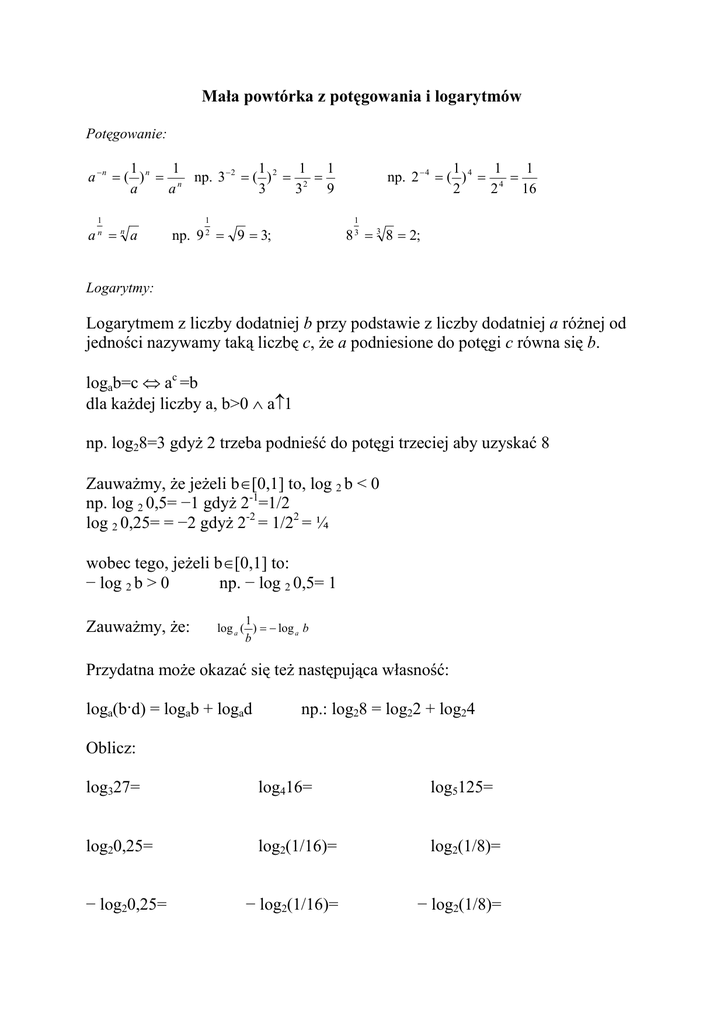 Mała powtórka z potęgowania i logarytmów Logarytmem z liczby