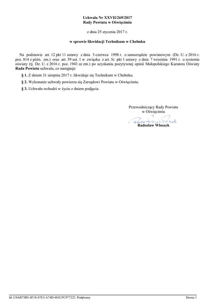 Uchwała Nr XXVII/269/2017 Rady Powiatu w Oświęcimiu z dnia 25 stycznia 2017 r. w sprawie likwidacji Technikum w Chełmku Na podstawie art. 12 pkt 11 ustawy z dnia 5 czerwca 1998 r. o samorządzie powiatowym (Dz. U. z 2016 r. poz. 814 z późn. zm.) oraz art. 59 ust. 1 w związku z art. 5c pkt 1 ustawy z dnia 7 września 1991 r. o systemie oświaty (tj. Dz. U. z 2016 r. poz. 1943 ze zm.) po uzyskaniu pozytywnej opinii Małopolskiego Kuratora Oświaty Rada Powiatu uchwala, co następuje: § 1. Z dniem 31 sierpnia 2017 r. likwiduje się Technikum w Chełmku. § 2. Wykonanie uchwały powierza się Zarządowi Powiatu w Oświęcimiu. § 3. Uchwała wchodzi w życie z dniem podjęcia. Przewodniczący Rady Powiatu w Oświęcimiu Radosław Włoszek Id: C0AB75B5-4F18-47E3-A74D-483CFC977222. Podpisany Strona 1 Uzasadnienie Likwidacja Technikum w Chełmku z dniem 31 sierpnia 2017 r. wynika z obserwowanego braku zainteresowania kształceniem w tej szkole, co skutkuje brakiem naboru uczniów w latach szkolnych 2014/2015, 2015/2016 oraz 2016/2017. W konsekwencji, wg stanu na dzień 1 września 2016 r., w Szkole nie kształci się żaden uczeń. Podjęcie niniejszej uchwały zostało poprzedzone podjęciem uchwały intencyjnej w związku z wymogiem art. 59 ust. 1 ustawy o systemie oświaty, zgodnie z którym organ prowadzący szkołę jest zobowiązany, co najmniej na sześć miesięcy przed terminem likwidacji, zawiadomić o zamiarze likwidacji szkoły właściwego kuratora oświaty. Małopolski Kurator Oświaty wydał postanowienie, w którym wyraził pozytywną opinię w sprawie zamiaru likwidacji Technikum w Chełmku. W związku z likwidacją w/w szkoły negatywną ocenę i sprzeciw wyraził Związek Nauczycielstwa Polskiego Zarząd Oddziału w Chełmku. Z uwagi na brak zainteresowania naborem uczniów na przestrzeni ostatnich lat, ilość uczniów w szkołach wchodzących w skład Powiatowego Zespołu Nr 8 Szkół Zawodowych i Ogólnokształcących im. Jana Kilińskiego w Chełmku sukcesywnie się zmniejszała. Wg stanu na dzień 1.09.2016 r. w Powiatowym Zespole Nr 8 nie kształci się żaden uczeń. Niekorzystną perspektywę demograficzną obrazują wieloletnie dane obejmujące: 1) planowane ilości uczniów kończących naukę w gimnazjach na terenie Gminy Chełmek: - w roku szkolnym 2015/2016 – 108, - w roku szkolnym 2016/2017 – 109, - w roku szkolnym 2017/2018 – 89, - w roku szkolnym 2018/2019 – 92, - w roku szkolnym 2019/2020 – 116, - w roku szkolnym 2020/2021 – 114, - w roku szkolnym 2021/2022 – 113, 2) liczbę urodzeń w Polsce w latach 2008-2014 oraz prognozy urodzeń do 2035 r. (nabory w szkołach ponadgimnazjalnych do roku szkolnego 2051/2052): Powyższe uwarunkowania są przyczyną długotrwałej, głębokiej niewspółmierności kosztów funkcjonowania ww. Zespołu Id: C0AB75B5-4F18-47E3-A74D-483CFC977222. Podpisany Strona 1 do zakresu prowadzonej działalności, co obrazuje poniższe zestawienie naliczonej subwencji i wykonania budżetu w poszczególnych latach: Liczba uczniów wg stanu na 31 września roku poprzedzającego Razem kwota naliczonej subwencji wg metryczki – zadania szkolne Wykonanie za rok (bez dotacji i środków pozyskanych z zewnątrz) Subwencja oświatowa minus wykonanie Rok 2011 Rok 2012 Rok 2013 Rok 2014 Rok 2015 296 234 199 148 116 1.586.517 zł 1.319.599 zł 1.255.573 zł 1.034.362 zł 848.084 zł 1.961.942,10 zł 1.843.959,64 zł 1.790.433,25 zł 1.623.573,86 zł 1.343.104 zł -375.425 zł -524.360,64 zł -534.860,25 zł -589.211,86 zł -495.020 zł Z uwagi na obecną i przewidywaną sytuację w zakresie naboru do Powiatowego Zespołu Nr 8 Szkół Zawodowych i Ogólnokształcących im. Jana Kilińskiego w Chełmku – wcześniejsza, malejąca tendencja oraz nieskuteczny nabór w latach szkolnych 2013/2014, 2014/2015 i 2016/2017 – racjonalną staje się likwidacja szkół wchodzących w skład PZ Nr 8 z dniem 31 sierpnia 2017 r. Id: C0AB75B5-4F18-47E3-A74D-483CFC977222. Podpisany Strona 2