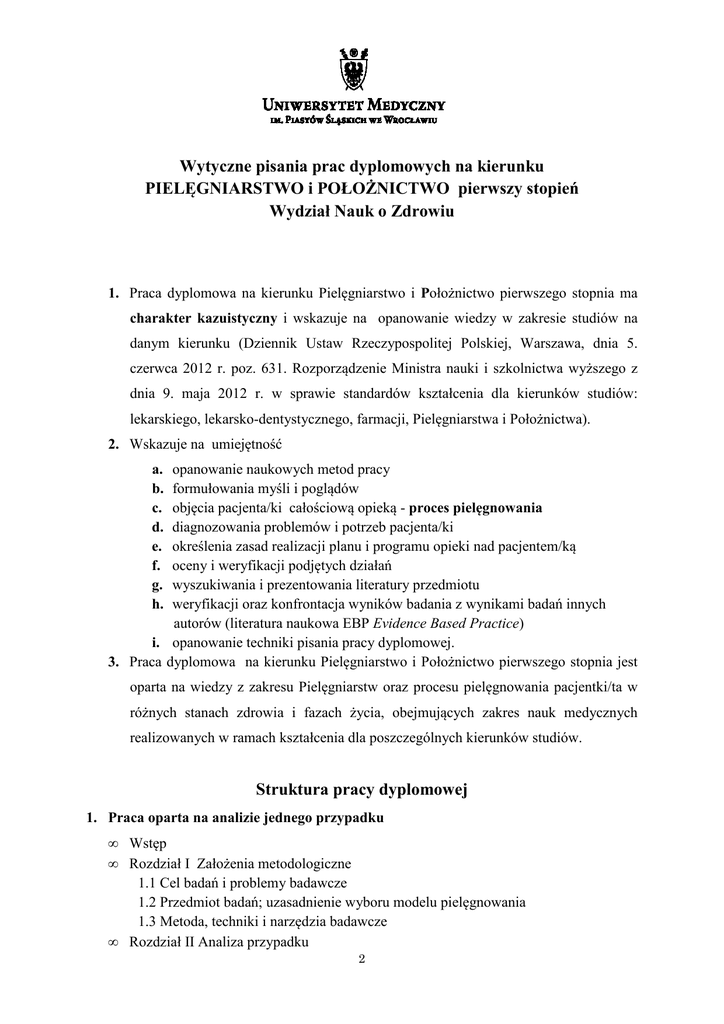 Wytyczne pisania prac dyplomowych na kierunku PIELĘGNIARSTWO i POŁOŻNICTWO pierwszy stopień Wydział Nauk o Zdrowiu 1. Praca dyplomowa na kierunku Pielęgniarstwo i Położnictwo pierwszego stopnia ma charakter kazuistyczny i wskazuje na opanowanie wiedzy w zakresie studiów na danym kierunku (Dziennik Ustaw Rzeczypospolitej Polskiej, Warszawa, dnia 5. czerwca 2012 r. poz. 631. Rozporządzenie Ministra nauki i szkolnictwa wyższego z dnia 9. maja 2012 r. w sprawie standardów kształcenia dla kierunków studiów: lekarskiego, lekarsko-dentystycznego, farmacji, Pielęgniarstwa i Położnictwa). 2. Wskazuje na umiejętność a. b. c. d. e. f. g. h. opanowanie naukowych metod pracy formułowania myśli i poglądów objęcia pacjenta/ki całościową opieką - proces pielęgnowania diagnozowania problemów i potrzeb pacjenta/ki określenia zasad realizacji planu i programu opieki nad pacjentem/ką oceny i weryfikacji podjętych działań wyszukiwania i prezentowania literatury przedmiotu weryfikacji oraz konfrontacja wyników badania z wynikami badań innych autorów (literatura naukowa EBP Evidence Based Practice) i. opanowanie techniki pisania pracy dyplomowej. 3. Praca dyplomowa na kierunku Pielęgniarstwo i Położnictwo pierwszego stopnia jest oparta na wiedzy z zakresu Pielęgniarstw oraz procesu pielęgnowania pacjentki/ta w różnych stanach zdrowia i fazach życia, obejmujących zakres nauk medycznych realizowanych w ramach kształcenia dla poszczególnych kierunków studiów. Struktura pracy dyplomowej 1. Praca oparta na analizie jednego przypadku • Wstęp • Rozdział I Założenia metodologiczne 1.1 Cel badań i problemy badawcze 1.2 Przedmiot badań; uzasadnienie wyboru modelu pielęgnowania 1.3 Metoda, techniki i narzędzia badawcze • Rozdział II Analiza przypadku 2 2.1 Opis przypadku 2.2 Problemy pielęgnacyjne • diagnoza pielęgniarska • cel działań • plan działań • uzasadnienie podjętych działań (w oparciu o literaturę, EBPN) • Podsumowanie • Dyskusja • Wnioski • Streszczenie • Bibliografia • Załączniki 2. Praca oparta na analizie porównawczej np. 2 przypadków • Wstęp • Rozdział I Założenia metodologiczne 1.2 Cel badań i problemy badawcze 1.3 Przedmiot badań, uzasadnienie wyboru modelu pielęgnowania 1.4 Metoda, techniki i narzędzia badawcze • Rozdział II Analiza przypadku I 2.1 Opis przypadku 2.3 Problemy pielęgnacyjne • diagnoza pielęgniarska • cel działań • plan działań • uzasadnienie podjętych działań (w oparciu o literaturę, EBPN) • Rozdział III Analiza przypadku II 3.1 Opis przypadku 3.2 Problemy pielęgnacyjne • diagnoza pielęgniarska • cel działań • plan działań • uzasadnienie podjętych działań (w oparciu o literaturę, EBPN) • Analiza porównawcza • Podsumowanie • Dyskusja • Wnioski • Streszczenie • Bibliografia • Załączniki 3. Tytuł pracy musi odzwierciedlać problemy przedstawione w pracy. Nie powinien być zbyt długi, możliwy do jednoznacznego zrozumienia i interpretacji np.: • Specyfika opieki nad…… 3 • Proces pielęgnowania pacjenta/ki z….. • Przebieg ciąży u kobiety z…… - analiza przypadku • Pielęgnowanie noworodka/pacjentki z………. • Analiza problemów zdrowotnych pacjenta/ki z … • Opieka nad pacjentem ze stwardnieniem rozsianym - opis przypadku 4. Spis treści musi zawierać wykaz wszystkich części pracy z podaniem strony, na której rozpoczyna się dana część. Musi być napisany w sposób przejrzysty z zaakcentowaniem poszczególnych części. 5. Każdy następny rozdział pracy rozpoczyna się na nowej stronie. 6. Wstęp powinien składać się z kilku – kilkunastu akapitów i powinien zajmować od 1. do kilku stron. Jest wprowadzeniem w badaną problematykę, krótką charakterystyką stanu badań w interesującym nas zakresie w oparciu o dostępną literaturę z wykorzystaniem EBP (Evidence Based Practice). Błędem jest opracowanie wstępu w postaci szczegółowego zaprezentowania tematu (praca poglądowa) czy kilku rozdziałowej części teoretycznej (praca magisterska). Do wiedzy teoretycznej z danego zakresu można odnieść się w dyskusji. Nie należy powtarzać identycznych informacji we wprowadzeniu jak i w dyskusji. 7. Cel pracy musi być jasno i bardzo dokładnie sprecyzowany, określony w punktach, w formie zdań twierdzących. Przykład Celem pracy jest zwrócenie uwagi na problem opieki nad kobietą ciężarną ze stwardnieniem rozsianym. Opisanie przebiegu diagnostyki i leczenia z uwzględnieniem powikłań położniczych oraz problemów diagnostycznych, terapeutycznych i pielęgnacyjnych. Celem pracy jest przedstawienie najważniejszych aspektów choroby w aspekcie sytuacji ciężarnej i zaproponowanie wieloaspektowej opieki. 8. Problemy badawcze powinny korelować z tematem pracy. Opracowane w formie pytań dopełnienia w sposób precyzyjny i jednoznaczny. Pytania dopełniające rozpoczynają się zwrotem: Jak… Jak jest.. Jaka… Gdzie… W jakim stopniu… Dlaczego….. Przykład • Jakie problemy pielęgnacyjne występują u kobiety ciężarnej ze stwardnieniem rozsianym? • Jaka jest specyfika opieki nad ciężarną ze stwardnieniem rozsianym? • W jakim stopniu stwardnienie rozsiane wpływa na stan psycho-społeczny ciężarnej? • Jaki rodzaj wsparcia oczekuje ciężarna ze stwardnieniem rozsianym? • Dlaczego rodząca ze stwardnieniem rozsianym wymaga szczególnego wsparcia ze strony położnej? 9. W badaniach jakościowych (praca kazuistyczna) nie precyzuje się hipotez naukowych. Hipotezy ukierunkowują, utrudniając proces odkrywania nowych przypuszczeń, aspektów danego zagadnienia. 10. Przedmiot badań polega na wskazaniu obiektów i zjawisk, o których chcemy formułować sądy w procesie badania, przy czym przedmiotem badania są owe przedmioty i zjawiska. Przykład • Przedmiotem badań jest proces diagnostyczno-terapeutyczny i pielęgnacyjny kobiety ciężarnej ze stw
