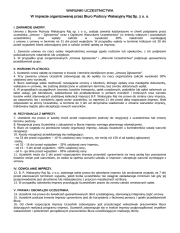 WARUNKI UCZESTNICTWA W imprezie organizowanej przez Biuro PodroŜy Podro y Wakacyjny Raj Sp. z o. o. I. ZAWARCIE UMOWY. Umowa z Biurem PodroŜy Wakacyjny Raj sp. z o o., zostaje zawarta kaŜdorazowo w chwili podpisania przez uczestnika „Umowy – Zgłoszenia” wraz z Ogólnymi Warunkami Uczestnictwa” (w imieniu własnym i pozostałych uczestników) oraz wpłaty zaliczki w wysokości 30% naleŜności wynikającej z umowy z umowy w terminie na 31 dni przed wyjazdem. W przypadku wpłaty w terminie krótszym niŜ 30 dni przed wyjazdem klient zobowiązany jest w całości wnieść opłatę za imprezę. 1. Zawarcie umowy na rzecz osoby niepełnoletniej wymaga zgody rodziców lub opiekunów, z ich podpisami poświadczonymi notarialnie lub urzędowo. 2. W przypadku grup zorganizowanych „Umowa Zgłoszenie” i „Warunki Uczestnictwa” podpisuje upowaŜniony przedstawiciel grupy. II. WARUNKI PŁATNO P ATNOŚCI. ATNO CI. 3. Uczestnik wnosi opłatę za imprezę w kwocie i terminie określonym przez „Umowę Zgłoszenie”. 4. Przy zawarciu umowy Uczestnik zobowiązuje się do wpłaty na rzecz organizatora zaliczki wysokości 30% ustalonej ceny wycieczki. 5. Biuro zastrzega sobie moŜliwość rozwiązania umowy z klientem, którego wpłaty oraz niezbędne dokumenty, wskazane w umowie, nie zostaną dostarczone w ustalonym terminie, bez zwrotu dokonanych wpłat. 6. W przypadkach szczególnych (wzrostu kosztów transportu, opłat urzędowych, podatków lub opłat naleŜnych za takie usługi, jak lotniskowe, załadunkowe lub przeładunkowe w portach morskich i lotniczych oraz wzrostu kursów walut stanowiących podstawę kalkulacji imprezy) B.P. Wakacyjny Raj ma prawo do zmiany ceny imprezy, po zapoznaniu się i wyraŜeniu zgody przez uczestnika, co najmniej 21 dni przed datą rozpoczęcia imprezy. Brak odpowiedzi ze strony Uczestnika, w terminie do 3 dni od otrzymania wiadomości o zmianie warunków imprezy, traktowany będzie jako akceptacja nowych warunków. III. REZYGNACJA Z IMPREZY. 7. Uczestnik ma prawo w kaŜdej chwili przed rozpoczęciem podroŜy do rezygnacji z uczestnictwa lub zmiany terminu podroŜy. 8. Rezygnacja przez Uczestnika z zakupionej w Burze imprezy wymaga pisemnego oświadczenia. 9. Biuro ze względu na poniesione koszty organizacji imprezy, zakupu świadczeń u kontrahentów ustala warunki rezygnacji. 10. Koszty rezygnacji przedstawiają się następująco: - na 33 dni przed wyjazdem – 10 % ustalonej ceny imprezy, nie mniej niŜ 150 zł od kaŜdej zgłoszonej osoby, - od 32 - 16 dni przed wyjazdem - 35% ustalonej ceny imprezy, - od 15 - 4 dni przed wyjazdem - 60% ustalonej ceny, - od 4 - go dnia przed wyjazdem - 95% ustalonej ceny. 11. Uczestnik moŜe do 2 dni przed rozpoczęciem imprezy przenieść uprawnienia na inną osobę bez ponoszenia kosztów zmian pod warunkiem, Ŝe osoba ta spełnia warunki udziału w imprezie i akceptuje warunki wynikające z umowy. IV. ODWOŁANIE ODWO ANIE IMPREZY. 12. B. P. Wakacyjny Raj Sp. z o.o. zastrzega sobie prawo do odwołania imprezy lub anulowania wyjazdu na 7 dni przed planowanym terminem wyjazdu, jeŜeli liczba uczestników nie osiągnie zakładanego minimum lub gdy jej przeprowadzenie jest utrudnione lub niebezpieczne z przyczyn niezaleŜnych od Biura. 13. W przypadku odwołania imprezy przysługuje Uczestnikom prawo do zwrotu całości wniesionych opłat. V. PRAWA I OBOWIĄZKI OBOWI ZKI UCZESTNIKA. 14. Uczestnik ma prawo do świadczeń gwarantowanych ofert ą katalogową, stanowiącą integralną część umowy. 15. Uczestnik podczas trwania imprezy uprawniony jest do korzystania z fachowej pomocy i opieki przedstawicieli Biura. 16. Od chwili rozpoczęcia imprezy Uczestnik zobowiązany jest przestrzegać wskazówek pracowników Biura dotyczących realizacji programu imprezy. Uczestnik zobowiązuje się w trakcie imprezy podporządkować wszelkim wskazówkom i poleceniom porządkowym pracowników Biura umoŜliwiającym realizację oferty. 17. Niewykorzystanie winy uczestnika, któregokolwiek ze świadczeń nie uprawnia do Ŝądania zwrotu zapłaconej kwoty ani Ŝadnej jej części. 18. Uczestnik ponosi odpowiedzialność odszkodowawczą za wszelkie szkody wyrządzone z jego winy na przedmiotach naleŜących do Biura, innych uczestników, hoteli, firm przewozowych itp. Za szkody wyrządzone przez osoby niepełnoletnie odpowiadają jego rodzice lub ustawowi przedstawiciele. Uczestnik powinien pokryć szkodę na miejscu jej powstania , a w przypadku braku funduszy niezwłocznie po powrocie do kraju. 19. Uczestnik zobowiązany jest do posiadania dokumentów podroŜ (paszportu) oraz gdy wymagają tego przepisy – wiz turystycznych oraz innych dokumentów. 20. Uczestnik zobowiązany jest do uiszczenia wszystkich rachunków i opłat do jakich zobowiązał się na miejscu pobytu oraz podczas podroŜy np. kaucje, opłaty za hotelowy rachunek telefoniczny, korzystanie z mini baru hotelowego, opłaty dotyczące wszystkich innych odpłatnych usług hotelowych. 21. W razie raŜącego lub uporczywego naruszania przez Uczestnika ustalonego porządku imprezy, zagracającego interesom innych Uczestników, Biuro moŜe rozwiązać umowę w trybie natychmiastowym. Wszelkie koszty dalszego pobytu za granicą oraz powrotu do kraju obciąŜają w takim przypadku nie stosującego się do ustalonego przez Biuro porządku imprezy, Uczestnika. 22. Wszelkie sporne sprawy będą rozstrzygane w terminie do 7 dni od zakończenia imprezy. 23. W przypadku wystąpienia uchybień w realizacji imprezy oraz braku propozycji zastępczych o równorzędnych cenach i równorzędnej jakości Uczestnikowi przysługuje prawo do reklamacji. Uczestnik moŜe domagać się rekompensaty jedynie w odpowiednim stosunku i proporcji, świadczeń niezrealizowanych od wartości całej imprezy. Niezrealizowane świadczenia będą podlegać wycenie. Reklamacje naleŜy złoŜyć w formie pisemnej do 30 dni od zakończenia imprezy. Biuro zastrzega sobie 30 dniowy termin na rozpatrzenie