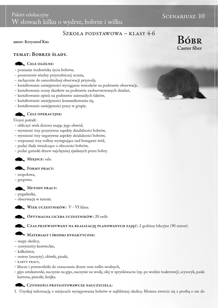 Scenariusz 10 Szkoła podstawowa – klasy 4-6 autor: Krzysztof Kus temat: Bobrze ślady. Cele ogólne: ‒‒poznanie środowiska życia bobrów, ‒‒poszerzenie wiedzy przyrodniczej ucznia, ‒‒zachęcenie do samodzielnej obserwacji przyrody, ‒‒kształtowanie umiejętności wyciągania wniosków na podstawie obserwacji, ‒‒kształtowanie oceny skutków na podstawie zaobserwowanych działań, ‒‒kształtowanie opinii na podstawie zaistniałych faktów, ‒‒kształtowanie umiejętności komunikowania się, ‒‒kształtowanie umiejętności pracy w grupie. Cele operacyjne: Uczeń potrafi: ‒‒obliczyć wiek drzewa znając jego obwód, ‒‒wymienić trzy pozytywne aspekty działalności bobrów, ‒‒wymienić trzy negatywne aspekty działalności bobrów, ‒‒rozpoznać trzy rośliny występujące nad brzegami wód, ‒‒podać ślady świadczące o obecności bobrów, ‒‒podać gatunki drzew najchętniej zjadanych przez bobry. Miejsce: sala. Formy pracy: ‒‒zespołowa, ‒‒grupowa. Metody pracy: ‒‒pogadanka, ‒‒obserwacja w terenie. Wiek uczestników: V - VI klasa. Optymalna liczba uczestników: 20 osób. Czas przewidywany na realizację planowanych zajęć: 2 godziny lekcyjne (90 minut). Materiały i środki dydaktyczne: ‒‒mapy okolicy, ‒‒centymetry krawieckie, ‒‒kalkulator, ‒‒notesy (zeszyty), ołówki, pisaki, ‒‒karty pracy, ‒‒klucze i przewodniki do oznaczania drzew oraz roślin wodnych, ‒‒gips sztukatorski, naczynie na gips, naczynie na wodę, olej w spryskiwaczu (np. po wodzie toaletowej), scyzoryk, paski kartonu, pinezki, linijka. Czynności przygotowawcze nauczyciela: 1. Uzyskaj informację o miejscach występowania bobrów w najbliższej okolicy. Możesz zwrócić się z prośbą o nie do Pakiet edukacyjny - W słowach kilku o wydrze, bobrze i wilku Szkoła podstawowa najbliższego wydziału ochrony środowiska urzędu gminy lub miasta, nadleśnictwa, Regionalnej Dyrekcji Ochrony Środowiska. 2. Na podstawie mapy i wcześniejszego rekonesansu zaplanuj trasę wycieczki wzdłuż rzeki, potoku, rowu melioracyjnego lub brzegu jeziora. Wyznacz punkty, na których będą realizowane poszczególne zadania i nanieś je na mapę. Zwróć uwagę na bezpieczeństwo dzieci nad wodą i staraj się nie wyznaczać miejsc w najbliższym sąsiedztwie cieku wodnego. 3. Przygotuj komplety kart pracy oraz materiałów dydaktycznych dla każdej z grup biorących udział w zajęciach. 4. Trasę i punkty nanieś na mapy, które będą rozdawane grupom uczniów pracujących w terenie. 5. Dzień przed planowaną wycieczką przejdź trasę, sprawdzając panujące na niej warunki. 6. Przed rozpoczęciem wycieczki omów z dziećmi zasady bezpiecznego zachowania się nad wodą. Poleć poruszać się wzdłuż rzeki zwartą grupą, zachowując ciszę. Przebieg zajęć: A. Faza wstępna zajęć: 1. Zaproś klasę na wędrówkę śladami bobrów. Celem naszej wycieczki będzie poznanie środowiska życia bobrów. Śladami nazywane są wszelkie pozostałości po aktywności zwierząt, a więc będą nimi zarówno nadgryziony orzech, jak i tropy, czyli na przykład odciśnięta w błocie łapa bobra. W miejscach bytowania bobrów odnajdziemy wiele śladów ich działalności. Będą to zgryzy bobrowe, czyli ukośnie ścięte gałęzie, powalone drzewa liściaste, liczne wióry, ścieżki prowadzące w głąb lądu, zejścia do wody z brzegu, nory, a także tamy i żeremia. Samych bobrów najczęściej nie zobaczymy, bowiem są to zwierzęta czujne i płochliwe, prowadzące raczej nocny tryb życia. 2. Podziel klasę na grupy cztero- lub pięcioosobowe. Każdej grupie przekaż mapę z wyznaczoną trasą i punktami oraz komplet materiałów dydaktycznych i kart pracy. Omów przebieg trasy i charakterystyczne topograficznie miejsca, np. most, kościół, ujście potoku. 3. Poruszając się wzdłuż cieku wodnego grupy powinny wypatrywać śladów bobrów w postaci pływających obgryzionych gałęzi lub powalonych drzew. W wypadku mniejszych strumieni można napotkać tamę piętrzącą wodę lub żeremie, będące bobrzym schronieniem. W większych rzekach w celu ukrycia się bobry wykopują nory. 4. W wypadku odnalezienia śladów bobrów przed punktem ćwiczeń, omów ich rodzaj, sposób powstawania, znaczenie. Po dotarciu na pierwszy punkt ćwiczeń zatrzymaj klasę i poproś o chwilę uwagi. B. Ćwiczenia Punkt nr 1. Obliczamy wiek drzew. 1. Wyjaśnij rolę drzew w diecie bobrów (dodatkowe informacje na ten temat można odnaleźć w scenariuszu nr 2). Nie zjadają one drewna a jedynie korę, łyko i liście. Powalenie drzewa o dużych rozmiarach wymaga od tych zwierząt wiele czasu i wysiłku, a długie przebywanie na lądzie jest dla nich niebezpieczne. Dlatego, jeśli mają taką możliwość, wybierają jako pokarm krzewy i młode drzewa, które są w stanie szybko przetransportować do wody. Starsze okazy drzew są podgryzane najczęściej jesienią, gdy bobry muszą zgromadzić odpowiednią ilość gałęzi w podwodnej spiżarni. 2. Posługując się kluczem do oznaczania drzew postaraj się wraz z uczestnikami wycieczki, rozpoznać drzewa rosnące w najbliższym sąsiedztwie rzeki. Będą to głównie wierzby, topole, brzozy i olsze. Oglądając pniaki po drzewach ściętych przez bobry, postarajcie się stwierdzić, jaki gatunek drzew jest przez nie preferowany i najczęściej zjadany. 3. Poproś, aby każda z grup wybrała sobie jedno drzewo, jeszcze nieścięte przez bobry, i za pomocą centymetra zmierzyła jego obwód. Dzieci powinny dokonać pomiaru na wysokości tzw. pierśnicy, czyli około 130 cm od ziemi. Posługując się kalkulatorem oraz wzorem: średnica pnia = obwód pnia podzielony przez 3,1416 ‒‒ustal przybliżoną średnicę drzew. Posługując się tabelą zamieszczoną w materiałach dydaktycznych nr 1, określ wiek drzewa na podstawie średnicy pnia. Poproś, aby dzieci w notesach (zeszytach) odnotowały średni
