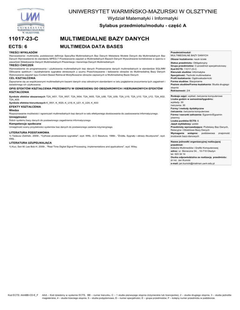 UNIWERSYTET WARMIŃSKO-MAZURSKI W OLSZTYNIE Wydział Matematyki i Informatyki Sylabus przedmiotu/modułu - część A 11017-23-C MULTIMEDIALNE BAZY DANYCH ECTS: 6 MULTIMEDIA DATA BASES TREŚCI WYKŁADÓW Wprowadzenie: multimedia, podstawowe definicje Specyfika Multimedialnych Baz Danych Metadane Modele Danych dla Multimedialnych Baz Danych Wprowadzenie do standardu MPEG-7 Przetwarzanie zapytań w Multimedialnych Bazach Danych Wyszukiwanie kontekstowe w oparciu o zawartość Składowanie Danych Multimedialnych Prezentacja i transmisja Danych Multimedialnych TREŚCI ĆWICZEŃ Wprowadzenie do programowania i użytkowania multimedialnych baz danych Przetwarzanie danych multimedialnych w standardzie SQL/MM Obliczanie spektrum i wyodrębnianie sygnałów okresowych z szumu Przechowywanie i ładowanie obrazów do Multimedialnej Bazy Danych Wykonywanie zapytań typu Content Based Retrieval Modyfikowanie obrazów zapisanych w Multimedialnej Bazie Danych CEL KSZTAŁCENIA Zapoznanie się ze współczesnymi multimedialnymi bazami danych oraz odnośnymi standardami w celu pogłębienia zrozumienia tych zagadnień i świadomego ich użytkowania. OPIS EFEKTÓW KSZTAŁCENIA PRZEDMIOTU W ODNIESIENIU DO OBSZAROWYCH I KIERUNKOWYCH EFEKTÓW KSZTAŁCENIA Symbole efektów obszarowych T2A_W01, T2A_W07, T2A_W04, T2A_W05, T2A_U08, T2A_U09, T2A_U15, T2A_U10, T2A_U12, T2A_K02, T2A_K05 Symbole efektów kierunkowych K_W01, K_W20, K_U18, K_U21, K_U24, K_K03 EFEKTY KSZTAŁCENIA Wiedza Rozpoznawanie możliwości i ograniczeń multimedialnych baz danych w celu efektywnego dostosowania do zastosowania informatycznego. Umiejętności Dobór systemu bazy danych do postawionego zagadnienia informatycznego Kompetencje społeczne Umiejętność oceny przydatności systemów baz danych do postawionego zadania inżynieryjnego. LITERATURA PODSTAWOWA 1) Tadeusz Zieliński, 2009r., "Cyfrowe przetwarzanie sygnałów", wyd. WKŁ, 2) C Basztura, 1988r., "Źródła, Sygnały i obrazy Akustyczne", wyd. WKŁ . LITERATURA UZUPEŁNIAJĄCA 1) Kuo, Sen M; Lee Bob H, 2006r., "Real Time Digital Signal Processing, implementations and applications", wyd. Wiley. Kod ECTS: AAABB-CD-E_F Przedmiot/moduł: MULTIMEDIALNE BAZY DANYCH Obszar kształcenia: nauki ścisłe Status przedmiotu: Obligatoryjny Grupa przedmiotów: C-przedmiot specjalnościowy Kod ECTS: 11017-23-C Kierunek studiów: Informatyka Specjalność: Techniki multimedialne Profil kształcenia: Ogólnoakademicki Forma studiów: Stacjonarne Poziom studiów/Forma kształcenia: Studia drugiego stopnia Rok/semestr: 2/4 Rodzaje zajęć: wykład, ćwiczenia komputerowe Liczba godzin w semestrze/tygodniu: wykłady: 30 ćwiczenia: 30 Formy i metody dydaktyczne ćwiczenia: ćwiczenia komputerowe Forma i warunki zaliczenia: Egzamin/Egzamin pisemny Liczba punktów ECTS: 6 Język wykładowy: polski Przedmioty wprowadzające: Podstawy Baz Danych, Relacyjne i Obiektowe Bazy Danych Wymagania wstępne: podstawowa znajomość środowisk bazo-danowych Nazwa jednostki organizacyjnej realizującej przedmiot: Katedra Multimediów i Grafiki Komputerowej adres: ul. Słoneczna 54, , 10-710 Olsztyn tel. 523 34 14 Osoba odpowiedzialna za realizację przedmiotu: dr inż. Jan Kunicki e-mail: [email protected] AAA – Kod dziedziny w systemie ECTS, BB – numer kierunku, C – 1 studia pierwszego stopnia (inżynierskie lub licencjackie), 2 – studia drugiego stopnia, 3 – studia jednolite magisterskie, 4 – studia trzeciego stopnia, 5 – studia podyplomowe, D – numer specjalności, E – grupa przedmiotów, F – kolejny numer przedmiotu w podzbiorze. Szczegółowy opis przyznanej punktacji ECTS - część B MULTIMEDIALNE BAZY DANYCH ECTS: 6 MULTIMEDIA DATA BASES Na przyznaną liczbę punktów ECTS składają się : 1. Godziny kontaktowe z nauczycielem akademickim: - Wykłady 30,0 godz. - Ćwiczenia w pracowni komputerowej 30,0 godz. - Konsultacje 10,0 godz. - Egzamin i omówienie wyników 10,0 godz. 80,0 godz. 2. Samodzielna praca studenta: - Przygotowanie do wykładów 20,0 godz. - Przygotowanie do kolokwium 20,0 godz. - Przygotowanie do egzaminu 20,0 godz. - Przygotowanie do ćwiczeń 10,0 godz. 70,0 godz. godziny kontaktowe + samodzielna praca studenta OGÓŁEM: 150,0 godz. 1 punkt ECTS = 25,00 godz. pracy przeciętnego studenta, liczba punktów ECTS = 150,00 godz.: 25,00 godz./ECTS = 6,00 ECTS w zaokrągleniu: 6 ECTS - w tym liczba punktów ECTS za godziny kontaktowe z bezpośrednim udziałem nauczyciela akademickiego - 3,20 punktów ECTS, - w tym liczba punktów ECTS za godziny realizowane w formie samodzielnej pracy studenta - 2,80 punktów ECTS. Kod ECTS: AAABB-CD-E_F AAA – Kod dziedziny w systemie ECTS, BB – numer kierunku, C – 1 studia pierwszego stopnia (inżynierskie lub licencjackie), 2 – studia drugiego stopnia, 3 – studia jednolite magisterskie, 4 – studia trzeciego stopnia, 5 – studia podyplomowe, D – numer specjalności, E – grupa przedmiotów, F – kolejny numer przedmiotu w podzbiorze.