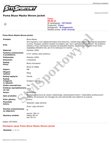 Informacje o produkcie Utworzono 07-03-2017 Puma Bluza Męska Woven Jacket Cena : 89,99 zł Nr katalogowy : 50734201 Producent : Puma Dostępność : W magazynie Średnia ocena : brak recenzji Puma Bluza Męska Woven Jacket Bluza Męska Krój: Krój regularny czyli najpopularniejszy krój klasyczny, codziennego użytku. Najczęściej spotykany na ulicy. Pasujący zarówno osobom szczupłym, jak i tym o pełniejszych kształtach. Do produkcji odzieży o kroju normalnym używane są wszystkie tkaniny. Na wieszaku modele w tym kroju wyglądają dokładnie tak, jak na to wskazuje ich rozmiar. Materiał: Poliester 100% Systemy zastosowane w produktcie: U.S.P. (zobacz opis systemu) Podszewka: Poliester 100% Kieszenie: 2 kieszenie Rodzaj bluzy: Bluza rozsuwana NIE Długość rękawa: Długi Rodzaj zapięcia: Zamek Rodzaj ściągacza w rękawie: Siatka wewnętrzna: y. lS p Kaptur: or to w Bluza ze stójką pl Produkt: Ściągacz z gumy TAK Sezon: St y Kolekcja zaprojektowana 2013 na rok: Jesień/Zima Opis produktu: Bluza przeznaczona do użytku codziennego. Zastosowanie tkanin i materiałów syntetycznych sprawia, że tworzywo nie rozciąga się, jest wytrzymałe oraz odporne na zużycie. Kolor główny: Czarny Pozostałe kolory: Niebieski i jego odcienie Szary i jego odcienie Rozmiar prezentowany na zdjęciach: M Wymiary modela: wzrost: 184 cm klatka: 99 cm pas: 83 cm Indeks: 50734201 Dostępne opcje Puma Bluza Męska Woven Jacket Rozmiar: L, M, XL. Wygenerowano w programie www.oscGold.com