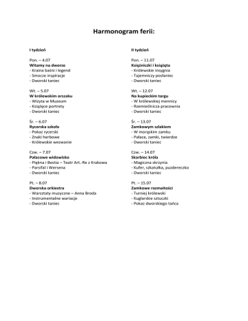 Harmonogram ferii: I tydzień II tydzień Pon. – 4.07 Witamy na dworze - Kraina baśni i legend - Smocze inspiracje - Dworski taniec Pon. – 11.07 Księżniczki i książęta - Królewskie insygnia - Tajemniczy posłaniec - Dworski taniec Wt. – 5.07 W królewskim orszaku - Wizyta w Muzeum - Książęce portrety - Dworski taniec Wt. – 12.07 Na kupieckim targu - W królewskiej mennicy - Rzemieślnicza pracownia - Dworski taniec Śr. – 6.07 Rycerska szkoła - Pokaz rycerski - Znaki herbowe - Królewskie wezwanie Śr. – 13.07 Zamkowym szlakiem - W morąskim zamku - Pałace, zamki, twierdze - Dworski taniec Czw. – 7.07 Pałacowe widowisko - Piękna i Bestia – Teatr Art.-Re z Krakowa - Parsifal i Wersena - Dworski taniec Czw. – 14.07 Skarbiec króla - Magiczna skrzynia - Kufer, szkatułka, puzdereczko - Dworski taniec Pt. – 8.07 Dworska orkiestra - Warsztaty muzyczne – Anna Broda - Instrumentalne wariacje - Dworski taniec Pt. – 15.07 Zamkowe rozmaitości - Turniej królewski - Kuglarskie sztuczki - Pokaz dworskiego tańca