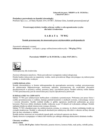 Załącznik do pozw. MRiRW nr R- 35/2013h.r. z dnia19.07.2013 r Posiadacz pozwolenia na handel równoległy: ProEuro Sp.z.o.o., ul Stary Rynek 25/4, 65-067, Zielona Góra, kontakt [email protected] \ Przestrzegaj etykiety środka ochrony roślin w celu ograniczenia ryzyka dla ludzi i środowiska S A B A T A 75 WG Środek przeznaczony do stosowania przez użytkowników profesjonalnych Zawartość substancji czynnej: tribenuron metylowy – (związek z grupy sulfonylomocznikowych) - 750 g/kg (75%) Pozwolenie MRiRW nr R-35/2013h.r z dnia 19.07.2013 r. Niebezpieczny dla środowiska Zawiera tribenuron metylowy. Może powodować wystąpienie reakcji alergicznej. Działa bardzo toksycznie na organizmy wodne, może powodować długo utrzymujące się niekorzystne zmiany w środowisku wodnym. I OPIS DZIAŁANIA Środek chwastobójczy w formie mikrogranulatu do sporządzania zawiesiny wodnej, przystosowany do odmierzania objętościowego, stosowany nalistnie, przeznaczony do zwalczania chwastów dwuliściennych w pszenicy ozimej, pszenicy jarej i jęczmieniu jarym. Środek ochrony roślin Sabata 75 WG przeznaczony jest do stosowania przy użyciu opryskiwaczy polowych. II DZIAŁANIE NA CHWASTY Sabata 75 WG jest selektywnym herbicydem o działaniu systemicznym. Pobierany jest przez liście i szybko przemieszczany w roślinie, hamuje podział komórek w stożkach wzrostu, wstrzymując wzrost i rozwój chwastów. Szybki rozkład środka w glebie ogranicza możliwość pobierania go przez korzenie. Pierwsze efekty działania środka widoczne są po 14 dniach od wykonania zabiegu. Środek najlepiej działa na młode intensywnie rosnące chwasty. Sabata 75 WG charakteryzuje się selektywnością czynną, co oznacza, że zboża rozkładają środek na związki nieaktywne. Środek w zalecanych dawkach jest selektywny dla zbóż w okresie od fazy dwóch liści do fazy strzelania w źdźbło. Środek można stosować na wszystkich typach gleb, na których uprawia się zboża. Opady deszczu występujące w trakcie lub wkrótce po zabiegu obniżają skuteczność działania środka. Chwasty wrażliwe: zboża ozime − dawka 20-25 g/ha: chaber bławatek, jasnota różowa, komosa biała, mak polny, tobołki polne, zboża jare − dawka 15-20 g/ha: chaber bławatek, gwiazdnica pospolita, jasnota różowa, komosa biała, mak polny, nawrot polny, przytulia czepna (dawka 20 g/ha), rumianek pospolity (dawka 20 g/ha), tasznik pospolity, tobołki polne, Chwasty średniowrażliwe: fiołek polny, ostrożeń polny, rdest powojowaty Chwasty odporne: chwasty jednoliścienne. III ZASTOSOWANIE ŚRODKA 1. pszenica ozima Środek stosować wiosną, po ruszeniu wegetacji, od fazy krzewienia do początku fazy strzelania w źdźbło. Środek stosować z dodatkiem adiuwanta (środek wspomagający): Maksymalna dawka dla jednorazowego zastosowania: Sabata 75 WG 25 g/ha + Atpolan 80 EC 1,5 l/ha Sabata 75 WG 25 g/ha + Silwett 0,1 l/ha Zalecana dawka dla jednorazowego zastosowania: Sabata 75 WG 20-25 g/ha + Atpolan 80 EC 1,5 l/ha Sabata 75 WG 20-25 g/ha + Silwett 0,1 l/ha 2. pszenica jara, jęczmień jary. Środek stosować od fazy krzewienia do początku fazy strzelania w źdźbło. Środek stosować w fazie 2-4 liści chwastów: Środek stosować z dodatkiem adiuwanta (środek wspomagający): Maksymalna dawka dla jednorazowego zastosowania: Sabata 75 WG 20 g/ha + Atpolan 80 EC 1,5 l/ha Sabata 75 WG 20 g/ha + Silwett 0,1 l/ha Zalecana dawka dla jednorazowego zastosowania: Sabata 75 WG 15-20 g/ha + Atpolan 80 EC 1,5 l/ha Sabata 75 WG 15-20 g/ha + Silwett 0,1 l/ha Maksymalna liczba zabiegów w sezonie wegetacyjnym:1 Zalecana ilość wody: 200 – 300 l/ha. Zalecane opryskiwanie: średniokropliste. UWAGI: 1. Silna rosa lub opady występujące wcześniej niż w 4 godziny po zabiegu mogą obniżyć skuteczność działania środka 2. Wyższą z zalecanych dawek środka stosować na chwasty w późniejszych fazach rozwojowych lub w przypadku silnego zachwaszczenia plantacji. 3. W zależności od przebiegu pogody po zabiegu może wystąpić nieznaczne żółknięcie liści oraz krótkotrwałe zahamowanie wzrostu zbóż. Objawy te ustępują bez ujemnego wpływu na plon. 4. Niektóre gatunki chwastów np. rdest powojowy mogą wykazać odporność na środek. Celem zapobiegania uodpornienia się chwastów należy: − stosować środek na młode, intensywnie rosnące chwasty − stosować środek przemiennie z herbicydami o innym mechanizmie działania. 3. PRZECIWWSKAZANIA Środka nie stosować: − łącznie z nawozami stosowanymi nalistnie, − w zbożach z wsiewką roślin motylkowych, − na rośliny uszkodzone przez mróz, suszę, szkodniki lub choroby. Podczas stosowania środka nie dopuścić do: − znoszenia cieczy użytkowej na sąsiednie rośliny uprawne, − nakładania się cieczy użytkowej na stykach pasów zabiegowych i uwrociach. 4. NASTĘPSTWO ROŚLIN Po wcześniejszej likwidacji plantacji, środek nie stwarza zagrożenia dla roślin uprawianych w tym samym sezonie wegetacyjnym, po wykonaniu orki i upływie 30 dni od zabiegu dla zbóż i kukurydzy a w przyszłym sezonie wegetacyjnym dla wszystkich roślin uprawnych. 5. OKRES OD OSTATNIEGO ZASTOSOWANIA ŚRODKA NA ROŚLINY DO DNIA W KTÓRYM MOŻNA SIAĆ LUB SADZIĆ ROŚLINY UPRAWIANE NASTĘPCZO - likwidacja plantacji, w tym samym sezonie wegetacyjnym: zboża , kukurydza - 30 dni, - po zbiorze rośliny uprawnej w przyszłym sezonie wegetacyjnym – nie dotyczy. IV SPORZĄDZANIE CIECZY UŻYTKOWEJ Przed przystąpieniem do sporządzania cieczy użytkowej dokładnie ustalić potrzebną jej ilość. Środek odmierzyć załączoną do opakowania wyskalowaną miarką (lub odważyć). Odmierzoną ilość środka wsypać bezpośrednio do zbiornika opryskiwacza napełnionego częściowo wodą (z włączonym mieszadłem) i uzupełnić wodą do połowy zbiornika następnie dodać Atpolan 80 EC/Silwett. Opróżnione opakowanie przepłukać trzykrotnie wodą, a popłuczyny wlać do zbiornika opr