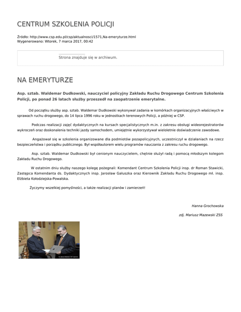 CENTRUM SZKOLENIA POLICJI Źródło: http://www.csp.edu.pl/csp/aktualnosci/1571,Na-emeryturze.html Wygenerowano: Wtorek, 7 marca 2017, 00:42 Strona znajduje się w archiwum. NA EMERYTURZE Asp. sztab. Waldemar Dudkowski, nauczyciel policyjny Zakładu Ruchu Drogowego Centrum Szkolenia Policji, po ponad 26 latach służby przeszedł na zaopatrzenie emerytalne. Od początku służby asp. sztab. Waldemar Dudkowski wykonywał zadania w komórkach organizacyjnych właściwych w sprawach ruchu drogowego, do 14 lipca 1996 roku w jednostkach terenowych Policji, a później w CSP. Podczas realizacji zajęć dydaktycznych na kursach specjalistycznych m.in. z zakresu obsługi wideorejestratorów wykroczeń oraz doskonalenia techniki jazdy samochodem, umiejętnie wykorzystywał wieloletnie doświadczenie zawodowe. Angażował się w szkolenia organizowane dla podmiotów pozapolicyjnych, uczestniczył w działaniach na rzecz bezpieczeństwa i porządku publicznego. Był współautorem wielu programów nauczania z zakresu ruchu drogowego. Asp. sztab. Waldemar Dudkowski był cenionym nauczycielem, chętnie służył radą i pomocą młodszym kolegom Zakładu Ruchu Drogowego. W ostatnim dniu służby naszego kolegę pożegnali: Komendant Centrum Szkolenia Policji insp. dr Roman Stawicki, Zastępca Komendanta ds. Dydaktycznych insp. Jarosław Gałuszka oraz Kierownik Zakładu Ruchu Drogowego mł. insp. Elżbieta Kołodziejska-Powalska. Życzymy wszelkiej pomyślności, a także realizacji planów i zamierzeń! Hanna Grochowska zdj. Mariusz Mazewski ZSS Ocena: 0/5 (0) Tweetnij