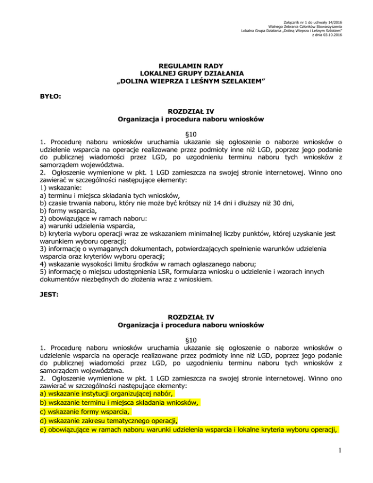 Załącznik nr 1 do uchwały 14/2016 Walnego Zebrania Członków Stowarzyszenia Lokalna Grupa Działania „Doliną Wieprza i Leśnym Szlakiem” z dnia 03.10.2016 REGULAMIN RADY LOKALNEJ GRUPY DZIAŁANIA „DOLINA WIEPRZA I LEŚNYM SZELAKIEM” BYŁO: ROZDZIAŁ IV Organizacja i procedura naboru wniosków §10 1. Procedurę naboru wniosków uruchamia ukazanie się ogłoszenie o naborze wniosków o udzielenie wsparcia na operacje realizowane przez podmioty inne niż LGD, poprzez jego podanie do publicznej wiadomości przez LGD, po uzgodnieniu terminu naboru tych wniosków z samorządem województwa. 2. Ogłoszenie wymienione w pkt. 1 LGD zamieszcza na swojej stronie internetowej. Winno ono zawierać w szczególności następujące elementy: 1) wskazanie: a) terminu i miejsca składania tych wniosków, b) czasie trwania naboru, który nie może być krótszy niż 14 dni i dłuższy niż 30 dni, b) formy wsparcia, 2) obowiązujące w ramach naboru: a) warunki udzielenia wsparcia, b) kryteria wyboru operacji wraz ze wskazaniem minimalnej liczby punktów, której uzyskanie jest warunkiem wyboru operacji; 3) informację o wymaganych dokumentach, potwierdzających spełnienie warunków udzielenia wsparcia oraz kryteriów wyboru operacji; 4) wskazanie wysokości limitu środków w ramach ogłaszanego naboru; 5) informację o miejscu udostępnienia LSR, formularza wniosku o udzielenie i wzorach innych dokumentów niezbędnych do złożenia wraz z wnioskiem. JEST: ROZDZIAŁ IV Organizacja i procedura naboru wniosków §10 1. Procedurę naboru wniosków uruchamia ukazanie się ogłoszenie o naborze wniosków o udzielenie wsparcia na operacje realizowane przez podmioty inne niż LGD, poprzez jego podanie do publicznej wiadomości przez LGD, po uzgodnieniu terminu naboru tych wniosków z samorządem województwa. 2. Ogłoszenie wymienione w pkt. 1 LGD zamieszcza na swojej stronie internetowej. Winno ono zawierać w szczególności następujące elementy: a) wskazanie instytucji organizującej nabór, b) wskazanie terminu i miejsca składania wniosków, c) wskazanie formy wsparcia, d) wskazanie zakresu tematycznego operacji, e) obowiązujące w ramach naboru warunki udzielenia wsparcia i lokalne kryteria wyboru operacji, 1 Załącznik nr 1 do uchwały 14/2016 Walnego Zebrania Członków Stowarzyszenia Lokalna Grupa Działania „Doliną Wieprza i Leśnym Szlakiem” z dnia 03.10.2016 f) wskazanie minimalnej liczby punktów, której uzyskanie w wyniku oceny operacji według lokalnych kryteriów wyboru operacji jest warunkiem wyboru operacji, g) informację o wymaganych dokumentach, potwierdzających spełnienie warunków udzielenia wsparcia oraz kryteriów wyboru operacji, h) wskazanie wysokości pomocy/wartości premii, i) wskazanie intensywności pomocy, j) wskazanie wysokości limitu środków w ramach ogłaszanego naboru, k) informację o miejscu udostępnienia LSR i formularzy: wniosku o udzielenie wsparcia, wniosku o płatność, umowy o udzielenie wsparcia, l) informację o miejscu udostępnienia innych dokumentów zawierających informacje o naborze. BYŁO: §31 1. W stosunku do każdej operacji będącej przedmiotem posiedzenia Rady podejmowana jest przez Radę decyzja w formie uchwały o wybraniu bądź niewybraniu konkretnych operacji do finansowania, której treść musi uwzględniać: 1) wyniki głosowania w sprawie oceny zgodności operacji według lokalnych kryteriów wyboru operacji LGD i sporządzoną na tej podstawie listę rankingową wniosków, 2) dostępność środków LGD na poszczególne typy operacji, 3) w przypadku operacji objętych wnioskami złożonymi w terminie i miejscu innym niż wskazane w informacji o możliwości składania wniosków, bądź bez wskazania adresu wnioskodawcy w sytuacji, kiedy nie był on możliwy do ustalenia, Rada rozstrzyga w formie uchwały o niedopuszczeniu tych operacji do procesu oceny. 2. Przewodniczący Rady odczytuje uchwały dotyczące poszczególnych projektów rozpatrywanych w trakcie posiedzenia, bez potrzeby ich przegłosowania. 3. Każda uchwała powinna zawierać: 1) informacje o wnioskodawcy operacji (imię i nazwisko lub nazwę, miejsce zamieszkania lub miejsce działalności, adres lub siedzibę, PESEL lub REGON, NIP), 2) tytuł operacji zgodny z tytułem podanym we wniosku, 3) kwotę pomocy o jaką ubiegał się wnioskodawca zgodną z kwotą podaną we wniosku, 4) informację o decyzji Rady w sprawie zgodności lub braku zgodności operacji z LSR i liczbie uzyskanych punktów w ocenie według lokalnych kryteriów wyboru operacji, 5) informację o finansowaniu lub niefinansowaniu realizacji operacji. 4. Biuro LGD po ustaleniu przez Radę listy rankingowej wykonuje w terminie 7 dni od dnia zakończenia wyboru operacji następujące czynności: 1) zamieszcza na swojej stronie internetowej listę operacji zgodnych z LSR oraz listę operacji wybranych, ze wskazaniem, które z operacji mieszczą się w limicie środków wskazanym w ogłoszeniu o naborze wniosków o udzielenie wsparcia, 2) przekazuje podmiotowi ubiegającemu się o wsparcie, pisemną informację (wzór - załącznik nr 3 do Regulaminu Rady) o wyniku oceny zgodności jego operacji z LSR lub wyniku wyboru, w tym oceny w zakresie spełniania przez jego operację kryteriów wyboru wraz z uzasadnieniem oceny i podaniem liczby punktów otrzymanych przez operację, a w przypadku pozytywnego wyniku wyboru – zawierającą dodatkowo wskazanie, czy w dniu przekazania wniosków o udzielenie wsparcia do zarządu województwa operacja mieści się w limicie środków wskazanym w ogłoszeniu o naborze tych wniosków. 3) jeśli projekt otrzymał negatywna ocenę, informacja zawiera pouczenie o możliwości wniesienia protestu w trybie procedury odwoławczej, określając: a) termin do wniesienia protestu, b) instytucję do której należy wnieść protest, 2 Załącznik nr 1 do uchwały 14/2016 Walnego Zebrania Członków Stowarzyszenia Lokalna Grupa Działania „Doliną Wieprza i Le