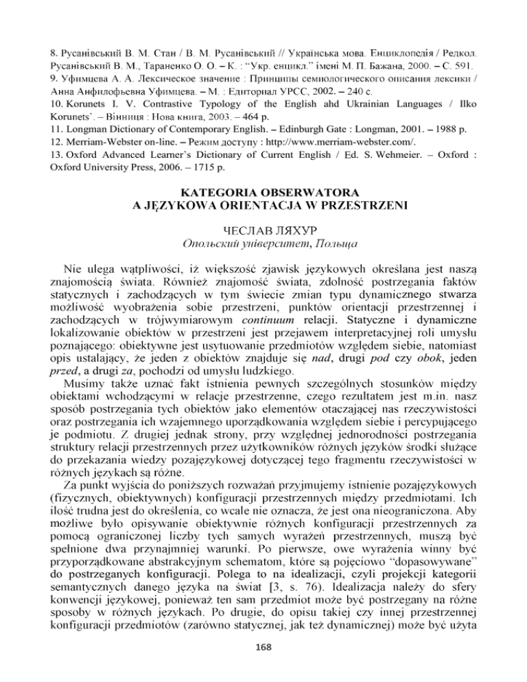 8. 9. 002. 10. Korunets I. V. Contrastive Typology of the English ahd Ukrainian Languages / Ilko Koru 464 p. 11. Longman Dictionary of Contemporary English. Edinburgh Gate : Longman, 2001. 1988 p. 12. Merriam-Webster on-line. : http://www.merriam-webster.com/. 13. Oxford Advanced Learner s Dictionary of Current English / d. S. Wehmeier. Oxford : Oxford University Press, 2006. 1715 p. KATEGORIA OBSERWATORA A i , znego stwarza continuum relacji. Statyczne i dynamiczne nad, drugi pod czy obok, jeden przed, a drugi za je mo do postrzeganych konfiguracji. Polega to na idealizacji, czyli projekcji kategorii 168 Dowolne relacje, k ruch konkretny oraz, z drugiej strony, orientacja (rozumiana -domiejscowe, same relacje kinetyczno- adlatywne; delokalizacja (translokacja) natomiast translokacja, w której za domem za dom zza domu). orientacji , , , wyraz prze góra ( ) szafy ( przestrzenn korzystanie z przedmiotu (inaczej: jest to najbardziej funkcjonalna strona ponadto w wypadku przyimków przed, za, nad, pod z nazwami obiektów Zaznaczmy, orientacji przestrzennej realizuje para . przed i za przy 169 ych w ogóle, jest opisywanych zjawisk, lecz widzi je oczyma jednego ze swych bohaterów [1, c. 94]. Zaznaczmy , , , : . e na . .* ). Por. równie 109 113; 7, c. 50). i na ten temat w artykule Lachur 2009). zeni jest 170 ora na jednym z najbardziej specyficznych przyimków translokacyjnych, a mianowicie przyimka zza. zza czy sprzed (tj z-/s- przed, za, nad, pod, (n zza tj. kontaktowy z , ). zza spoza reprezentowany przez grupy imienne z a) elementu dynamicznego (tj. przedmiotu lokalizowanego), b) przeszkody lub przyimkiem zza nego, dla którego Jan stoi fraza za + bier. ). A zatem zarówno przyimek zza ki za za za drzewem + narz. i za zza strony nie we wszystkich kontekstach translokacyjne (ablatywne) zza jest dynamicznym konwersywem statycznego za + narz. i adlatywnego za + bier. 171 frazy nominaln czasownika, jego przedrostka, a czasem nawet szerszego kontekstu). Por.: m pokonaniem przeszkody) kontaktu z lokalizatorem). Konstrukcje z zza (S. Fleszarowa-Muskat); lokalizowanym i obserwatorem): [...] wyjrzy zza chmur (K. Korkozowicz) ch niebieskiego; , terenowych (lokalizator i przedmiot lokalizowany): Maryla zarowa-Muskat). przyimkiem zza miejsce: przemieszczenia jest tylna, odwrotna strona przedmiotu: Na wody przed nimi jak zza remorqueur , ludziom nie wypadli (H. wbiegli zza bramy. ablatywnego zza + dop., jego wariantu adlatywnego za + bier. i lokatywnego za + erwatora jako jednego ze wp 172 Por.: na balkon, do sadu razem z nim na balkonie, w sadzie; , do sadu szerzej o tym patrz w: Lachur 1999). zza dla przekazania wybiec zza bramy, wbiec zza bramy adlatywnego przedrostka w- przedrostkiem wydodatkowych, relacji). Mamy zatem: (S. Piasecki). , pod (S. P.). , niebrzydka kobieta w czer , (J. P.). Oprócz tego przedrostek w- [...] przedrostkiem w- przy translokacyjnej orientacji zza (Leonard). W tej chwili (K. . przeszkody: (K. kresem: [...] z daleka, zza parku, ej o drzewa (J. Iwaszkiewicz). zza (K. Korkozowicz). wyborem gru zza z innym przyimkiem pozycyjnym, a mianowicie przyimkiem sprzed (co jednak zostanie zaprezentowane w innym miejscu). W przypadku przyimka pozycyjnego, 173 jakim jest przyimek zza statycznymprzedmiocie lokalizowanym). LITERATURA Zbiór studiów / Pod red. T. - .5 J j . 8. Lachur CZ. Semantyka przestrzenna polskich przyimków prefigowanych na tle rosyjskim / CZ. Lachur. Opole. 9. Lachur CZ. CZ. Lachur i . 9 : i i . ., 2008. - h (noha, host, husa, hra, hrách), jídelna), e (den, herec, (diktat polityka) studente! hochu!), k /c, h/ z, g/ z j (jitro, jih, , perla), dyktat, politika ( !! sestro (matka 174 matce,