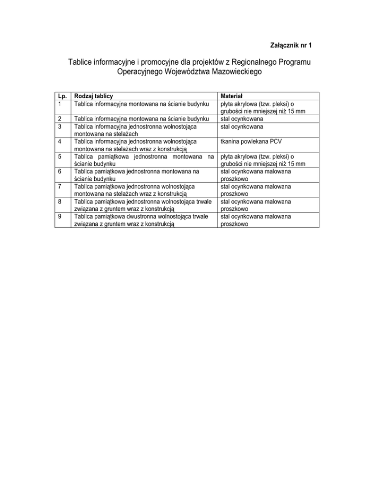 Załącznik nr 1 Tablice informacyjne i promocyjne dla projektów z Regionalnego Programu Operacyjnego Województwa Mazowieckiego Lp. 1 Rodzaj tablicy Tablica informacyjna montowana na ścianie budynku 2 3 Tablica informacyjna montowana na ścianie budynku Tablica informacyjna jednostronna wolnostojąca montowana na stelażach Tablica informacyjna jednostronna wolnostojąca montowana na stelażach wraz z konstrukcją Tablica pamiątkowa jednostronna montowana na ścianie budynku Tablica pamiątkowa jednostronna montowana na ścianie budynku Tablica pamiątkowa jednostronna wolnostojąca montowana na stelażach wraz z konstrukcją Tablica pamiątkowa jednostronna wolnostojąca trwale związana z gruntem wraz z konstrukcją Tablica pamiątkowa dwustronna wolnostojąca trwale związana z gruntem wraz z konstrukcją 4 5 6 7 8 9 Materiał płyta akrylowa (tzw. pleksi) o grubości nie mniejszej niż 15 mm stal ocynkowana stal ocynkowana tkanina powlekana PCV płyta akrylowa (tzw. pleksi) o grubości nie mniejszej niż 15 mm stal ocynkowana malowana proszkowo stal ocynkowana malowana proszkowo stal ocynkowana malowana proszkowo stal ocynkowana malowana proszkowo