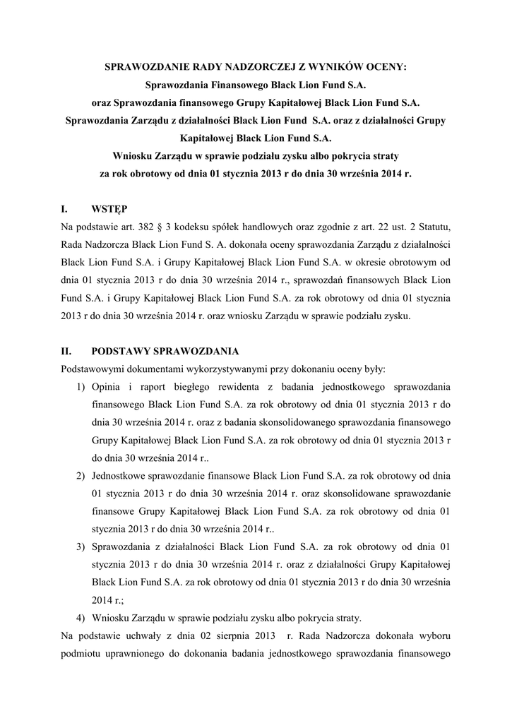 SPRAWOZDANIE RADY NADZORCZEJ Z WYNIKÓW OCENY: Sprawozdania Finansowego Black Lion Fund S.A. oraz Sprawozdania finansowego Grupy Kapitałowej Black Lion Fund S.A. Sprawozdania Zarządu z działalności Black Lion Fund S.A. oraz z działalności Grupy Kapitałowej Black Lion Fund S.A. Wniosku Zarządu w sprawie podziału zysku albo pokrycia straty za rok obrotowy od dnia 01 stycznia 2013 r do dnia 30 września 2014 r. I. WSTĘP Na podstawie art. 382 § 3 kodeksu spółek handlowych oraz zgodnie z art. 22 ust. 2 Statutu, Rada Nadzorcza Black Lion Fund S. A. dokonała oceny sprawozdania Zarządu z działalności Black Lion Fund S.A. i Grupy Kapitałowej Black Lion Fund S.A. w okresie obrotowym od dnia 01 stycznia 2013 r do dnia 30 września 2014 r., sprawozdań finansowych Black Lion Fund S.A. i Grupy Kapitałowej Black Lion Fund S.A. za rok obrotowy od dnia 01 stycznia 2013 r do dnia 30 września 2014 r. oraz wniosku Zarządu w sprawie podziału zysku. II. PODSTAWY SPRAWOZDANIA Podstawowymi dokumentami wykorzystywanymi przy dokonaniu oceny były: 1) Opinia i raport biegłego rewidenta z badania jednostkowego sprawozdania finansowego Black Lion Fund S.A. za rok obrotowy od dnia 01 stycznia 2013 r do dnia 30 września 2014 r. oraz z badania skonsolidowanego sprawozdania finansowego Grupy Kapitałowej Black Lion Fund S.A. za rok obrotowy od dnia 01 stycznia 2013 r do dnia 30 września 2014 r.. 2) Jednostkowe sprawozdanie finansowe Black Lion Fund S.A. za rok obrotowy od dnia 01 stycznia 2013 r do dnia 30 września 2014 r. oraz skonsolidowane sprawozdanie finansowe Grupy Kapitałowej Black Lion Fund S.A. za rok obrotowy od dnia 01 stycznia 2013 r do dnia 30 września 2014 r.. 3) Sprawozdania z działalności Black Lion Fund S.A. za rok obrotowy od dnia 01 stycznia 2013 r do dnia 30 września 2014 r. oraz z działalności Grupy Kapitałowej Black Lion Fund S.A. za rok obrotowy od dnia 01 stycznia 2013 r do dnia 30 września 2014 r.; 4) Wniosku Zarządu w sprawie podziału zysku albo pokrycia straty. Na podstawie uchwały z dnia 02 sierpnia 2013 r. Rada Nadzorcza dokonała wyboru podmiotu uprawnionego do dokonania badania jednostkowego sprawozdania finansowego Black Lion Fund S.A. za rok obrotowy od dnia 01 stycznia 2013 r do dnia 30 września 2014 r. oraz skonsolidowanego sprawozdania finansowego Grupy Kapitałowej Black Lion Fund S.A. za rok obrotowy od dnia 01 stycznia 2013 r do dnia 30 września 2014 r.. Podmiotem uprawnionym do dokonania badania była spółka pod firmą WBS Audyt Spółka z ograniczoną odpowiedzialnością z siedzibą w Warszawie. III. WYNIKI OCENY JEDNOSTKOWEGO SPRAWOZDANIA FINANSOWEGO BLACK LION FUND S.A. ZA ROK OBROTOWY OD DNIA 01 STYCZNIA 2013 R DO DNIA 30 WRZEŚNIA 2014 R. ORAZ SKONSOLIDOWANEGO SPRAWOZDANIA FINANSOWEGO GRUPY KAPITAŁOWEJ BLACK LION FUND S.A. Jednostkowe sprawozdanie finansowe Black Lion Fund S.A zostało sporządzone zgodnie z obowiązującymi przepisami prawa oraz postanowieniami Statutu Black Lion Fund S.A., przedstawia rzetelnie i jasno sytuację majątkową i finansową Black Lion Fund S.A. oraz wynik finansowy za rok obrotowy od dnia 01 stycznia 2013 r do dnia 30 września 2014 r. 1. Sprawozdanie jednostkowe: Zgodne z przedstawionym sprawozdaniem finansowym, wyniki finansowe Black Lion Fund S.A. są następujące: 1) bilans sporządzony na dzień 30 czerwca 2014 roku, który wykazuje po stronie aktywów i pasywów sumę równą 410.667 tys. złotych; aktywa netto wyrażone w tysiącach wykazane w sprawozdaniu finansowym wynoszą na dzień 30 września 2014 roku 324.350 tys. zł, 2) rachunek zysków i strat za rok od 1 stycznia 2013 roku do 30 września 2014 roku, wykazuje zysk netto w kwocie 21.416 tys. zł, 3) zestawienie zmian w kapitale własnym za rok obrotowy od dnia 1 stycznia 2013 r. do dnia 30 września 2014 r. wykazuje zmniejszenie kapitału własnego w kwocie 50.145 tys. zł. 4) rachunek z przepływu środków pieniężnych, wykazuje zwiększenie stanu środków pieniężnych za okres od dnia 1 stycznia 2013 roku do dnia 30 września 2014 roku na sumę 36 165 tys. zł; 2. Sprawozdanie finansowe Grupy Kapitałowej. Skonsolidowane sprawozdanie finansowe Grupy Kapitałowej Black Lion Fund S.A. zostało sporządzone zgodnie z obowiązującymi przepisami prawa oraz postanowieniami Statutu Black Lion Fund S.A., przedstawia rzetelnie i jasno sytuację majątkową i finansową Grupy Kapitałowej Black Lion Fund S.A. Zgodnie z przedstawionym sprawozdaniem wyniki finansowe Grupy Kapitałowej Black Lion Fund S.A są następujące: 1) skonsolidowane sprawozdanie z sytuacji finansowej na dzień 30 września 2014 r. które wykazuje po stronie aktywów i pasywów sumę 567.968 tys. złotych, 2) skonsolidowane sprawozdanie z całkowitych dochodów za okres od 1 stycznia 2013 roku do 30 września 2014 roku, wykazujący stratę przypadającą na akcjonariuszy Spółki w wysokości 39.828 tys. złotych, 3) sprawozdanie ze zmian w skonsolidowanym kapitale własnym za okres od dnia 1 stycznia 2013 r. do dnia 30 września 2014 r. wykazujące zmniejszenie stanu kapitału własnego przypadającego Grupie o kwotę 3.872 tys. złotych, 4) skonsolidowane sprawozdanie z przepływów pieniężnych, wykazujące zwiększenie stanu środków pieniężnych za okres od dnia 1 stycznia 2013 roku do dnia 30 września 2014 roku na sumę 37.624 tys. złotych, Jednostkowe sprawozdanie finansowe Black Lion Fund S.A oraz skonsolidowane sprawozdanie Grupy Kapitałowej Black Lion Fund S.A zdaniem Rady Nadzorczej Black Lion Fund S.A. zostały sporządzone na podstawie prawidłowo prowadzonych ksiąg rachunkowych i zgodnie ze stosowanymi w sposób ciągły zasadami rachunkowości obowiązującymi na terytorium Rzeczypospolitej Polskiej. IV. WYNIKI OCENY SPRAWOZDANIA ZARZĄDU Z DZIAŁALNOŚCI BLACK LION FUND S.A. ZA ROK OBROTOWY OD DNIA 01 STYCZNIA 2013 R DO DNIA 30 WRZEŚNIA 2014 R. ORAZ Z DZIAŁALNOŚCI GRUPY KAPITAŁOWEJ BLACK LION FUND S.A. Rada Nadzorcza pozytywnie ocenia Spr