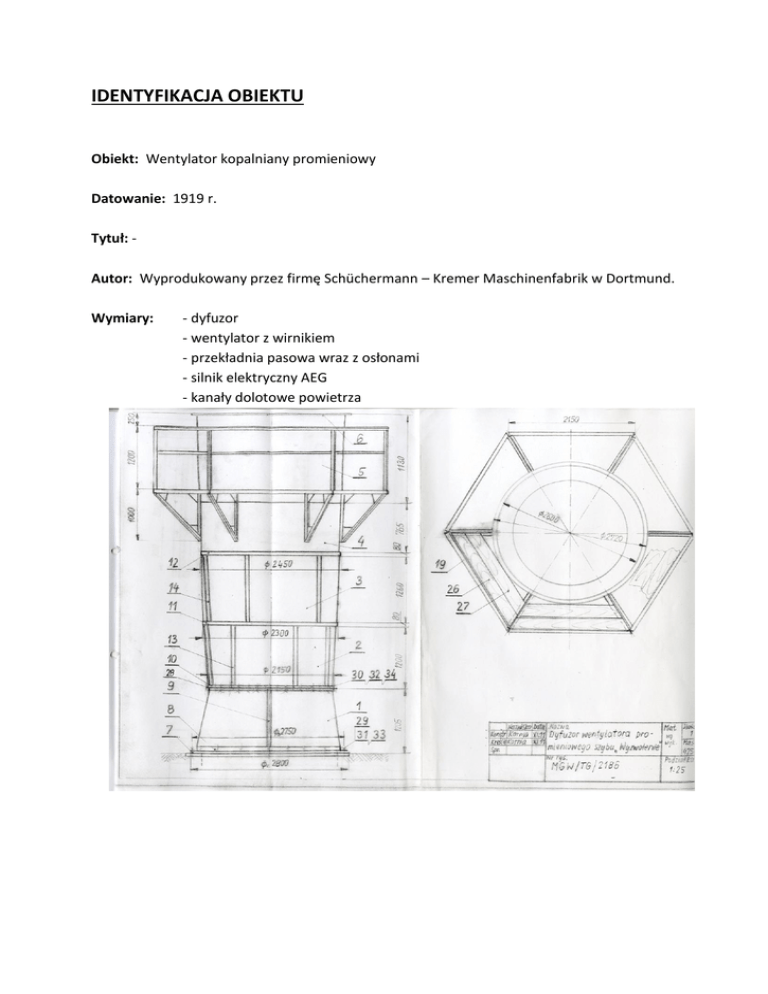 IDENTYFIKACJA OBIEKTU Obiekt: Wentylator kopalniany promieniowy Datowanie: 1919 r. Tytuł: Autor: Wyprodukowany przez firmę Schüchermann – Kremer Maschinenfabrik w Dortmund. Wymiary: - dyfuzor - wentylator z wirnikiem - przekładnia pasowa wraz z osłonami - silnik elektryczny AEG - kanały dolotowe powietrza Materiał i technika wykonania: Konstrukcja i blachy stalowe, spawane i nitowane. Opis obiektu: Dyfuzor wentylatora Dyfuzor wentylatora jest konstrukcją stalową, cylindryczną o zmiennej średnicy i wysokości 6,5 mb. Wykonany został z blach stalowych, profilowanych o gr. 5 mm, łączonych pomiędzy sobą na nity z łbem soczewkowym. Konstrukcja dyfuzora posadowiona jest na fundamencie betonowym na poziomie gruntu. Wentylator odśrodkowy Obudowa wirnika posiada konstrukcję blaszaną segmentową o wymiarach zewnętrznych: 5,39 mb x 3,16 mb x 3,18 mb, dolna część obudowy znajduje się poniżej poziomu gruntu, całość zamocowana jest do betonowego fundamentu. Lokalizacja: Skansen Górniczy Królowa Luiza – Oddział Muzeum Górnictwa Węglowego w Zabrzu, ul. Sienkiewicza. Właściciel: Muzeum Górnictwa Węglowego w Zabrzu 41-800 Zabrze, ul. 3 Maja 19 Nr inw; MGW/TG/2186 HISTORIA OBIEKTU Wentylator wyprodukowany został przez firmę Schüchermann – Kremer Maschinenfabrik w Dortmund. W 1919 roku został zabudowany obok szybu wentylacyjnego Wyzwolenie ówczesnej kopalni węgla kamiennego „Królowa Luiza” – Pole Zachodnie w Zabrzu. Wykorzystywany był do 1985 roku. Po likwidacji szybu Wyzwolenie został wyłączony z eksploatacji. W 1993 roku został przekazany Muzeum Górnictwa Węglowego w Zabrzu. STAN ZACHOWANIA Dyfuzor wentylatora W ciągu okresu eksploatacji dyfuzor wielokrotnie był naprawiany. Wskazują na to liczne wtórne reperacje i wymiany uszkodzonych elementów z zastosowaniem techniki spawalniczej, oraz zmiany konstrukcyjne usprawniające obsługę urządzenia. Zarówno podest w zwieńczeniu komina, wykonany z kątowników, jak i pasy stalowe oplatające obwód komina, wykazują obecność łączeń spawalniczych z blachą na całej długości styku, co wskazuje na późniejszy okres powstania. Na całej powierzchni elementów metalowych widoczne są ślady korozji powierzchniowej, podpowłokowej, jak również wżerowej, które doprowadziły w wielu miejscach do perforacji blachy zagrażając statyce obiektu. Efektem tej korozji jest również łuszczenie się warstw powłok lakierniczych. Elementy metalowe wewnątrz pierwotnie, prawdopodobnie nie były zabezpieczone przed korozją, na co wskazuje równomierna warstwa produktów korozji na całej powierzchni. Wentylator odśrodkowy Podobnie jak dyfuzor, obudowa wentylatora narażona jest na działanie korozji wżerowej. Szczególnie widoczne jest to w strefie przyziemia gdzie utrzymuje się stale podwyższona wilgotność, jak również elementy te narażone są na intensywne działanie warunków atmosferycznych, takich jak śnieg i deszcz. Uwidacznia się to silną perforacją blach i konstrukcji metalowej w tej strefie. Elementy metalowe wewnątrz pierwotnie, prawdopodobnie nie były zabezpieczone przed korozją, na co wskazuje równomierna warstwa produktów korozji na całej powierzchni. PROPONOWANY ZAKRES PRAC KONSERWATORSKICH: Wnioski i założenia konserwatorskie Celem zabiegów konserwatorskich jest powstrzymanie procesu intensywnego niszczenia obiektu, przywrócenie jego pierwotnego wyglądu i funkcji (obecnie nie planuje się uruchomienia wentylatora, ale w przyszłości może być to element ekspozycji obrazujący pracę systemu wentylacji kopalni). Przeprowadzone prace mają również na celu zabezpieczenie obiektu przed niszczącym wpływem warunków atmosferycznych w przyszłości. Program prac konserwatorskich 1. Demontaż obiektu. Ze względu na gabaryty obiektu proponuje się prowadzić prace in situ. Dopuszcza się wykonanie prac w innym miejscu, jednakże muszą ku temu zaistnieć uzasadnione przesłanki wynikające z zakresu prowadzonych prac. 2. Wykonanie badań stratygraficznych mających na celu ustalenie pierwotnej kolorystyki wszystkich elementów obiektu. 3. Usunięcie wtórnych elementów dodanych w trakcie użytkowania wentylatora. Decyzję o usunięciu, bądź pozostawieniu wtórnych elementów należy podjąć w porozumieniu z właścicielem obiektu. 4. Demontaż konstrukcji. Decyzję o zakresie demontażu konstrukcji należy podjąć w trakcie prowadzonych prac. 5. Usunięcie wtórnych reperacji i napraw. Wtórne reperacje dodane w trakcie eksploatacji obiektu przez kopalnię należy usunąć. Dopuszcza się pozostawienie wtórnych elementów poprawnie zabudowanych (zgodnie z pierwotną konstrukcją) w dobrym stanie technicznym. 6. Usunięcie powłok malarskich metodą ścierną (piaskowanie). Doboru ścierniwa należy dokonać po wykonaniu prób na obiekcie. Jednocześnie wstępnie zostaną usunięte produkty korozji metalu. 7. Wycięcie blach lub ich fragmentów zniszczonych w wyniku działania procesów korozji. 8. Uzupełnienie ubytków blach poprzez wspawanie nowych blach lub ich fragmentów o grubości materiału oryginalnego z równoczesnym scaleniem faktury powierzchni (nowej i zachowanej). 9. Rekonstrukcja brakujących elementów lub w złym stanie technicznym na podstawie zachowanej dokumentacji oraz materiałów ikonograficznych. 10. Usunięcie korozji z przestrzeni blach zachodzących na siebie. Decyzję o roznitowaniu konstrukcji i rozcięciu spawów należy podjąć w trakcie prowadzenia prac. 11. Usunięcie korozji z powierzchni metalu metodą ścierną (piaskowanie). Doboru ścierniwa należy dokonać po wykonaniu prób na obiekcie. Kolejność zabiegów; montażu poszczególnych elementów i usuwania korozji, uzależniona jest od możliwości technicznych w poszczególnych przypadkach. Należy pamiętać, że w krótkim czasie po usunięciu ognisk korozji należy wykonać powłokę antykorozyjną. 12. Wykonanie powłok antykorozyjnych na metalu farbami do