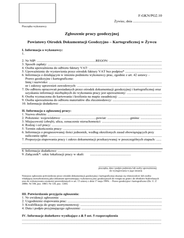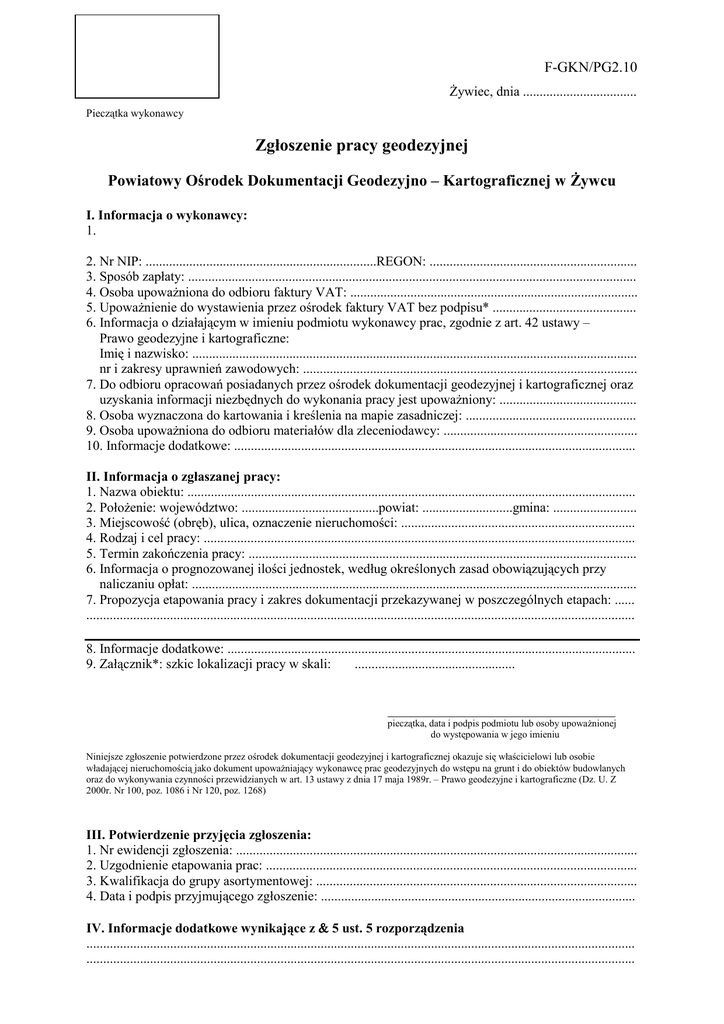 F-GKN/PG2.10 śywiec, dnia .................................. Pieczątka wykonawcy Zgłoszenie pracy geodezyjnej Powiatowy Ośrodek Dokumentacji Geodezyjno – Kartograficznej w śywcu I. Informacja o wykonawcy: 1. 2. Nr NIP: .....................................................................REGON: .............................................................. 3. Sposób zapłaty: ...................................................................................................................................... 4. Osoba upowaŜniona do odbioru faktury VAT: ...................................................................................... 5. UpowaŜnienie do wystawienia przez ośrodek faktury VAT bez podpisu* ........................................... 6. Informacja o działającym w imieniu podmiotu wykonawcy prac, zgodnie z art. 42 ustawy – Prawo geodezyjne i kartograficzne: Imię i nazwisko: ..................................................................................................................................... nr i zakresy uprawnień zawodowych: .................................................................................................... 7. Do odbioru opracowań posiadanych przez ośrodek dokumentacji geodezyjnej i kartograficznej oraz uzyskania informacji niezbędnych do wykonania pracy jest upowaŜniony: ......................................... 8. Osoba wyznaczona do kartowania i kreślenia na mapie zasadniczej: ................................................... 9. Osoba upowaŜniona do odbioru materiałów dla zleceniodawcy: .......................................................... 10. Informacje dodatkowe: ........................................................................................................................ II. Informacja o zgłaszanej pracy: 1. Nazwa obiektu: ...................................................................................................................................... 2. PołoŜenie: województwo: .........................................powiat: ...........................gmina: ......................... 3. Miejscowość (obręb), ulica, oznaczenie nieruchomości: ...................................................................... 4. Rodzaj i cel pracy: ................................................................................................................................. 5. Termin zakończenia pracy: .................................................................................................................... 6. Informacja o prognozowanej ilości jednostek, według określonych zasad obowiązujących przy naliczaniu opłat: ..................................................................................................................................... 7. Propozycja etapowania pracy i zakres dokumentacji przekazywanej w poszczególnych etapach: ...... .................................................................................................................................................................... 8. Informacje dodatkowe: .......................................................................................................................... 9. Załącznik*: szkic lokalizacji pracy w skali: ................................................ __________________________________ pieczątka, data i podpis podmiotu lub osoby upowaŜnionej do występowania w jego imieniu Niniejsze zgłoszenie potwierdzone przez ośrodek dokumentacji geodezyjnej i kartograficznej okazuje się właścicielowi lub osobie władającej nieruchomością jako dokument upowaŜniający wykonawcę prac geodezyjnych do wstępu na grunt i do obiektów budowlanych oraz do wykonywania czynności przewidzianych w art. 13 ustawy z dnia 17 maja 1989r. – Prawo geodezyjne i kartograficzne (Dz. U. Z 2000r. Nr 100, poz. 1086 i Nr 120, poz. 1268) III. Potwierdzenie przyjęcia zgłoszenia: 1. Nr ewidencji zgłoszenia: ........................................................................................................................ 2. Uzgodnienie etapowania prac: ............................................................................................................... 3. Kwalifikacja do grupy asortymentowej: ................................................................................................ 4. Data i podpis przyjmującego zgłoszenie: .............................................................................................. IV. Informacje dodatkowe wynikające z & 5 ust. 5 rozporządzenia .................................................................................................................................................................... ....................................................................................................................................................................