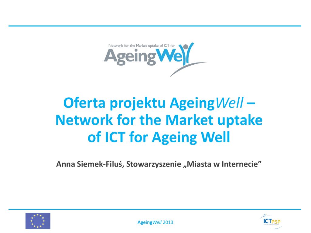 Oferta projektu AgeingWell – Network for the Market uptake of ICT for Ageing Well Anna Siemek-Filuś, Stowarzyszenie „Miasta w Internecie” AgeingWell 2013 Podstawowe informacje dot. projektu AgeingWell Nazwa: AgeingWell - Network for the Market uptake of ICT for Ageing Well Czas trwania: styczeo 2012 - grudzieo 2015 Finansowanie: Competitiveness and Innovation Framework Programme – CIP Celem projektu jest zbudowanie sieci współpracy na rzecz poprawy jakości życia osób starszych poprzez promocję i zwiększenie wykorzystania Internetu oraz rozwiązao teleinformatycznych, dostosowanych do ich potrzeb (ICT and Ageing). Projekt jest tzw. siecią tematyczną, tj. instrumentem polegającym na tworzeniu forum wymiany doświadczeo i budowy konsensusu dla interesariuszy w zakresie rozwiązao teleinformatycznych dostosowanych do potrzeb osób starszych. Jednym z kluczowych elementów projektu jest rozbudowa sieci AgeingWell. AgeingWell 2013 Członkowie Sieci AgeingWell Konsorcjum projektowe, w skład którego wchodzi Stowarzyszenie, obejmuje obecnie szesnaście podmiotów aktywnie działających w zakresie wykorzystania ICT na rzecz godnego starzenia się, w tym przedstawicieli organizacji konsumentów, przemysłu, instytucji publicznych, organizacji pozarządowych, dostawców rozwiązao teleinformatycznych dla osób starszych oraz inwestorów. PARTNERZY reprezentują jedenaście krajów europejskich: Inovamais, S.A. (Portugalia; lider projektu) Stowarzyszenie "Miasta w Internecie" Ana Aslan International Foundation (Rumunia) Tecnopolo S.p.A (Włochy) E-Health Foundation Bulgaria (Bułgaria) CITARD Services Ltd. (Cypr) SIA Data Media Group (Łotwa) Invent, S.R.S (Francja) Asociación Parkinson Madrid (Hiszpania) Artica Telemedicina, S.L. (Hiszpania) TecPitch, Engenharia e Inovação, Lda. (Portugalia) Health Cluster Portugal (Portugalia) Optimus Comunicações, S.A. (Portugalia) Europe Unlimited, S.A. (Belgia) hope - European Hospital and Healthcare Federation (Belgia) Euroconsultants, S.A. (Grecja) AgeingWell 2013 Cel projektu W ciągu najbliższych 40 lat społeczeostwa europejskie podlegad będą istotnym przeobrażeniom. 1) Społeczeostwa starzeją się w niespotykanym dotąd tempie 2) Europa doświadcza gwałtownej urbanizacji 3) Wzrasta dostępnośd i wykorzystanie e-usług Trendy te będą miały ogromny wpływ na to jak będziemy żyli w przyszłości, w szczególności istotnie wpłyną także na styl życia osób starszych. Osoby starsze w przyszłości będą mied zupełnie inne problemy oraz oczekiwania niż dzisiaj. Nie zakładamy badania trendów i zachowao osób starszych obecnie - wyniki takich badao nie byłyby adekwatne w przyszłości! Koncentrujemy się na poprawie komunikacji i współpracy różnych jednostek i organizacji uczestniczących w kluczowych, na szczeblu krajowym i regionalnym, inicjatywach w zakresie ICT na rzecz dobrego starzenia się, w celu: • • • zdefiniowania wytycznych dotyczących wprowadzania odpowiednio dostosowanych rozwiązao ICT, promowania dobrych praktyk oraz rozpowszechniania informacji w tym zakresie w całej Europie. AgeingWell 2013 Znaczenie ICT w kontekście zachodzących zmian Liczba Europejczyków powyżej 65 roku życia potroi się w ciągu następnych 30 lat i osiągnie 30% całej europejskiej populacji w 2060! …to oznacza… 85 milionów konsumentów powyżej 65 roku życia obecnie i 150 milionów w 2050 Możliwośd zwiększenia efektywności w obszarze opieki nad osobami starszymi dzięki zastosowaniom ICT Rynek usług teleopieki przekroczy 5 B€/rok w 2015. Rozwiązanie: ICT mogą uczynid życie łatwiejszym i lepszym dla seniorów oraz istotnie wesprzed publiczne systemy opieki zdrowotnej i społecznej Szansa: nowe możliwości dla biznesu oraz ogromne oszczędności w zakresie opieki społecznej i zdrowotnej AgeingWell 2013 Zastosowania ICT dla osób starszych Zakupy, usługi publiczne, podróże, komunikacja,… Teleopieka i telemedycyna „Przypominacze” Wsparcie dla ludzi z zaburzeniami funkcji poznawczych Bezpieczeostwo Twój pomysł! AgeingWell 2013 Oferta projektu AgeingWell dla przedsiębiorców Wspieranie w poszukiwaniu inwestorów zainteresowanych produktami i usługami z zakresu „ICT dla seniorów” Bieżąca informacja o rynku „ICT dla seniorów” (projekty, finansowanie, interesariusze) Możliwośd uczestnictwa w wydarzeniach promujących sied (spotkania z interesariuszami) Wspieranie współpracy i partnerstwa na szczeblu europejskim AgeingWell 2013 Centrum wiedzy AgeingWell Baza projektów UE Szanse dla inwestorów Centrum wiedzy Podręcznik dobrych praktyk AgeingWell 2013 Baza krajowych i regionalnych inicjatyw Strona projektu AgeingWell http://www.ict-ageingwell.net AgeingWell 2013 Rozszerzanie Sieci AgeingWell W celu zintensyfikowania wymiany wiedzy i doświadczeo oraz rozszerzenia zakresu działao i zwiększenia ich geograficznego zasięgu sied AgeingWell jest nieustannie rozszerzana o kolejnych członków. Zapraszamy do przyłączenia się do sieci AgeingWell! www.ict-ageingwell.net zakładka The Network Kontakt: Anna Siemek-Filuś, tel. 502 363 843, e-mail [email protected] AgeingWell 2013