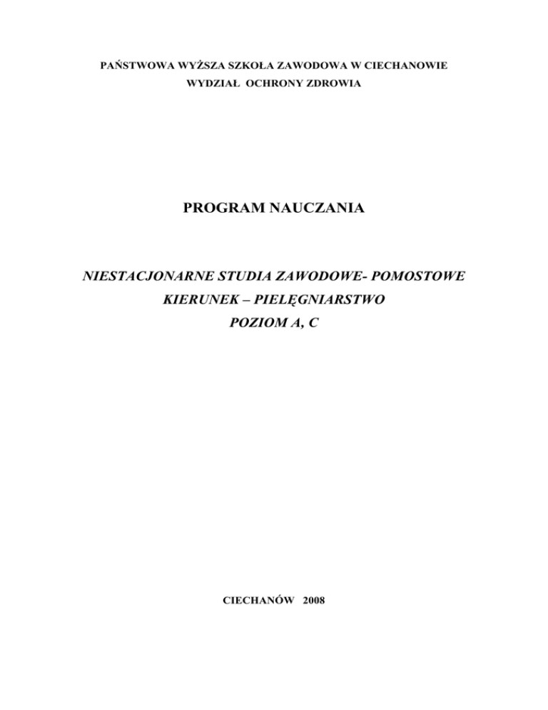 PAŃSTWOWA WYśSZA SZKOŁA ZAWODOWA W CIECHANOWIE WYDZIAŁ OCHRONY ZDROWIA PROGRAM NAUCZANIA NIESTACJONARNE STUDIA ZAWODOWE- POMOSTOWE KIERUNEK – PIELĘGNIARSTWO POZIOM A, C CIECHANÓW 2008 SPIS TREŚCI NAZWA PRZEDMIOTU ANATOMIA GENETYKA BIOCHEMIA I BIOFIZYKA FIZJOLOGIA PATOLOGIA MIKROBIOLOGIA I PARAZYTOLOGIA PSYCHOLOGIA SOCJOLOGIA PEDAGOGIKA RADIOLOGIA PODSTAWY PIELĘGNIARSTWA FILOZOFIA I ETYKA ZAWODU PIELĘGNIARKI ZDROWIE PUBLICZNE BADANIE FIZYKALNE PROMOCJA ZDROWIA PEDIATRIA I PIELĘGNIARSTWO PEDIATRYCZNE: PEDIATRIA PEDIATRIA I PIELĘGNIARSTWO PEDIATRYCZNE: PIELĘGNIARSTWO PEDIATRYCZNE INTERNA I PIELĘGNIARSTWO INTERNISTYCZNE: INTERNA INTERNA I PIELĘGNIARSTWO INTERNISTYCZNE: PIELĘGNIARSTWO INTERNISTYCZNE CHIRURGIA I PIELĘGNIARSTWO CHIRURGICZNE: CHIRURGIA CHIRURGIA I PIELĘGNIARSTWO CHIRURGICZNE: PIELĘGNIARSTWO CHIRURGICZNE BADANIA W PIELĘGNIARSTWIE BADANIA W PIELĘGNIARSTWIE: OCHRONA WŁASNOŚCI INTELEKTUALNEJ POŁOśNICTWO, GINEKOLOGIA I PIELĘGNIARSTWO POŁOZNICZO-GINEKOLOGICZNE: POŁOśNICTWO I GINEKOLOGIA POŁOśNICTWO, GINEKOLOGIA I PIELĘGNIARSTWO POŁOZNICZO-GINEKOLOGICZNE: PIELĘGNIARSTWO POŁOśNICZO-GINEKOLOGICZNE GERIATRIA I PIELĘGNIARSTWO GERIATRYCZNE: GERIATRIA GERIATRIA I PIELĘGNIARSTWO GERIATRYCZNE: PIELĘGNIARSTWO GERIATRYCZNE REHABILITACJA I PIELEGNOWANIE NIEPEŁNOSPRAWNYCH: REHABILITACJA REHABILITACJA I PIELEGNOWANIE NIEPEŁNOSPRAWNYCH: PIELĘGNOWANIE NIEPEŁNOSPRAWNYCH NEUROLOGIA I PIELĘGNIARSTWO NEUROLOGICZNE: NEUROLOGIA NEUROLOGIA I PIELĘGNIARSTWO NEUROLOGICZNE: PIELĘGNIARSTWO NEUROLOGICZNE PSYCHIATRIA I PIELĘGNIARSTWO PSYCHIATRYCZNE: PSYCHIATRIA PSYCHIATRIA I PIELĘGNIARSTWO PSYCHIATRYCZNE: PIELĘGNIARSTWO PSYCHIATRYCZNE ANESTEZJOLOGIA I PIELĘGNIARSTWO W ZAGROśENIU śYCIA: ANESTEZJOLOGIA ANESTEZJOLOGIA I PIELĘGNIARSTWO W ZAGROśENIU śYCIA: PIELĘGNIARSTWO W ZAGROśENIU śYCIA OPIEKA PALIATYWNA PODSTAWOWA OPIEKA ZDROWOTNA RATOWNICTWO MEDYCZNE TECHNOLOGIE INFORMACYJNE NR STRONY 1 3 5 7 9 12 14 17 19 21 24 26 29 34 36 39 42 44 46 48 50 52 54 57 59 62 64 66 68 70 72 75 77 80 83 85 88 90 93 Nazwa przedmiotu Anatomia Kod przedmiotu PIEL.ANA.PRISI Jednostka organizacyjna Wydział Ochrony Zdrowia Kierunek Pielęgniarstwo Rodzaj przedmiotu Podstawowy Okres realizacji przedmiotu Rok I, S I Typ zajęć Wykłady Liczba godzin dla poszczególnych poziomów A Rodzaj zaliczenia Autor programu Prowadzący zajęcia Koordynator przedmiotu B - C 50 D - Egzamin Prof. dr hab. med. Jan Kochanowski Cele dydaktyczno-wychowawcze przedmiotu : - zapoznanie z morfologią i topografią kości, mięśni, narządów wewnętrznych oraz układu nerwowego, - zwrócenie uwagi na unaczynienie i unerwienie omawianych struktur anatomicznych, - wykorzystanie zdobytej wiedzy w praktyce pielęgniarskiej i posługiwanie się mianownictwem anatomicznym, Treści kształcenia: 1. Podstawy embriologii i histologii. 2. Kości. Połączenie kości, stawy i wiązadła. 3. Mięśnie kończyn, tułowia i głowy. 4. Budowa mózgowia i rdzenia kręgowego. 5. Układ nerwowy obwodowy, schemat powstawania nerwu rdzeniowego, nerwy czaszkowe i rdzeniowe. 6. Drogi i ośrodki nerwowe. 7. Narządy zmysłów. 8. Serce. Główne tętnice i Ŝyły. KrąŜenie duŜe i małe. Drogi krąŜenia obocznego. 9. Układ chłonny - naczynia, budowa śledziony. 10. Gruczoły wewnętrznego wydzielania. 11. Klatka piersiowa, układ oddechowy, płuca, opłucna, drogi oddechowe. 12. Układ trawienny, budowa i stosunki topograficzne, unerwienie i unaczynienie. 13. Układ moczowo-płciowy, miednica mniejsza. 14. Otrzewna, zachyłki otrzewnej, przestrzeń zaotrzewnowa. 15. Anatomia topograficzna człowieka Ŝywego. 1 Metody nauczania: - wykład problemowy, - wykład podający, - dyskusja dydaktyczna, - film, - metoda programowana z uŜyciem komputera, - pokaz: ryciny, schematy, slajdy, pokaz multimedialny. Wyniki nauczania przedmiotu: Student na poziomie licencjata powinien: znać: - morfologię, topografię kości, mięśni, narządów wewnętrznych oraz układu nerwowego, a takŜe ich unaczynienie i unerwienie rozumieć: - postawy fizjologii organizmu ludzkiego umieć: - wskazać i opisać okolice, płaszczyzny i osie ciała ludzkiego - rozpoznawać narządy i posługiwać się mianownictwem anatomicznym Warunki zaliczenia przedmiotu : egzamin Literatura: 1. Bochenek A., Reichner M.: Anatomia człowieka. Tomy I-V. PZWL, Warszawa 1990-1997 2. Feneis H.: Ilustrowany słownik międzynarodowego nazewnictwa anatomicznego. PZWL, Warszawa 1986 3. Sobótka J.: Atlas anatomii człowieka. Tom I i II. Urban &Partner, Wrocław 1994 4. Sokołowska-Pituchowa J.: Anatomia człowieka. PZWL, Warszawa 1983 5. Urbanowicz Z. Podstawy anatomii człowieka. Tom I i II. Czelej. Lublin 2001 2 Nazwa przedmiotu Genetyka Kod przedmiotu PIEL.GEN.PRISI Jednostka organizacyjna Wydział Ochrony Zdrowia Kierunek Pielęgniarstwo Rodzaj przedmiotu Podstawowy Okres realizacji przedmiotu Rok I, S I Typ zajęć Wykłady Liczba godzin dla poszczególnych poziomów A Rodzaj zaliczenia B - C 10 Zaliczenie z oceną Autor programu Prowadzący zajęcia dr hab. BoŜena Cukrowska Koordynator przedmiotu dr hab. BoŜena Cukrowska D - Cele dydaktyczno-wychowawcze przedmiotu : - przekazanie wiedzy w zakresie podstawowych wiadomości tematycznych z następujących nauk medycznych, genetyka, embriologia, cytofizjiologia, immunologia, transplantologia - przekazanie podstawowych informacji w zakresie diagnostyki genetycznej i praktycznych wiadomości dotyczących patogenezy najczęstszych chorób genetycznych i wad wrodzonych - analizowanie problemów etycznych, prawnych i społecznych, wynikających z poznania genomu człowieka Treści kształcenia: 1. Wybrane zagadnienia z genetyki ogólnej oraz ich odniesienia do genetyki człowieka; prawa Mendla, genotyp i fenotyp, środowisko a zmienność organizmów (prawo Hardyego-Weinberga), choroby genetyczne człowieka ; klasyfikacja i epidemiologia. 2. Budowa i funkcja komórki: cykl komórkowy, starzenie i śmierć komórki mitoza 