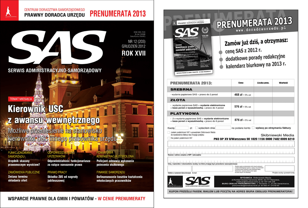 PRZEGL¥D LEGISLACYJNY TEMAT MIESIĄCA POWOWIATOWA ADMINISTRACJA ZESPOLONA 24 kierownik usc z awansu wewnętrznego Możliwe jest przeniesienie na stanowisko kierownika USC innego pracownika urzędu. 26 ODPOWIEDZIALNOŚĆ funkcjonariusza za rażące naruszeniE prawa Do pociągnięcia funkcjonariusza do odpowiedzialności wymagane jest nie tylko jego zawinione działanie lub zaniechanie, ale także stwierdzenie rażącego naruszenia przez organ prawa w postaci ostatecznej decyzji administracyjnej lub prawomocnego wyroku sądu. FINANSE SAMORZ¥DU spisowy 28 dodatek Dodatek spisowy, nie powinien zostać wypłacony, jeśli kto składa wniosek o udostępnienie danych Wniosek o udostępnienie danych z rejestru publicznego powinien podpisać prezydent miasta jako organ wykonawczy, a adresatem tego wniosku powinien być starosta. 15 Jednym z warunków, które musi spełniać pracownik samorządowy, jest brak skazania prawomocnym wyrokiem sądu za umyślne przestępstwo ścigane z oskarżenia publicznego lub umyślne przestępstwo skarbowe. Stwierdzenie zgodności miejscowego planu zagospodarowania przestrzennego ze studium uwarunkowań i kierunków zagospodarowania przestrzennego jest obligatoryjnym elementem tworzenia planu. Stwierdzenie zgodności nie musi jednak przybrać formy odrębnej uchwały. CZY WYROK JEST podstawą wpisu do księgi wieczystej? 35 brak możliwości odstąpienia od naliczania opłaty podwyższonej Obowiązujące regulacje nie przewidują możliwości odstąpienia od naliczenia opłaty podwyższonej, w tym w sytuacji, w której postępowanie prowadzone było przewlekle. 2 SERWIS ADMINISTRACYJNO-SAMORZ¥DOWY 45 48 prawo nauczyciela do urlopu dla poratowania zdrowia Warunkami nabycia prawa do urlopu dla poratowania zdrowia są: co najmniej 7-letni staż pracy w warunkach zatrudnienia na czas nieokreślony i w pełnym wymiarze czasu pracy oraz dalsze zatrudnienie na tych zasadach. Obecnie brak jest podstaw prawnych do zatrudnienia osoby na stanowisku kierownika GOZ na podstawie powołania. 50 37 38 adresat decyzji rozbiórkowej Decyzje dotyczące obiektów powstałych w warunkach samowoli budowlanej organ nadzoru budowlanego winien kierować w pierwszej kolejności do inwestora - jako sprawcy samowoli budowlanej. policjant odmawia wykonania polecenia służbowego Odmowa wykonania rozkazu lub polecenia służbowego jest naruszeniem dyscypliny służbowej. GRUDZIEŃ 2012 54 56 naliczanie odprawy emerytalnej nauczyciela 58 Podstawy wymiaru składek nie stanowią nagrody jubileuszowe, które według zasad przysługują pracownikowi nie częściej niż co 5 lat. Art. 42 Karty Nauczyciela jest podstawą, aby nauczyciel był do dyspozycji pracodawcy 40 godzin tygodniowo. zmiana terminu składania ofert W sytuacji wprowadzenia zmian istotnych w treści ogłoszenia o zamówieniu, zamawiający jest zobligowany do przedłużenia terminu składania ofert. możliwość dokonania zmiany umowy o zamówienie publiczne remonty bieżące dróg nie mogą być klasyfikowane jako usługi usuwania awarii Prace polegające na usuwaniu uszkodzeń i awarii dróg mieszczą się w definicji remontu, określonego w ustawie Prawo budowlane, a tym samym powinny być klasyfikowane jako roboty budowlane. 62 Wysokość odprawy liczy się tak, jak ekwiwalent pieniężny za urlop wypoczynkowy nauczycieli. składka zus od nagrody jubileuszowej dyspozycyjność nauczYCIELA Ustawa z dnia 29 stycznia 2004 r. Prawo zamówień publicznych w art. 144 ust. 1 zakazuje istotnych zmian postanowień zawartej umowy w stosunku do treści oferty. podwyżka WYNAGRODZENIA po powrocie z macierzyńskiego Odniesieniem dla określenia wysokości wynagrodzenia nie jest wynagrodzenie pobierane przed urlopem, lecz wynagrodzenie przysługujące aktualnie na stanowisku. Prawo do łączenia świadczenia emerytalnego z wynagrodzeniem z tytułu wykonywania pracy bez żadnych ograniczeń mają emeryci, którzy: osiągnęli podstawowy wiek emerytalny oraz rozwiązali stosunek pracy zawarty przed nabyciem prawa do emerytury. ZAMÓWIENIA PUBLICZNE konkurs na stanowisko kierownika goz Kwestie dotyczące lokali mieszkalnych dla strażaków w służbie państwowej reguluje rozdział 8 ustawy o Państwowej Straży Pożarnej. Gmina odzyskuje nieruchomość rolną od starostwa. 20 43 Uzasadnionym wydaje się być pogląd, że wskaźnik rewaloryzacji kwoty dofinansowania kosztów kształcenia jednego młodocianego pracownika wynosi co najmniej 105%. prawo DO zajmowania lokalu służbowego po śmierci strażaka 53 lekarz pełniący czasowo funkcję dyrektora szpitala nie może prowadzić prywatnej praktyki Dyrektor powinien otrzymywać wynagrodzenie miesięczne uwzględniające zakres jego obowiązków, w tym ewentualnie świadczenie usług zdrowotnych, tym niemniej bez możliwości uzyskania dodatkowego wynagrodzenia z tytułu pełnienia dyżurów lekarskich. 47 POWIATOWA ADMINISTRACJA ZESPOLONA bez obowiązku podjęcia odrębnej uchwały 18 41 nie był on ani ruchomym składnikiem wynagrodzenia, ani też nie została zawarta z pracownikiem umowa cywilnoprawna. kosztów kształcenia 30 dofinansowanie młodocianych pracowników urzędnik skazany prawomocnym wyrokiem? 17 zdolność procesowa wójta i rady gminy w sprawach ze skarg na uchwały rady gminy - uchwała nsa NSA stwierdził, że podmiotem władzy publicznej, posiadającym osobowość prawną, jest gmina. To ona zatem ma zdolność sądową w rozumieniu art. 25 § 1 ppsa. FUNKCJONOWANIE SAMORZ¥DU 13 samorządowe kolegium odwoławcze wydaje rozstrzygnięcie reformatoryjne wyjazdy pracownika do pracy w innej instytucji na obszarze gminy Nie będzie podróżą służbową wyjazd pracownika do innej miejscowości w sytuacji, gdy wyjazd ten należy do rutynowych obowiązków pracownika i pozostaje na obszarze wykonywania jego pracy. Zmiany postanowienia zarządu powiatu odnośnie uzgodnień w projekcie miejscowego planu zagospodarowania przestrzennego. ODPOWIEDZIALNOŒÆ URZÊDNIKÓW 11 63 64 ods