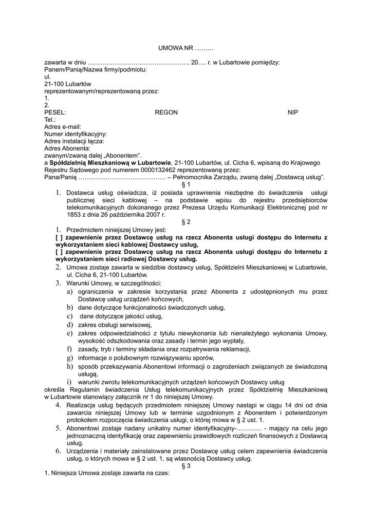 UMOWA NR ……… zawarta w dniu …………………………………………. 20…. r. w Lubartowie pomiędzy: Panem/Panią/Nazwa firmy/podmiotu: ul. 21-100 Lubartów reprezentowanym/reprezentowaną przez: 1. 2. PESEL: REGON NIP Tel.: Adres e-mail: Numer identyfikacyjny: Adres instalacji łącza: Adres Abonenta: zwanym/zwaną dalej „Abonentem”. a Spółdzielnią Mieszkaniową w Lubartowie, 21-100 Lubartów, ul. Cicha 6, wpisaną do Krajowego Rejestru Sądowego pod numerem 0000132462 reprezentowaną przez: Pana/Panią …………………………………… – Pełnomocnika Zarządu, zwaną dalej „Dostawcą usług”. §1 1. Dostawca usług oświadcza, iż posiada uprawnienia niezbędne do świadczenia usługi publicznej sieci kablowej – na podstawie wpisu do rejestru przedsiębiorców telekomunikacyjnych dokonanego przez Prezesa Urzędu Komunikacji Elektronicznej pod nr 1853 z dnia 26 października 2007 r. §2 1. Przedmiotem niniejszej Umowy jest: [ ] zapewnienie przez Dostawcę usług na rzecz Abonenta usługi dostępu do Internetu z wykorzystaniem sieci kablowej Dostawcy usług, [ ] zapewnienie przez Dostawcę usług na rzecz Abonenta usługi dostępu do Internetu z wykorzystaniem sieci radiowej Dostawcy usług. 2. Umowa zostaje zawarta w siedzibie dostawcy usług, Spółdzielni Mieszkaniowej w Lubartowie, ul. Cicha 6, 21-100 Lubartów. 3. Warunki Umowy, w szczególności: a) ograniczenia w zakresie korzystania przez Abonenta z udostępnionych mu przez Dostawcę usług urządzeń końcowych, b) dane dotyczące funkcjonalności świadczonych usług, c) dane dotyczące jakości usług, d) zakres obsługi serwisowej, e) zakres odpowiedzialności z tytułu niewykonania lub nienależytego wykonania Umowy, wysokość odszkodowania oraz zasady i termin jego wypłaty, f) zasady, tryb i terminy składania oraz rozpatrywania reklamacji, g) informacje o polubownym rozwiązywaniu sporów, h) sposób przekazywania Abonentowi informacji o zagrożeniach związanych ze świadczoną usługą, i) warunki zwrotu telekomunikacyjnych urządzeń końcowych Dostawcy usług określa Regulamin świadczenia Usług telekomunikacyjnych przez Spółdzielnię Mieszkaniową w Lubartowie stanowiący załącznik nr 1 do niniejszej Umowy. 4. Realizacja usług będących przedmiotem niniejszej Umowy nastąpi w ciągu 14 dni od dnia zawarcia niniejszej Umowy lub w terminie uzgodnionym z Abonentem i potwierdzonym protokołem rozpoczęcia świadczenia usługi, o której mowa w § 2 ust. 1. 5. Abonentowi zostaje nadany unikalny numer identyfikacyjny-………… - mający na celu jego jednoznaczną identyfikację oraz zapewnieniu prawidłowych rozliczeń finansowych z Dostawcą usług. 6. Urządzenia i materiały zainstalowane przez Dostawcę usług celem zapewnienia świadczenia usług, o których mowa w § 2 ust. 1, są własnością Dostawcy usług. §3 1. Niniejsza Umowa zostaje zawarta na czas: 1) nieokreślony; 2) określony/ …… miesięcy, po upływie którego wiąże strony na czas nieokreślony, o ile Abonent nie później niż na 14 dni przed upływem terminu obowiązywania Umowy nie złoży innego oświadczenia woli. 2. Na wniosek każdej ze stron, Umowa może być rozwiązana z zachowaniem 1-miesięcznego okresu wypowiedzenia, ze skutkiem na koniec miesiąca kalendarzowego. W okresie wypowiedzenia opłaty wynikające z postanowień niniejszej Umowy są naliczane na dotychczasowych zasadach. §4 1.W ramach usługi dostępu do Internetu z wykorzystaniem sieci kablowej Dostawcy usług lub dostępu do Internetu z wykorzystaniem sieci radiowej Dostawcy usług zobowiązuje się on w szczególności do: 1) wykonania u Abonenta przyłącza do sieci kablowej lub radiowej przy użyciu którego będzie świadczona usługa dostępu do Internetu z pakietem ………………………………………………. 2) dołożenia należytej staranności w przedmiocie zabezpieczenia danych Abonenta przechowywanych na serwerach Dostawcy usług przed dostępem osób trzecich. 2.Pakiet, o którym mowa w ust. 1 pkt 1, wybrany przez Abonenta, stanowi podstawę naliczenia opłaty abonamentowej, o której mowa w § 6 pkt 2, zgodnie z obowiązującym cennikiem stanowiącym załącznik nr 2 do niniejszej Umowy. §5 W ramach usługi dostępu do Internetu z wykorzystaniem sieci kablowej Dostawcy usług lub dostępu do Internetu z wykorzystaniem sieci radiowej Dostawcy usług Abonent zobowiązuje się do: 1) korzystania wyłącznie z urządzenia końcowego dostarczonego przez Dostawcę usług, 2) przestrzegania Netykiety, dostępnej na stronie www.smlubartow.pl, 3) eksploatacji sprzętu oraz osprzętu bez wprowadzania jakichkolwiek zmian i poprawek do zainstalowanego przyłącza transmisji danych, 4) udostępnienia lokalu/budynku w zakresie niezbędnym do wykonania instalacji, a także w celu dokonania konserwacji, napraw i modernizacji sieci – pod rygorem rozwiązania Umowy przez Dostawcę usług ze skutkiem natychmiastowym, 5) niezwłocznego zgłaszania awarii i usterek Dostawcy usług, 6) poinformowania Dostawcy usług w terminie 14 dni o wszelkich zmianach danych, których ujawnienie wymagane jest przy zawarciu Umowy lub ma wpływ na jej wykonywanie, m. in. o utracie przysługującego jemu lub osobie, która udzieliła mu zgody na zawarcie Umowy tytułu prawnego do lokalu, a także w celu umożliwienia Dostawcy usług doręczania korespondencji. §6 1. Płatności. Abonent zobowiązuje się do regulowania następujących opłat: 1) opłaty za doprowadzenie sygnału Internetu, jednorazowo w kwocie ………….. zł. brutto; 2. 3. 4. 5. 6. płatnej w dniu zawarcia Umowy. Opłata ta nie podlega zwrotowi z wyjątkiem przypadku, kiedy usługa nie może być świadczona z przyczyn technicznych występujących po stronie Abonenta lub Dostawcy usług, 2) opłaty abonamentowej (abonamentu). Abonament zawiera koszty utrzymania łącza i dostępu do wybranych pakietów oraz podatek VAT. Abonament naliczany jest miesięcznie