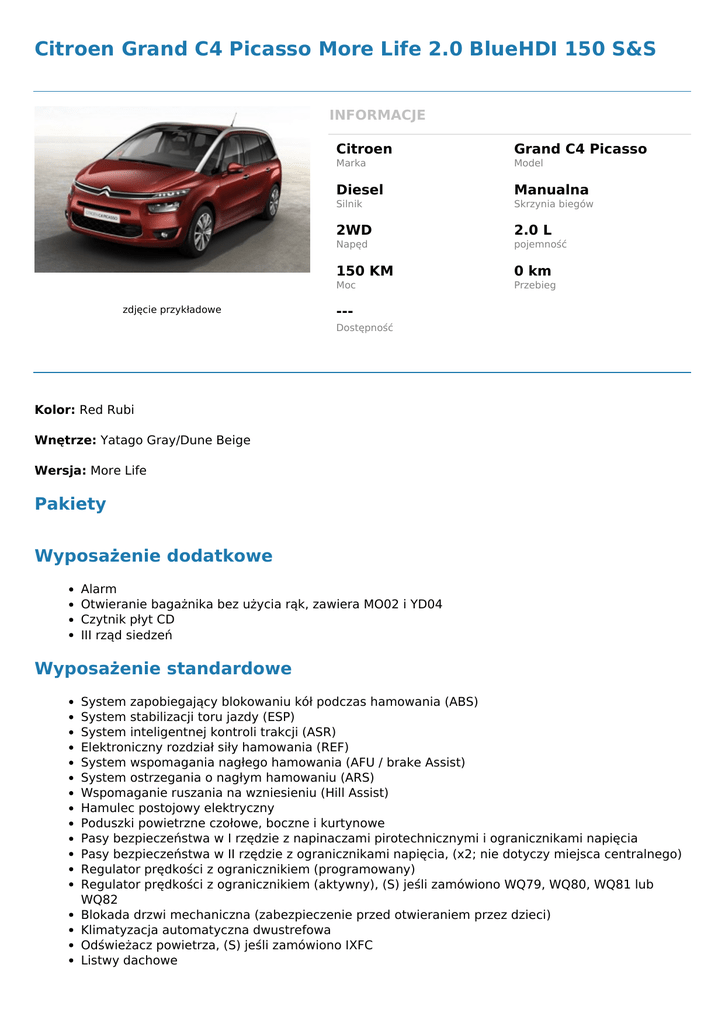 Citroen Grand C4 Picasso More Life 2.0 BlueHDI 150 S&S INFORMACJE zdjęcie przykładowe Citroen Grand C4 Picasso Marka Model Diesel Manualna Silnik Skrzynia biegów 2WD 2.0 L Napęd pojemność 150 KM 0 km Moc Przebieg --Dostępność Kolor: Red Rubi Wnętrze: Yatago Gray/Dune Beige Wersja: More Life Pakiety Wyposażenie dodatkowe Alarm Otwieranie bagażnika bez użycia rąk, zawiera MO02 i YD04 Czytnik płyt CD III rząd siedzeń Wyposażenie standardowe System zapobiegający blokowaniu kół podczas hamowania (ABS) System stabilizacji toru jazdy (ESP) System inteligentnej kontroli trakcji (ASR) Elektroniczny rozdział siły hamowania (REF) System wspomagania nagłego hamowania (AFU / brake Assist) System ostrzegania o nagłym hamowaniu (ARS) Wspomaganie ruszania na wzniesieniu (Hill Assist) Hamulec postojowy elektryczny Poduszki powietrzne czołowe, boczne i kurtynowe Pasy bezpieczeństwa w I rzędzie z napinaczami pirotechnicznymi i ogranicznikami napięcia Pasy bezpieczeństwa w II rzędzie z ogranicznikami napięcia, (x2; nie dotyczy miejsca centralnego) Regulator prędkości z ogranicznikiem (programowany) Regulator prędkości z ogranicznikiem (aktywny), (S) jeśli zamówiono WQ79, WQ80, WQ81 lub WQ82 Blokada drzwi mechaniczna (zabezpieczenie przed otwieraniem przez dzieci) Klimatyzacja automatyczna dwustrefowa Odświeżacz powietrza, (S) jeśli zamówiono IXFC Listwy dachowe Szyba przednia akustyczna i atermiczna Szyba wsteczna podgrzewana Latarka, (S) jeśli zamówiono III rząd siedzeń Szyby boczne wielowarstwowe laminowane, (S) jeśli zamówiono UN01 Lusterka boczne z kierunkowskazami LED Lusterka boczne regulowane elektrycznie i podgrzewane Lusterka boczne składane elektrycznie, (S) jeśli zamówiono WY07 Lusterko wewnętrzne z funkcją dzień/noc, regulacja manualna Lusterko wewnętrzne elektrochromatyczne, (S) jeśli zamówiono WQ78 lub WQ82 Reflektory przednie halogenowe Światła do jazdy dziennej LED przód Światła do jazdy dziennej automatyczne Funkcja "Follow me home" Reflektory przednie przeciwmgłowe, (S) jeśli zamówiono LA04 Reflektory przednie przeciwmgłowe, z funkcją statycznego doświetlania zakrętów Automatyczna zmiana świateł, (S) z pakietem Drive Assist Czujnik Deszczu Radio NAC2 Nav Connect 3D Tri-Tuner, Mirror Link, BT, Ekran dotykowy 7", ekran 12" HD Citroën Connect box: Połączenie alarmowe z lokalizacją + połączenie z assistance z lokalizacją zestaw głośnomówiący bluetooth, z funkcją streamingu muzyki) Złącze jack Port USb Gniazdo 12V w konsoli centralnej Gniazdo 12V w II rzędzie Gniazdo 12V w przestrzeni bagażowej Schowek podświetlany i wentylowany Schowek pod fotelem kierowcy, (S) element niedostępny z tapicerką skórzaną Schowek pod fotelem pasażera, (S) element niedostępny z tapicerką skórzaną Konsola centralna w I rzędzie (wyjmowana), (S) dla wersji ze skrzynią EAT6 Konsola centralna w I rzędzie, zasuwana z uchwytami na napoje Fotel kierowcy regulowany manualnie (regulacja wzdłużna, pochylenia i wysokości) Fotel pasażera regulowany manualnie (regulacja wzdłużna, wysokości siedziska, pochylenia oparcia) Stolik w oparciach przednich foteli Fotel pasażera składany na płasko, (S) jeśli zamówiono NA01 lub XJ02 Podłokietniki w I rzędzie Fotele w II rzędzie niezależne (x3) Regulacja wzdłużna II rzędu siedzeń, (S) jeśli zamówiono AN01 Obręcze aluminiowe 16" Notos Czujnik ciśnienia w ogumieniu zestaw naprawczy id: 5716 Powered by TCPDF (www.tcpdf.org)