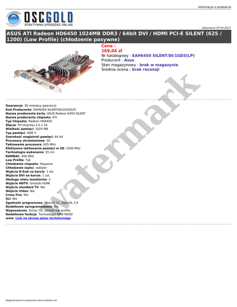 Informacje o produkcie Utworzono 07-03-2017 ASUS ATI Radeon HD6450 1024MB DDR3 / 64bit DVI / HDMI PCI-E SILENT (625 / 1200) (Low Profile) (chłodzenie pasywne) Cena : 169,04 zł er m ar k Nr katalogowy : EAH6450 SILENT/DI/1GD3(LP) Producent : Asus Stan magazynowy : brak w magazynie Średnia ocena : brak recenzji w at Gwarancja: 36 miesięcy gwarancji Kod Producenta: EAH6450 SILENT/DI/1GD3(LP) Nazwa producenta karty: ASUS Radeon 6450 SILENT Nazwa producenta chipsetu: ATI Typ Chipsetu: Radeon HD6450 Złącze: PCI-Express 2.0 x 16 Wielkość pamięci: 1024 MB Typ pamięci: DDR 3 Szerokość magistrali pamięci: 64 bit Procesory strumieniowe: 50 Taktowanie procesora: 625 MHz Efektywne taktowanie pamięci w 3D: 1200 MHz Technologia wykonania: 55 nm RAMDAC: 400 MHz Low Profile: Tak Chłodzenie chipsetu: Pasywne Chłodzenie (opis): radiator Wyjścia D-Sub na karcie: 1 szt. Wyjścia DVI na karcie: 1 szt. Obsługa wielu monitorów: 2 Wyjście HDTV: Gniazdo HDMI Wyjście standard TV: Nie Wejście Video: Nie Cross Fire: Nie SLI: Nie Zgodność programowa: DirectX 11, OpenGL 2.0 Dodatkowe oprogramowanie: Nie Wyposażenie: Driver CD, śledzik low profile. Dodatkowe funkcje: Technologia AMD HD3D www: Link na stronę opisu technicznego Wygenerowano w programie www.oscGold.com