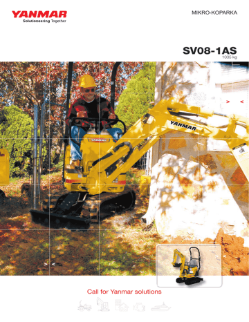 MIKRO-KOPARKA SV08-1AS 1035 kg Call for Yanmar solutions KOMPAKTOWOŚĆ SV08-1AS Przedstawiamy prosty i efektywny sposób na pracę w pomieszczeniach zamkniętych. SV08-1AS to wytrwały robotnik, stworzony do pracy w wąskich przestrzeniach takich jak fundamenty, wnętrza budynków oraz do kładzenia rur czy kształtowania krajobrazu. Min. promień obrotu wysięgnika: 950 mm Zupełnie nowa jakość w smukłej i kompaktowej obudowie Wyjątkowo mały promień obrotu rufy Niezwykle kompaktowy korpus sprawia, że podczas obrotu przy max. szerokości rufa wystaje tylko o 305 mm jeszcze bardziej poprawiając wydajność pracy w wąskich przesmykach. Kompaktowe wymiary > Min. promień obrotu wysięgnika: 950 mm. > Promień obrotu rufy: 725 mm. Prosty w obsłudze rozkładany lemiesz Występ rufy: 305 mm 725 mm Regulowana szerokość podwozia 680 mm 840 mm Zsunięte podwozie dla lepszej manewrowości Rozsunięte podwozie dla lepszej stabilności Prosty w obsłudze rozkładany lemiesz > Rozszerzenia są na stałe przymocowane do lemiesza. > Zarówno do złożenia jak i rozłożenia nie potrzeba narzędzi. > Nie ma ryzyka zgubienia rozszerzeń lemiesza. W zależności od dostępnego miejsca SV08-1AS jest w stanie regulować szerokość podwozia w zakresie od 680 do 840 mm. DUŻA WYDAJNOŚĆ SV08-1AS Osłona siłownika na wysięgniku Wyposażenie robocze > Jedno lub dwufunkcyjny dodatkowy obwód (PTO) umożliwiający podłączenie szerokiej gamy akcesoriów (pływające łyżki skarpowe...). > Blokada pedału umożliwiająca pracę z ręcznymi narzędziami hydraulicznymi. > Osłona siłownika na wysięgniku. > Doskonała ochrona przewodów hydraulicznych przy siłownikach łyżki i ramienia. Nowa generacja silników Yanmar serii TE, jeszcze bardziej przyjaznych środowisku i bardziej cichych > W pełni zgodny z europejską normą emisji spalin Stage II (dyrektywa 97/68/EC) oraz amerykańską normą Tier 2. > Niskoobrotowy – zwiększona żywotność. > Pojemny filtr powietrza. > Wydajny i odporny akumulator. > Cichy. Rolki gąsienic > Podwójne boczne podpory rolkowe: mniejsze zużycie gąsienic i lepsza stabilność. > System mocowania rolek redukujący wibracje w czasie jazdy. KOMFORT I BEZPIECZEŃSTWO SV08-1AS Zapewnione przez szereg ułatwień obejmujących wygodny fotel z pasem bezpieczeństwa, podnóżek czy nieskomplikowany układ dźwigni zapewniających precyzyjną kontrolę. Ergonomiczna pozycja podczas pracy > Osobne pedały dla 3-go obwodu hydraulicznego oraz obrotu wysięgnika. > Oba pedały można złożyć uzyskując więcej przestrzeni dla stóp. > Pełen monitoring z alarmem bezpieczeństwa. > Wejście do maszyny z obu stron. Składane pedały (sterowanie PTO i obrót wysięgnika) Możliwe podnoszenie Składane do tyłu Rama zabezpieczająca w czasie wywrotki w standardzie > System ROPS z pasem bezpieczeństwa. > Możliwe łatwe złożenie ramy do tyłu, bez potrzeby użycia jakichkolwiek specjalnych narzędzi, umożliwiające przejazd pod niskim stropem. > Nieskomplikowana obsługa serwisowa dzięki otwieranej dużej pokrywie. Bezpieczeństwo operatora Dźwignia bezpieczeństwa Barierka zabezpieczająca > Ucho na wysięgniku umożliwiające podnoszenie maszyny. > Dźwignia bezpieczeństwa blokująca cztery główne funkcje maszyny. > Barierka zabezpieczająca w przedniej części maszyny. > Przeciwwaga chroniąca tył maszyny. NIEZAWODNOŚĆ I DOSTĘPNOŚĆ SV08-1AS Efektywne rozwiązania zabezpieczające > Centralne prowadzenie przewodów elastycznych eliminujące problemy z ich skręcaniem. > Przewody elastyczne zabezpieczone zewnętrznymi osłonami. > Przewody hydrauliczne silnika obrotu chronione stalowymi osłonami. > Dla ochrony przed uszkodzeniem przewody hydrauliczne mocowane są pod siłownikami. > Siłownik hydrauliczny lemiesza schowany pod osłoną. Rama nadwozia wykonana z jednego odlewu zapewniając lepszą stabilność i większą trwałość. Wygodny dostęp ułatwiający obsługę serwisową DANE TECHNICZNE SV08-1AS Silnik 2 cylindrowy wysokoprężny Yanmar.......................................................... 2TE67L-BV3 Moc .................................................................................... 7.5 kw / 10.2 HP / 2400 rpm Pojemność .........................................................................................................507 cm3 Max. moment ................................................................................ 31.5 N.m. / 2000 rpm Układ hydrauliczny Pojemność układu ................................................................................................ 10.7 l Max. ciśnienie....................................................................................................185 bar 2 pompy zębate .......................................................................................... 2 x 9.8 l/mn Osiągi Prędkość przejazdowa .................................................................................... 1.8 km/h Prędkość obrotu ................................................................................................8.4 rpm Siła kopania (ramię/łyżka) ...................................................................... 600 / 1015 kgf Obrót wysięgnika (L/P) ....................................................................................45° / 85° Nacisk na podłoże ...................................................................................... 0.28 kg/cm2 Max. nachylenie terenu ........................................................................................... 30° Szerokość gąsienic ..........................................................................................180 mm Prześwit ............................................................................................................130 mm Lemiesz (szerokość x wysokość) .................................................. 680 / 840 x 180 mm Obsługa Pojemność zbiornika paliwa ...................