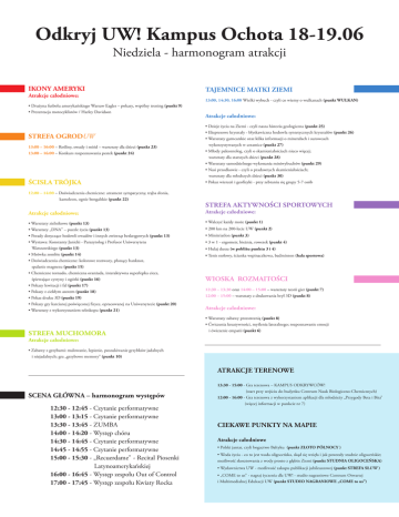 Odkryj UW! Kampus Ochota 18-19.06 Niedziela - harmonogram atrakcji IKONY AMERYKI Atrakcje całodniowe: TAJEMNICE MATKI ZIEMI 13:00, 14:30, 16:00 Wielki wybuch - czyli co wiemy o wulkanach (punkt WULKAN) • Drużyna futbolu amerykańskiego Warsaw Eagles – pokazy, wspólny trening (punkt 9) • Prezentacja motocyklistów / Harley Davidson Atrakcje całodniowe: • Dzieje życia na Ziemi - czyli nasza historia geologiczna (punkt 25) STREFA OGRODUW 13:00 – 16:00 – Rośliny, owady i miód – warsztaty dla dzieci (punkt 23) 13:00 – 16:00 – Konkurs rozpoznawania pestek (punkt 24) • Ekspresowe kryształy - błyskawiczna hodowla syntetycznych kryształów (punkt 26) • Warsztaty garncarskie oraz kilka informacji o minerałach i surowcach wykorzystywanych w ceramice (punkt 27) • Młody paleontolog, czyli o skamieniałościach nieco więcej; warsztaty dla starszych dzieci (punkt 28) • Warsztaty samodzielnego wykonania miniwybuchów (punkt 29) • Nasi przodkowie - czyli o pradawnych skamieniałościach; ŚCISŁA TRÓJKA warsztaty dla młodszych dzieci (punkt 30) • Pokaz wierceń i geofizyki - przy zebraniu się grupy 5-7 osób 12:00 – 14:00 – Doświadczenia chemiczne: atrament sympatyczny, trąba słonia, kameleon, ognie bengalskie (punkt 22) STREFA AKTYWNOŚCI SPORTOWYCH Atrakcje całodniowe: Atrakcje całodniowe: • Warsztaty zielnikowe (punkt 13) • Walczyć każdy może (punkt 1) • Warsztaty „DNA” – puzzle życia (punkt 13) • 200 km na 200-lecie UW (punkt 2) • Porady dotyczące hodowli owadów i innych zwierząt bezkręgowych (punkt 13) • Minitriatlon (punkt 3) • Wystawa: Konstanty Janicki - Parazytolog i Profesor Uniwersytetu • 3 w 1 - ergometr, bieżnia, rowerek (punkt 4) Warszawskiego (punkt 13) • Mrówka zombie (punkt 14) • Doświadczenia chemiczne: kolorowe roztwory, płonący banknot, • Hulaj dusza (w pobliżu punktu 3 i 4) • Tenis stołowy, ścianka wspinaczkowa, badminton (hala sportowa) spalanie magnezu (punkt 15) • Chemiczne tornado, chemiczna oranżada, interaktywna superlepka ciecz, śpiewające cytryny i ogórki (punkt 16) • Pokazy lewitacji i fal (punkt 17) • Pokazy z ciekłym azotem (punkt 18) • Pokaz druku 3D (punkt 19) • Pokazy gry karcianej poświęconej fizyce, opracowanej na Uniwersytecie (punkt 20) • Warsztaty z wykorzystaniem teleskopu (punkt 21) WIOSKA ROZMAITOŚCI 12:30 – 13:30 oraz 14:00 – 15:00 – warsztaty teorii gier (punkt 7) 12:00 – 15:00 – warsztaty z drukowania brył 3D (punkt 8) Atrakcje całodniowe: • Warsztaty zabawy przestrzenią (punkt 8) • Ćwiczenia kreatywności, myślenia lateralnego; rozpoznawanie emocji STREFA MUCHOMORA i ćwiczenie empatii (punkt 6) Atrakcje całodniowe: • Zabawy z grzybami: malowanie, lepienie, poszukiwanie grzybków jadalnych i niejadalnych; gra „grzybowe memory” (punkt 10) ATRAKCJE TERENOWE SCENA GŁÓWNA – harmonogram występów 12:30 - 12:45 - Czytanie performatywne 13:00 - 13:15 - Czytanie performatywne 13:30 - 13:45 - ZUMBA 14:00 - 14:20 - Występ chóru 14:30 - 14:45 - Czytanie performatywne 14:45 - 14:55 - Czytanie performatywne 15:00 - 15:30 - „Recuerdame" - Recital Piosenki Latynoamerykańskiej 16:00 - 16:45 - Występ zespołu Out of Control 17:00 - 17:45 - Występ zespołu Kwiaty Rocka 13:30 - 15:00 - Gra terenowa – KAMPUS ODKRYWCÓW! (start przy wejściu do budynku Centrum Nauk Biologiczno-Chemicznych) 12:00 - 16:00 - Gra terenowa z wykorzystaniem aplikacji dla młodzieży „Przygody Beta i Bita” (więcej informacji w punkcie nr 7) CIEKAWE PUNKTY NA MAPIE Atrakcje całodniowe • Polski jantar, czyli bogactwo Bałtyku (punkt ZŁOTO PÓŁNOCY ) • Woda życia - co to jest woda oligoceńska, skąd się wzięła i jak powstały studnie oligoceńskie; możliwość skosztowania z wody prosto z głębin Ziemi (punkt STUDNIA OLIGOCEŃSKA) • Wydawnictwa UW - możliwość zakupu publikacji jubileuszowej (punkt STREFA SŁUW ) • „COME to us” - nagraj życzenia dla UW! - studio nagraniowe Centrum Otwartej i Multimedialnej Edukacji UW (punkt STUDIO NAGRANIOWE „COME to us”)