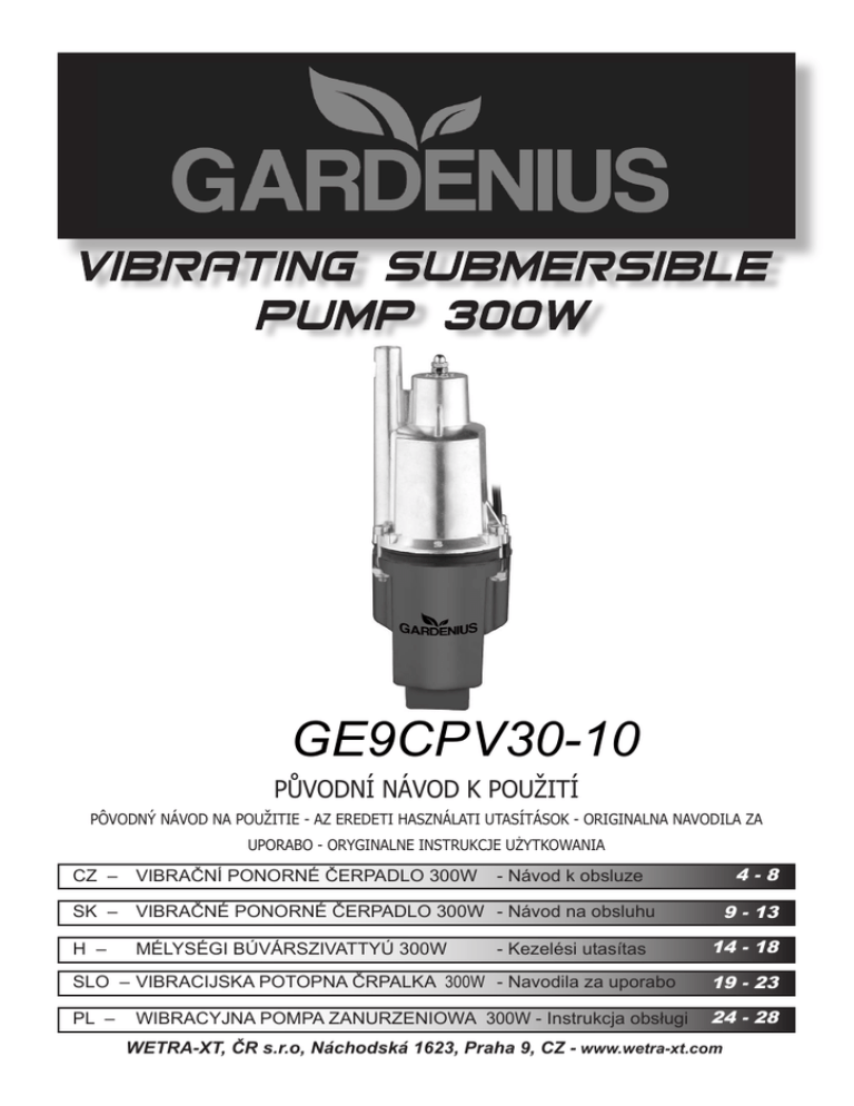 GE9CPV30-10 PŮVODNÍ NÁVOD K POUŽITÍ PÔVODNÝ NÁVOD NA POUŽITIE - Az eredeti használati utasítások - Originalna navodila za uporabo - Oryginalne instrukcje użytkowania 4-8 CZ – Vibrační ponorné čerpadlo 300W - Návod k obsluze 9 - 13 SK – Vibračné ponorné čerpadlo 300W - Návod na obsluhu H – Mélységi búvárszivattyú 300W - Kezelési utasítas 14 - 18 SLO – Vibracijska potopna črpalka 300W - Navodila za uporabo 19 - 23 PL – Wibracyjna pompa zanurzeniowa 300W - Instrukcja obsługi 24 - 28 WETRA-XT, ČR s.r.o, Náchodská 1623, Praha 9, CZ - www.wetra-xt.com SYMBOLS Nářadí je určeno pouze pro domácí - hobby použití. Náradie je určené iba pre domáce - hobby použitie. A szerszám célja az otthoni - hobby használatra. Orodje je namenjeno izključno za domačo ali hobi uporabo. Narzędzie jest przeznaczone jedynie do użycia domowego lub hobbystycznego. Před prvním použitím si pročtěte návod k obsluze Pred prvím použitím si prečítajte návod na použitie Beüzemelés előtt olvassa el a használati utasítást Pred prvo uporabo preberite navodila za uporabo! Przed pierwszym użyciem uważnie przeczytaj instrukcję obsługi. Nebezpečí Nebezpečie Figyelmeztetés Nevarnost! Niebezpieczeństwo Používejte ochranu sluchu Používajte ochranu sluchu Használjon fülvédőt Uporabljajte zaščitna sredstva za varovanje sluha! Używaj środków ochrony słuchu Používejte ochranu zraku Používajte ochranu zraku Használjon védőszemüveget Uporabljajte zaščitna sredstva za varovanje vida! Używaj środków ochrony wzroku Používejte Ochrannou dýchací roušku Používajte ochrannú dýchaciu rúžku Használjon porvédő maszkot Uporabljajte zaščitno dihalno masko! Używaj maski ochronnej Vyjměte zástrčku ze zásuvky okamžitě, pokud je kabel poškozen Vyberte zástrčku zo zásuvky okamžite, ak je kábel poškodený Vegye ki a hálózati csatlakozót azonnal, ha a kábel sérült Napravo takoj, če je kabel poškodovan, ga iztaknite Odłączyć urządzenie od razu, jeśli kabel jest uszkodzony Dvojitá izolace Dvojitá izolácia Dupla szigetelés Dvojna izolacija. Podwójna izolacja cd cd cd cd cd cd Originální návod CZ AE9CPV30 - Vibrační ponor né čerpadlo 300W OBECNÉ BEZPEČNOSTNÍ POKYNY Tyto bezpečnostní pokyny si pečlivě prostudujte, zapamatujte a uschovejte UPOZORNĚNÍ: Při používání elektrických strojů a elektrického nářadí je nutno respektovat a dodržovat následující bezpečnostní pokyny z důvodů ochrany před úrazem elektrickým proudem, zraněním osob a nebezpečím vzniku požáru. Výrazem „elektrické nářadí“ je ve všech níže uvedených pokynech myšleno jak elektrické nářadí napájené ze sítě (napájecím kabelem), tak nářadí napájené z baterií (bez napájecího kabelu). Uschovejte všechna varovaní a pokyny pro příští použití. došlo k jeho řádnému připojení a používání. Použití těchto zařízení může omezit nebezpečí vznikající prachem. h)Pevně upevněte obrobek. Použijte truhlářskou svěrku nebo svěrák pro upevnění dílu, který budete obrábět. i)Nepoužívejte elektrické nářadí pokud jste pod vlivem alkoholu, drog, léků nebo jiných omamných či návykových látek. j) Toto zařízení není určené pro použití osobami (včetně dětí) se sníženými fyzickými, smyslovými nebo mentálními schopnostmi nebo s nedostatkem zkušeností a znalostí, pokud nejsou pod dozorem nebo nedostali pokyny s ohledem na použiti zařízení od osoby zodpovědné za jejich bezpečnost. Děti musí být pod dozorem, aby jste se ujistili, že si nehrají se zařízením. 4. Používání elektrického nářadí a jeho údržba a)El. nářadí vždy odpojte z el. sítě v případě jakéhokoliv problému při práci, před každým čistěním nebo údržbou, při každém přesunu a po ukončení práce! Nikdy nepracujte s el. nářadím, pokud je jakýmkoliv způsobem poškozené. b)Pokud začne nářadí vydávat abnormální zvuk nebo zápach, okamžitě ukončete práci. c)Elektrické nářadí nepřetěžujte. Elektrické nářadí bude pracovat lépe a bezpečněji, pokud jej budete provozovat v otáčkách, pro které bylo navrženo. Používejte správné nářadí, které je určeno pro danou činnost. Správné nářadí bude lépe a bezpečněji vykonávat práci, pro kterou bylo zkonstruováno. d)Nepoužívejte elektrické nářadí, které nelze bezpečně zapnout a vypnout ovládacím spínačem. Používání takového nářadí je nebezpečné. Vadné spínače musí být opraveny certifikovaným servisem. e)Odpojte nářadí od zdroje elektrické energie předtím, než začnete provádět jeho seřizování, výměnu příslušenství nebo údržbu. Toto opatření zamezí nebezpečí náhodného spuštění. f)Nepoužívané elektrické nářadí ukliďte a uschovejte tak, aby bylo mimo dosah dětí a nepovolaných osob. Elektrické nářadí v rukou nezkušených uživatelů může být nebezpečné. Elektrické nářadí skladujte na suchém a bezpečném místě. g)Udržujte elektrické nářadí v dobrém stavu. Pravidelně kontrolujte seřízení pohybujících se částí a jejich pohyblivost. Kontrolujte zda nedošlo k poškození ochranných krytů nebo jiných částí, které mohou ohrozit bezpečnou funkci elektrického nářadí. Je-li nářadí poškozeno, před dalším použitím zajistěte jeho řádnou opravu. Mnoho úrazů je způsobeno špatně udržovaným elektrickým nářadím. h)Řezací nástroje udržujte ostré a čisté. Správně udržované a naostřené nástroje usnadňují práci, omezují nebezpečí zranění a práce s nimi se snáze kontroluje. Použití jiných příslušenství než těch, která jsou uvedena v návodu k obsluze mohou způsobit poškození nářadí a být příčinou zranění. i)Elektrické nářadí, příslušenství, pracovní nástroje atd