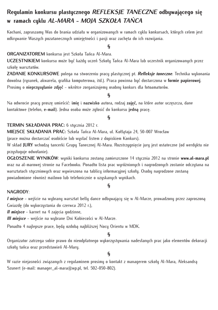 Regulamin konkursu plastycznego REFLEKSJE TANECZNE odbywaj¹cego siê w ramach cyklu AL-MARA - MOJA SZKO£A TAÑCA Kochani, zapraszamy Was do brania udzia³u w organizowanych w ramach cyklu konkursach, których celem jest odkrywanie Waszych pozatanecznych umiejêtnoœci i pasji oraz zachêta do ich rozwijania. § ORGANIZATOREM konkursu jest Szko³a Tañca Al-Mara. UCZESTNIKIEM konkursu mo¿e byæ ka¿dy uczeñ Szko³y Tañca Al-Mara lub uczestnik organizowanych przez szko³ê warsztatów. ZADANIE KONKURSOWE polega na stworzeniu pracy plastycznej pt. Refleksje taneczne. Technika wykonania dowolna (rysunek, akwarela, grafika komputerowa, itd.). Praca powinna byæ dostarczona w formie papierowej. Prosimy o nieprzysy³anie zdjêæ - wkrótce zorganizujemy osobny konkurs dla fotoamatorów. § Na odwrocie pracy proszê umieœciæ: imiê i nazwisko autora, rodzaj zajêæ, na które autor uczêszcza, dane kontaktowe (telefon, e-mail). Jedna osoba mo¿e zg³osiæ do konkursu jedn¹ pracê. § TERMIN SK£ADANIA PRAC: 6 stycznia 2012 r. MIEJSCE SK£ADANIA PRAC: Szko³a Tañca Al-Mara, ul. Ko³³¹taja 24, 50-007 Wroc³aw (prace mo¿na dostarczaæ osobiœcie lub wys³aæ listem z dopiskiem Konkurs). W sk³ad JURY wchodz¹ tancerki Grupy Tanecznej Al-Mara. Rozstrzygniêcie jury jest ostateczne (od werdyktu nie przys³uguje odwo³anie). OG£OSZENIE WYNIKÓW: wyniki konkursu zostan¹ zamieszczone 14 stycznia 2012 na stronie www.al-mara.pl oraz na al-marowej stronie na Facebooku. Ponadto lista prac wyró¿nionych i nagrodzonych zostanie odczytana na warsztatach styczniowych oraz wywieszona na tablicy informacyjnej szko³y. Osoby nagrodzone zostan¹ powiadomione równie¿ mailowo lub telefonicznie o uzyskanych wynikach. § NAGRODY: I miejsce - wejœcie na wybrany warsztat belly dance odbywaj¹cy siê w Al-Marze, prowadzony przez zaproszon¹ Gwiazdê (do wykorzystania do czerwca 2012 r.), II miejsce - karnet na 4 zajêcia godzinne, III miejsce - wejœcie na wybrane Dni Kobiecoœci w Al-Marze. Ponadto 4 najlepsze prace, bêd¹ ozdob¹ najbli¿szej Nocy Orientu w MDK. § Organizator zatrzega sobie prawo do nieodp³atnego wykorzystywania nades³anych prac jako elementów dekoracji szko³y tañca oraz przedstawieñ Al-Mary. § W razie niejasnoœci zwi¹zanych z regulaminem prosimy o kontakt z managerem szko³y Al-Mara, Aleksandr¹ Szunert (e-mail: [email protected], tel. 502-050-802).