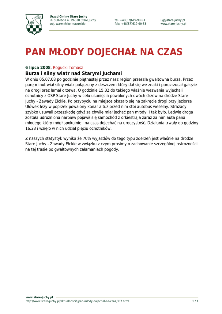 Urząd Gminy Stare Juchy Pl. 500-lecia 4, 19-330 Stare Juchy woj. warmińsko-mazurskie tel. +48(87)619-90-53 faks +48(87)619-90-53 [email protected] www.stare-juchy.pl PAN MŁODY DOJECHAŁ NA CZAS 6 lipca 2008, Rogucki Tomasz Burza i silny wiatr nad Starymi Juchami W dniu 05.07.08 po godzinie piętnastej przez nasz region przeszła gwałtowna burza. Przez parę minut wiał silny wiatr połączony z deszczem który dał się we znaki i porozrzucał gałęzie na drogi oraz łamał drzewa. O godzinie 15.32 do takiego właśnie wezwania wyjechali ochotnicy z OSP Stare Juchy w celu usunięcia powalonych dwóch drzew na drodze Stare Juchy - Zawady Ełckie. Po przybyciu na miejsce okazało się na zakręcie drogi przy jeziorze Ułówek leży w poprzek powalony konar a tuż przed nim stoi autobus weselny. Strażacy szybko usuwali przeszkodę gdyż za chwilę miał jechać pan młody. I tak było. Ledwie droga została udrożniona narpiew pojawił się samochód z orkiestrą a zaraz za nim auta pana młodego który mógł spokojnie i na czas dojechać na uroczystość. Działania trwały do godziny 16.23 i wzięło w nich udział pięciu ochotników. Z naszych statystyk wynika że 70% wyjazdów do tego typu zderzeń jest właśnie na drodze Stare Juchy - Zawady Ełckie w związku z czym prosimy o zachowanie szczególnej ostrożności na tej trasie po gwałtownych załamaniach pogody. www.stare-juchy.pl http://www.stare-juchy.pl/aktualnosci/i,pan-mlody-dojechal-na-czas,337.html 1/1