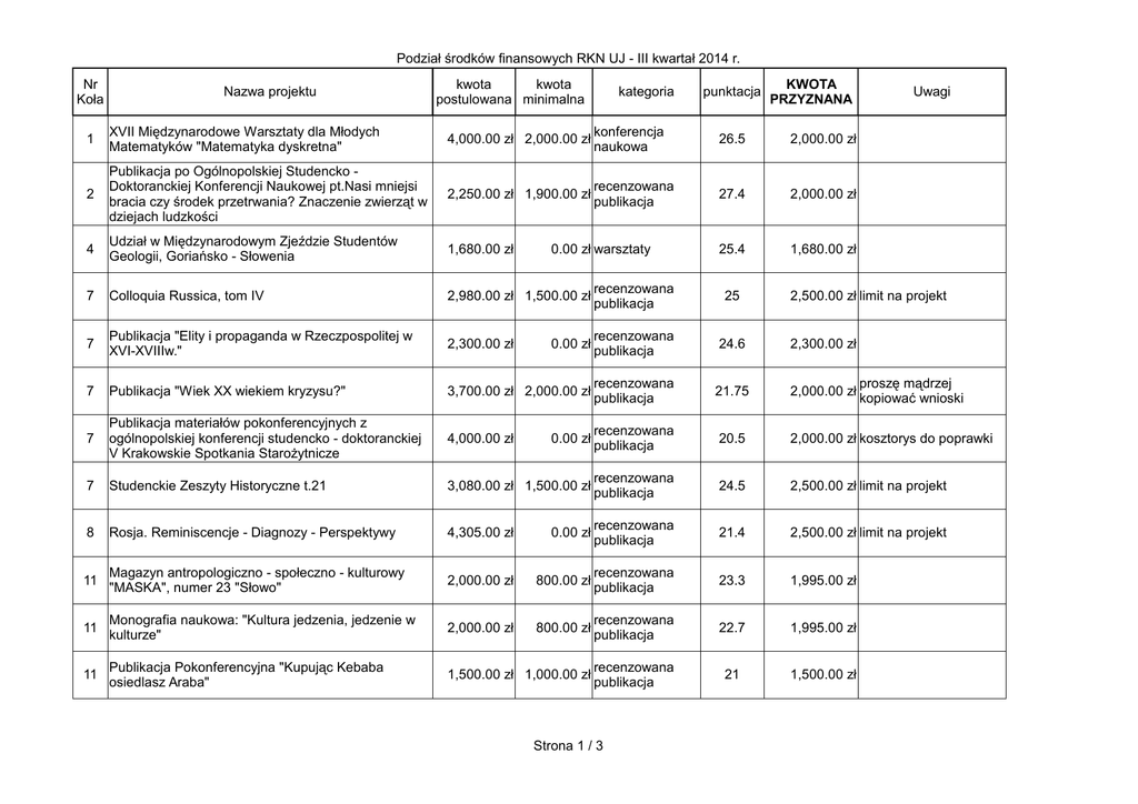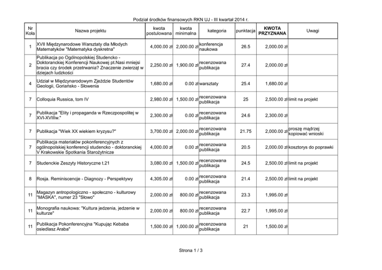 Podział środków finansowych RKN UJ - III kwartał 2014 r. Nr Koła Nazwa projektu kwota kwota postulowana minimalna kategoria punktacja KWOTA PRZYZNANA Uwagi 1 XVII Międzynarodowe Warsztaty dla Młodych Matematyków "Matematyka dyskretna" 4,000.00 zł 2,000.00 zł konferencja naukowa 26.5 2,000.00 zł 2 Publikacja po Ogólnopolskiej Studencko Doktoranckiej Konferencji Naukowej pt.Nasi mniejsi bracia czy środek przetrwania? Znaczenie zwierząt w dziejach ludzkości 2,250.00 zł 1,900.00 zł recenzowana publikacja 27.4 2,000.00 zł 4 Udział w Międzynarodowym Zjeździe Studentów Geologii, Goriańsko - Słowenia 1,680.00 zł 25.4 1,680.00 zł 7 Colloquia Russica, tom IV 2,980.00 zł 1,500.00 zł recenzowana publikacja 25 7 Publikacja "Elity i propaganda w Rzeczpospolitej w XVI-XVIIIw." 2,300.00 zł 0.00 zł recenzowana publikacja 24.6 2,300.00 zł 7 Publikacja "Wiek XX wiekiem kryzysu?" 3,700.00 zł 2,000.00 zł recenzowana publikacja 21.75 2,000.00 zł 7 Publikacja materiałów pokonferencyjnych z ogólnopolskiej konferencji studencko - doktoranckiej V Krakowskie Spotkania Starożytnicze 4,000.00 zł 0.00 zł recenzowana publikacja 20.5 2,000.00 zł kosztorys do poprawki 7 Studenckie Zeszyty Historyczne t.21 3,080.00 zł 1,500.00 zł recenzowana publikacja 24.5 2,500.00 zł limit na projekt 8 Rosja. Reminiscencje - Diagnozy - Perspektywy 4,305.00 zł 0.00 zł recenzowana publikacja 21.4 2,500.00 zł limit na projekt 11 Magazyn antropologiczno - społeczno - kulturowy "MASKA", numer 23 "Słowo" 2,000.00 zł 800.00 zł recenzowana publikacja 23.3 1,995.00 zł 11 Monografia naukowa: "Kultura jedzenia, jedzenie w kulturze" 2,000.00 zł 800.00 zł recenzowana publikacja 22.7 1,995.00 zł 11 Publikacja Pokonferencyjna "Kupując Kebaba osiedlasz Araba" 1,500.00 zł 1,000.00 zł recenzowana publikacja 21 1,500.00 zł 0.00 zł warsztaty Strona 1 / 3 2,500.00 zł limit na projekt proszę mądrzej kopiować wnioski Podział środków finansowych RKN UJ - III kwartał 2014 r. prezentacja Międzynarodowa Konferencja Naukowa POLYMAT 14 738.00 zł 0.00 zł wyników badań 24.8 60 na konferencji recenzowana publikacja nieobecność na Walnym Zgromadzeniu 0.00 zł nieobecność na Walnym Zgromadzeniu 14 Publikacja pokonferencyjna SeMPowisko 2014 1,188.00 zł 0.00 zł 16 HydroBieszczady2014 2,471.40 zł 0.00 zł projekt badawczy 25 1,870.00 zł w tym 200 zł na diety 16 Obóz naukowy Koła Geografów Bułgaria Grecja 2014 2,426.50 zł 0.00 zł projekt badawczy 25.7 2,426.00 zł w tym 500 zł na diety 16 Polonezkoy jako ośrodek turystyczny 16 Przez Polskie Góry 17 Naukowy Rajd Ochrony Środowiska i Sekcji Botanicznej Koła Przyrodników UJ 17 Wyjazd na 8. Międzynarodową Konferencję Katalizy Środowiskowej 24 Acta Mygenica VI 30 Publikacja Studenckich Zeszytów Naukowych IFS UJ nr specjalny 2 38 64th Congress of Phenomenology 38 Portuguese Congress of Philosophy Udział w konferencji naukowej Re-Imagining Human 38 (The 17th Biennial Conference for the International Society for Religion, Literature and Culture) 57 Publikacja pierwszego numeru czasopisma naukowego "Skarbniczka" 68 AstroTrip "W poszukiwaniu ciemnego nieba" 2014 1,793.60 zł 1,400.00 zł projekt badawczy 500.00 zł 996.00 zł 1,465.00 zł 300.00 zł projekt badawczy rajd górski 0.00 zł połączony z konferencją prezentacja 0.00 zł wyników badań na konferencji 2,200.00 zł 1,900.00 zł recenzowana publikacja recenzowana publikacja prezentacja 661.24 zł 400.00 zł wyników badań na konferencji prezentacja 1,000.00 zł 500.00 zł wyników badań na konferencji prezentacja 1,400.00 zł 1,400.00 zł wyników badań na konferencji 1,300.00 zł 1,000.00 zł 776.00 zł 400.00 zł recenzowana publikacja 2,460.00 zł 1,800.00 zł projekt badawczy Strona 2 / 3 20.75 0.00 zł 21 zwiększony limit na osobę (z 500 zł do 700 1,400.00 zł zł), zgodnie z Art.15. pkt 4. Regulaminu 22 400.00 zł w tym 400 zł na diety 16.5 150.00 zł tylko dla referentów - wniosek do 0.00 zł Towarzystwa Doktorantów UJ 24.4 2,200.00 zł 22.8 1,300.00 zł 13 500.00 zł limit na osobę 18.25 500.00 zł limit na osobę 19 dofinansowanie poniżej 0.00 zł minimalnej kwoty postulowanej 21.5 776.00 zł 24.8 1,800.00 zł 68 Wyjazd na International Conference of Young Astronomers 2014 70 Inwentaryzacja i monitoring herpetofauny w zachodniej części Tatrzańskiego PN Podział środków finansowych RKN UJ - III kwartał 2014 r. prezentacja 1,260.00 zł 960.00 zł wyników badań 20.6 na konferencji 2,310.00 zł 0.00 zł projekt badawczy 650.00 zł w tym 500 zł na diety 600.00 zł w tym 100 zł na diety 1,392.00 zł 400.00 zł warsztaty 18.5 70 Rakutowskie 2014 - obóz ornitologiczny 4,000.00 zł 200.00 zł projekt badawczy 16.75 70 Warsztaty teriologiczne w Białowieży 2,809.00 zł 919.00 zł warsztaty 2,234.00 zł 790.00 zł projekt badawczy Występowanie popielcowatych w Borach Dolnośląskich 76 What the crows croak about? 82 Czynny udział w XXXV Zjezdzie Naukowym Polskiego Towarzystwa Psychologicznego 82 Zdrowie i odporność psychiczna prezentacja 374,45 wyników badań na konferencji prezentacja 2,697.90 zł 2,000.00 zł wyników badań na konferencji konferencja 2,500.00 zł 1,500.00 zł naukowa 374.45 zł Strona 3 / 3 bez diet, tylko dla czynnych uczestników 25.5 70 IV warsztaty Chiropterologiczne 70 960.00 zł 1,500.00 zł 16 919.00 zł bez diet 13.5 790.00 zł bez diet 14.2 0.00 zł nieobecność na Walnym Zgromadzeniu 20.75 2,500.00 zł limit na projekt 33.25 2,500.00 zł RAZEM: 48,711.00 zł