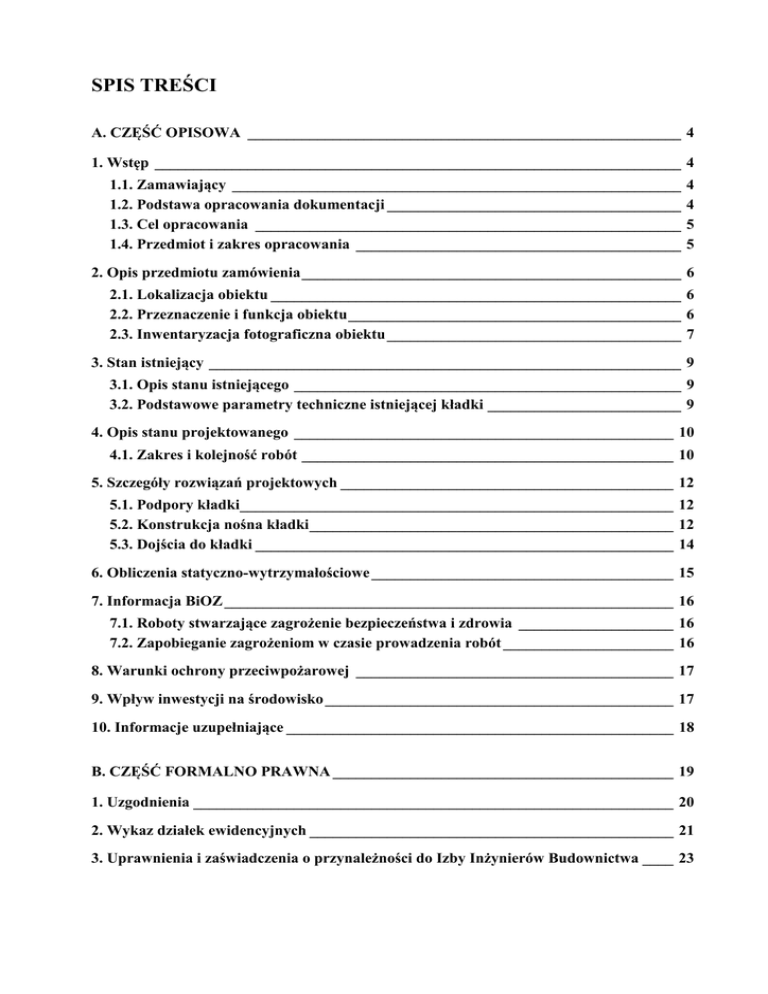 SPIS TREŚCI A. CZĘŚĆ OPISOWA ________________________________________________________ 4 1. Wstęp ____________________________________________________________________ 4 1.1. Zamawiający __________________________________________________________ 1.2. Podstawa opracowania dokumentacji ______________________________________ 1.3. Cel opracowania _______________________________________________________ 1.4. Przedmiot i zakres opracowania __________________________________________ 4 4 5 5 2. Opis przedmiotu zamówienia _________________________________________________ 6 2.1. Lokalizacja obiektu _____________________________________________________ 6 2.2. Przeznaczenie i funkcja obiektu ___________________________________________ 6 2.3. Inwentaryzacja fotograficzna obiektu ______________________________________ 7 3. Stan istniejący _____________________________________________________________ 9 3.1. Opis stanu istniejącego __________________________________________________ 9 3.2. Podstawowe parametry techniczne istniejącej kładki _________________________ 9 4. Opis stanu projektowanego _________________________________________________ 10 4.1. Zakres i kolejność robót ________________________________________________ 10 5. Szczegóły rozwiązań projektowych ___________________________________________ 12 5.1. Podpory kładki________________________________________________________ 12 5.2. Konstrukcja nośna kładki _______________________________________________ 12 5.3. Dojścia do kładki ______________________________________________________ 14 6. Obliczenia statyczno-wytrzymałościowe _______________________________________ 15 7. Informacja BiOZ __________________________________________________________ 16 7.1. Roboty stwarzające zagrożenie bezpieczeństwa i zdrowia ____________________ 16 7.2. Zapobieganie zagrożeniom w czasie prowadzenia robót ______________________ 16 8. Warunki ochrony przeciwpożarowej _________________________________________ 17 9. Wpływ inwestycji na środowisko _____________________________________________ 17 10. Informacje uzupełniające __________________________________________________ 18 B. CZĘŚĆ FORMALNO PRAWNA ____________________________________________ 19 1. Uzgodnienia ______________________________________________________________ 20 2. Wykaz działek ewidencyjnych _______________________________________________ 21 3. Uprawnienia i zaświadczenia o przynależności do Izby Inżynierów Budownictwa ____ 23 Integral Sp. z o.o. PROJEKT PRZEBUDOWY KATOWICE OPIS TECHNICZNY C. CZĘŚĆ RYSUNKOWA ____________________________________________________ 29 01 Plan sytuacyjny. 02 Inwentaryzacja stanu istniejącego 03 Stan projektowany. Rysunek ogólny 04 Dojścia do kładki 05 Zakres przebudowy 06 Geometria pomostu kładki 07 Wzmocnienie płyty pomostowej 08 Naprawa ubytków betonu 09 Balustrady 10 Osłony przeciwporażeniowe 11 Szczegóły konstrukcyjne Projekt przebudowy kładki dla pieszych nad torami PKP i CTL w Katowicach pomiędzy ul. Lubiny i ul. Gabrieli Zapolskiej 2 Integral Sp. z o.o. PROJEKT PRZEBUDOWY KATOWICE OPIS TECHNICZNY Oświadczenie Niniejszym oświadczamy, że niniejszy projekt przebudowy został sporządzony zgodnie z obowiązującymi przepisami oraz zasadami wiedzy technicznej. Opracowanie stanowi komplet dokumentacji pod względem celu, któremu ma służyć. W przypadku powstania wątpliwości, czy niejasności należy zwrócić się do autorów dokumentacji o dodatkowe informacje lub wyjaśnienia. Podpis projektanta ......................................................................... Katowice, dnia 24.02.2016 Podpis sprawdzającego ......................................................................... Projekt przebudowy kładki dla pieszych nad torami PKP i CTL w Katowicach pomiędzy ul. Lubiny i ul. Gabrieli Zapolskiej 3 Integral Sp. z o.o. PROJEKT PRZEBUDOWY KATOWICE OPIS TECHNICZNY A. CZĘŚĆ OPISOWA 1. Wstęp 1.1. Zamawiający Miejski Zarząd Ulic i Mostów ul. Józefy Kantorówny 2a 40-381 Katowice 1.2. Podstawa opracowania dokumentacji Podstawę opracowania dokumentacji stanowią: • zlecenie nr L.dz.TI.AW.4202.2/16-429 z dnia 15.01.2016r. wystawione przez Miejski Zarząd Dróg i Mostów w Katowicach, dla firmy Integral Sp. z o.o. z siedzibą w Katowicach 40-467 przy ul. Pułku Piechoty 1 paw E. • decyzja nr 136/15 wydana przez Śląski Wojewódzki Inspektor Nadzoru Budowlanego w sprawie nieprawidłowości stanu technicznego kładki dla pieszych w Katowicach – Ligocie. • mapa sytuacyjno-wysokościowa do celów projektowych terenu w obrębie kładki w skali 1:500 • wykaz działek ewidencyjnych w obrębie kładki Przy opracowaniu niniejszego projektu korzystano z następujących pozycji piśmiennictwa, norm oraz materiałów archiwalnych: [1] Ustawa Prawo budowlane z 7 lipca 1994 r. (Dz.U. 2013 poz. 1409 z późniejszymi zmianami) [2] Ustawa o odpadach z 14 grudnia 20012 r. (Dz.U. 2013 poz. 21 z późniejszymi zmianami) [3] Rozporządzenie Ministra Transportu i Gospodarki Morskiej z dnia 30 maja 2000 r. w sprawie warunków technicznych, jakim powinny odpowiadać drogowe obiekty inżynierskie i ich usytuowanie (Dz.U. 2000 nr 63 poz. 735 z późniejszymi zmianami) [4] PN-EN 1990 Eurokod: Podstawy projektowania konstrukcji [5] PN-EN 1991-1-1 Eurokod 1: Oddziaływania na konstrukcje. Część 1-1: Oddziaływania ogólne. Ciężar objętościowy, ciężar własny, obciążenia użytkowe w budynkach [6] PN-EN 1991-2 Eurokod 1: Oddziaływania na konstrukcje. Część 2: Obciążenia ruchome mostów [7] PN-EN 1993-1-1 Eurokod 3: Projektowanie konstrukcji stalowych. Część 1-1: Reguły ogólne i reguły dla budynków Projekt przebudowy kładki dla pieszych nad torami PKP i CTL w Katowicach pomiędzy ul. Lubiny i ul. Gabrieli Zapolskiej 4 Integral Sp. z o.o. PROJEKT PRZEBUDOWY KATOWICE OPIS TECHNICZNY [8] PN-EN 1993-2 Eurokod 3: Projektowanie konstrukcji stalowych. Część 2: Mosty stalowe [9] A. Madaj, W. Wołow