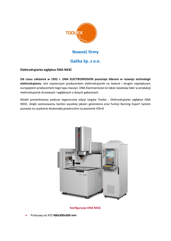 Nowość firmy Galika Sp. z o.o. Elektrodrążarka wgłębna ONA NX3C Od czasu założenia w 1952 r. ONA ELECTROEROSION pozostaje liderem w rozwoju technologii elektrodrążenia. Jest najstarszym producentem elektrodrążarek na świecie i drugim największym europejskim producentem tego typu maszyn. ONA Electroerosion to także światowy lider w produkcji elektrodrążarek drutowych i wgłębnych o dużych gabarytach. Model prezentowany podczas tegorocznej edycji targów Toolex - Elektrodrążarka wgłębna ONA NX3C, dzięki zastosowaniu bardzo wysokiej jakości generatora oraz funkcji Burning Expert System pozwala na uzyskanie doskonałej powierzchni na poziomie VDI=0 Konfiguracja ONA NX3C Przesuwy osi XYZ 400x300x300 mm Wymiary wanny 910x610x350 mm Obciążenie stołu do 750 kg Masa elektrody do 100 kg Powierzchnia VDI 0 – standard Liniały optyczne we wszystkich osiach Automatyczny magazyn elektrod (20 szt.) Generator 60 A Chłodziarka dielektryka Oś C (opcje uchwytu: Erowa ER-007523/ Hirschmann H8.11.7/ 3R-600.84-30)
