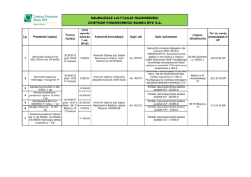 NAJBLIŻSZE LICYTACJE RUCHOMOŚCI CENTRUM FINANSOWEGO BANKU BPS S.A. Lp. Przedmiot licytacji Termin licytacji cena wywoła wcza za 1 szt. [PLN] Komornik prowadzący Sygn. akt 1 Samochód osobowy Fiat MULTIPLA nr rej. PK 5675A 20.08.2015 godz. 09:00 (II licytacja) 3 000,00 Komornik Sądowy przy Sądzie Rejonowym w Kaliszu Józef Kolański tel. 62/7570526 Km 3075/14 2 Samochód ciężarowy Volkswagen Transporter T4 28.08.2015 godz. 10:00 (II licytacja) 5 950,00 Komornik Sądowy w Kętrzynie Sebastian Dunaj tel. 89/7512352 Km 1461/14 3 4 5 6 7 Agregat Knoche 2002 nr fabr. 41520 - 1 szt Komora wędzalniczoparzalnicza Jugema 15 letnia 1 szt 04.09.2015 Natryskiwarka MH-3-31godz. 12:00 w 00204182, 11 letnia - 1 szt lokalu : 58-113 Agregat chłodniczy , 10 letni - 1 Bojanice 19 szt (I licytacja) Chłodnica powietrza Frascold szt. 3: OA 000540, OA 000262, OA 000264 stanowiący zestaw sprężarkowy - 1kpl 19 500,00 3 750,00 11 250,00 miejsce składowania Samochód w kolorze niebieskim, rok produkcji 2000, VIN ZFA 18600002047473. Samochód można oglądać w dniu licytacji w miejscu i 62-860 Opatówek czasie oznaczonym obok. Przystępujący ul. Zielona 3 do przetargu obowiązany jest złożyć rękojmię w wysokości 1/10 części sumy oszacowania tj. 600 zł. Samochód o kolorze białym nr rej. NKE 78GA, VIN WV1ZZZ70Z2X001306, Kętrzyn ul. B. wartość szacunkowa 11.900 zł. Limanowskiego Przystępujący do przetargu obowiązany 3A jest złożyć rękojmię w wysokości 1/10 części sumy oszacowania. Licytacja Wartość szacunkowa brutto zawiera podatek VAT - 26.000 zł Tel. do osoby prowadzącej w CF (22) 53 95 587 (22) 53 95 587 Wartość szacunkowa brutto zawiera podatek VAT - 80.000 zł 60 000,00 26 250,00 Opis ruchomości Komornik Sądowy przy Sądzie Rejonowym w Świdnicy Jolanta Płaza tel. 74/8536188 Km 2521/12 Wartość szacunkowa brutto zawiera podatek VAT - 35.000 zł Wartość szacunkowa brutto zawiera podatek VAT - 5.000 zł Wartość szacunkowa brutto zawiera podatek VAT - 15.000 zł 58-113 Bojanice 10 (71) 32 30 584