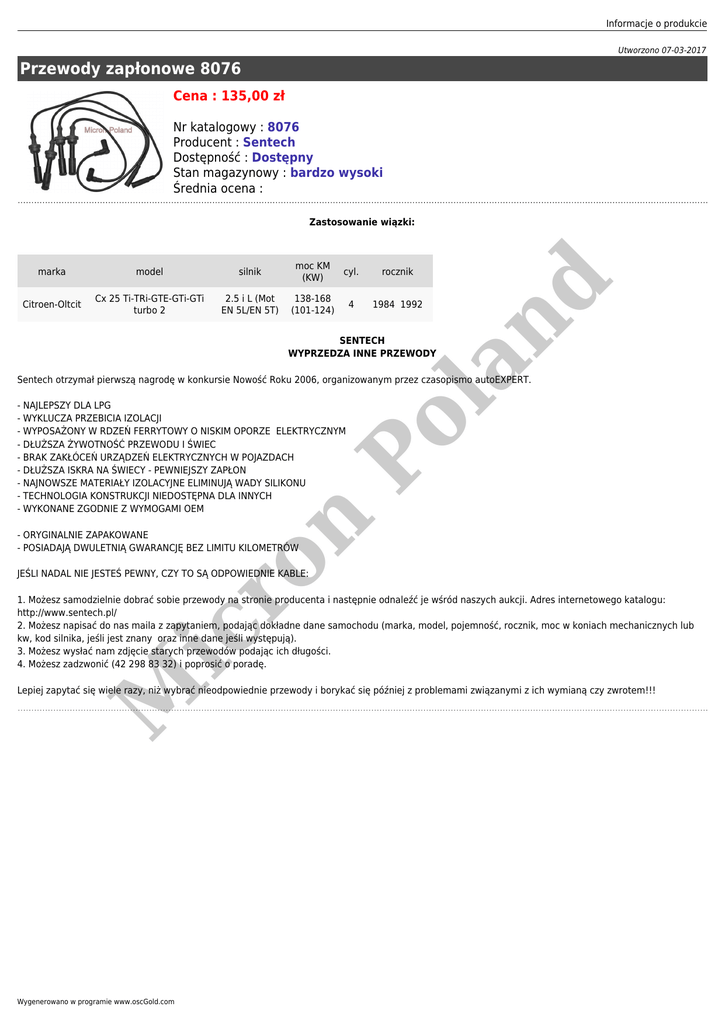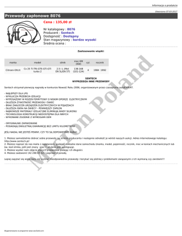 Informacje o produkcie Utworzono 07-03-2017 Przewody zapłonowe 8076 Cena : 135,00 zł Nr katalogowy : 8076 Producent : Sentech Dostępność : Dostępny Stan magazynowy : bardzo wysoki Średnia ocena : marka model silnik moc KM (KW) cyl. rocznik Citroen-Oltcit Cx 25 Ti-TRi-GTE-GTi-GTi turbo 2 2.5 i L (Mot EN 5L/EN 5T) 138-168 (101-124) 4 1984 1992 la SENTECH WYPRZEDZA INNE PRZEWODY nd Zastosowanie wiązki: Sentech otrzymał pierwszą nagrodę w konkursie Nowość Roku 2006, organizowanym przez czasopismo autoEXPERT. ic ro n Po - NAJLEPSZY DLA LPG - WYKLUCZA PRZEBICIA IZOLACJI - WYPOSAŻONY W RDZEŃ FERRYTOWY O NISKIM OPORZE ELEKTRYCZNYM - DŁUŻSZA ŻYWOTNOŚĆ PRZEWODU I ŚWIEC - BRAK ZAKŁÓCEŃ URZĄDZEŃ ELEKTRYCZNYCH W POJAZDACH - DŁUŻSZA ISKRA NA ŚWIECY - PEWNIEJSZY ZAPŁON - NAJNOWSZE MATERIAŁY IZOLACYJNE ELIMINUJĄ WADY SILIKONU - TECHNOLOGIA KONSTRUKCJI NIEDOSTĘPNA DLA INNYCH - WYKONANE ZGODNIE Z WYMOGAMI OEM - ORYGINALNIE ZAPAKOWANE - POSIADAJĄ DWULETNIĄ GWARANCJĘ BEZ LIMITU KILOMETRÓW JEŚLI NADAL NIE JESTEŚ PEWNY, CZY TO SĄ ODPOWIEDNIE KABLE: M 1. Możesz samodzielnie dobrać sobie przewody na stronie producenta i następnie odnaleźć je wśród naszych aukcji. Adres internetowego katalogu: http://www.sentech.pl/ 2. Możesz napisać do nas maila z zapytaniem, podając dokładne dane samochodu (marka, model, pojemność, rocznik, moc w koniach mechanicznych lub kw, kod silnika, jeśli jest znany oraz inne dane jeśli występują). 3. Możesz wysłać nam zdjęcie starych przewodów podając ich długości. 4. Możesz zadzwonić (42 298 83 32) i poprosić o poradę. Lepiej zapytać się wiele razy, niż wybrać nieodpowiednie przewody i borykać się później z problemami związanymi z ich wymianą czy zwrotem!!! Wygenerowano w programie www.oscGold.com