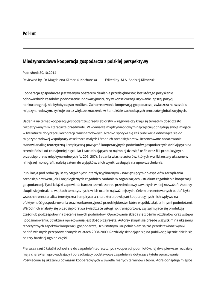 Pol-Int Międzynarodowa kooperacja gospodarcza z polskiej perspektywy Published: 30.10.2014 Reviewed by Dr Magdalena Klimczuk-Kochanska Edited by M.A. Andrzej Klimczuk Kooperacja gospodarcza jest ważnym obszarem działania przedsiębiorstw, bez którego pozyskanie odpowiednich zasobów, podnoszenie innowacyjności, czy w konsekwencji uzyskanie lepszej pozycji konkurencyjnej, nie byłoby często możliwe. Zainteresowanie kooperacją gospodarczą, zwłaszcza na szczeblu międzynarodowym, zyskuje coraz większe znaczenie w kontekście zachodzących procesów globalizacyjnych. Badania na temat kooperacji gospodarczej przedsiębiorstw w regionie czy kraju są tematem dość często rozpatrywanym w literaturze przedmiotu. W wymiarze międzynarodowym najczęściej odnajdują swoje miejsce w literaturze dotyczącej korporacji transnarodowych. Rzadko spotyka się zaś publikacje odnoszące się do międzynarodowej współpracy w sektorze małych i średnich przedsiębiorstw. Recenzowane opracowanie stanowi analizę teoretyczną i empiryczną powiązań kooperacyjnych podmiotów gospodarczych działających na terenie Polski od co najmniej pięciu lat i zatrudniających co najmniej dziesięć osób oraz filii produkcyjnych przedsiębiorstw międzynarodowych (s. 205, 207). Badania własne autorów, których wyniki zostały ukazane w niniejszej monografii, należą zatem do wyjątków, a ich wyniki zasługują na upowszechnianie. Publikacja pod redakcją Beaty Stępień jest interdyscyplinarnym – nawiązującym do aspektów zarządzania przedsiębiorstwem, jak i socjologicznych zagadnień zaufania w organizacjach - studium zagadnienia kooperacji gospodarczej. Tytuł książki zapowiada bardzo szeroki zakres przedmiotowy zawartych w niej rozważań. Autorzy skupili się jednak na wątkach tematycznych, w ich ocenie najważniejszych. Celem prezentowanych badań była wszechstronna analiza teoretyczna i empiryczna charakteru powiązań kooperacyjnych i ich wpływu na efektywność gospodarowania oraz konkurencyjność przedsiębiorstw, które współdziałają z innymi podmiotami. Wśród nich znalazły się przedsiębiorstwa świadczące usługi np. transportowe, czy zajmujące się produkcją części lub podzespołów na zlecenie innych podmiotów. Opracowanie składa się z ośmiu rozdziałów oraz wstępu i podsumowania. Struktura opracowania jest dość przejrzysta. Autorzy skupili się przede wszystkim na ukazaniu teoretycznych aspektów kooperacji gospodarczej. Ich istotnym uzupełnieniem są zaś przedstawione wyniki badań własnych przeprowadzonych w latach 2008-2009. Rozdziały składające się na publikację łącznie dzielą się na trzy bardziej ogólne części. Pierwsza część książki odnosi się do zagadnień teoretycznych kooperacji podmiotów. Jej dwa pierwsze rozdziały mają charakter wprowadzający i porządkujący podstawowe zagadnienia dotyczące tytułu opracowania. Poświęcone są ukazaniu powiązań kooperacyjnych w świetle różnych terminów i teorii, które odnajdują miejsce w literaturze przedmiotu. Pozwalają czytelnikowi zapoznać się z istotą kooperacji, odniesieniem jej do kwestii współdziałania, outsourcingu, offshoringu, czy kooperencji. Kontynuacją tych rozważań jest rozdział trzeci skupiający się na przedstawieniu warunków, jakie sprzyjają osiąganiu efektów kooperacji gospodarczej. Zostają one ukazane poprzez przedstawienie pokrótce strategii podmiotów gospodarczych oraz czynników otoczenia podmiotów. Oddzielny podrozdział poświęcony został zaufaniu jako szczególnie istotnemu – w opinii autorów – czynnikowi społecznemu sprzyjającemu tworzeniu i utrzymaniu trwałych relacji w ramachkooperacji i tworzenia sieci współpracy. Nie bez powodu właśnie zaufanie zostało wyróżnione, gdyż uznaje się, że to ono wpływa znacząco na poziom niepewności kooperacji, szczególnie w kontekście możliwości nieuczciwego uzyskania korzyści przez partnerów biznesowych. Znaczący niedosyt można dostrzec w rozdziale trzecim, którego celem było ukazanie efektów kooperacji gospodarczej. Wydaje się jednak, że warto byłoby poświęcić więcej uwagi aspektowi jakim są korzyści i ewentualne straty, które może nieść ze sobą kooperacja gospodarcza. Rozdział taki mógłby być istotnym uzupełnieniem opracowania, stanowiłby bowiem istotne uzasadnienie poświęcone tematyce kooperacji z punktu widzenia podmiotów gospodarczych, władz szczebla regionalnego, krajowego, czy innych instytucji szeroko pojętego otoczenia organizacji. W części drugiej opracowania bardziej skupiono się na międzynarodowym wymiarze kooperacji gospodarczej. Autorzy ukazują przyczyny oraz uwarunkowania współpracy gospodarczej w dwóch kategoriach: instytucjonalnych i kulturowych. Następnie przedstawiają formy internacjonalizacji działalności gospodarczej i powody jej podejmowania według podstawowych ujęć teoretycznych. Dokonują również analizy przejawów kooperacji w gospodarce światowej, takich jak wzrost obrotu częściami i podzespołami w handlu międzynarodowym oraz wzrost zainteresowania offshoringiem produktów i usług. Ukazano również przykładowe rezultaty tego rodzaju współpracy w wymiarze międzynarodowym. Wśród nich skupiono uwagę m.in. na korzyściach jakie mogą osiągnąć przedsiębiorstwa biorące udział w kooperacji, takich jak np. wzrost poziomu innowacyjności kooperantów, obniżenie kosztów wytwarzania, zwiększenie rynków zbytu produktów oferowanych przez przedsiębiorstwa. Wskazano również negatywne strony takiej współpracy związane chociażby z nadmierną rozbudową sieci kooperacyjnej, czy też mogącego wystąpić w skali światowej pogłębienia międzynarodowego podziału pracy na kraje mniej i bardziej rozwinięte. Część ostatnia omawianego opracowania, składająca się z trzech rozdziałów, została poświęcona prezentacji wyników badań własnych autorów publikacji. Podjęto p