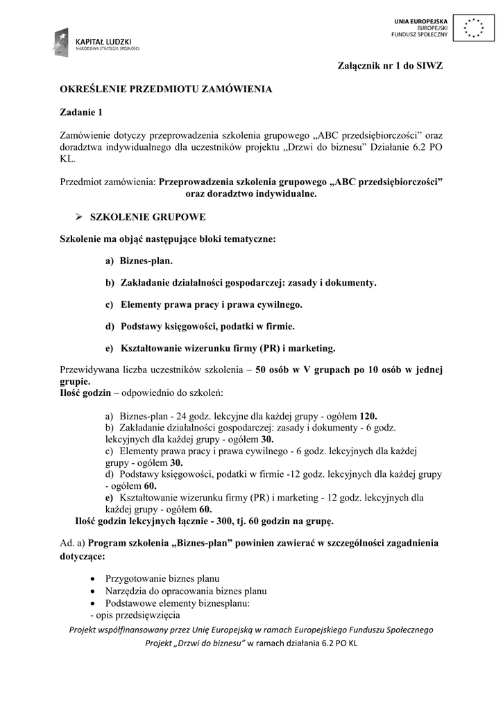 Załącznik nr 1 do SIWZ OKREŚLENIE PRZEDMIOTU ZAMÓWIENIA Zadanie 1 Zamówienie dotyczy przeprowadzenia szkolenia grupowego „ABC przedsiębiorczości” oraz doradztwa indywidualnego dla uczestników projektu „Drzwi do biznesu” Działanie 6.2 PO KL. Przedmiot zamówienia: Przeprowadzenia szkolenia grupowego „ABC przedsiębiorczości” oraz doradztwo indywidualne. SZKOLENIE GRUPOWE Szkolenie ma objąć następujące bloki tematyczne: a) Biznes-plan. b) Zakładanie działalności gospodarczej: zasady i dokumenty. c) Elementy prawa pracy i prawa cywilnego. d) Podstawy księgowości, podatki w firmie. e) Kształtowanie wizerunku firmy (PR) i marketing. Przewidywana liczba uczestników szkolenia – 50 osób w V grupach po 10 osób w jednej grupie. Ilość godzin – odpowiednio do szkoleń: a) Biznes-plan - 24 godz. lekcyjne dla każdej grupy - ogółem 120. b) Zakładanie działalności gospodarczej: zasady i dokumenty - 6 godz. lekcyjnych dla każdej grupy - ogółem 30. c) Elementy prawa pracy i prawa cywilnego - 6 godz. lekcyjnych dla każdej grupy - ogółem 30. d) Podstawy księgowości, podatki w firmie -12 godz. lekcyjnych dla każdej grupy - ogółem 60. e) Kształtowanie wizerunku firmy (PR) i marketing - 12 godz. lekcyjnych dla każdej grupy - ogółem 60. Ilość godzin lekcyjnych łącznie - 300, tj. 60 godzin na grupę. Ad. a) Program szkolenia „Biznes-plan” powinien zawierać w szczególności zagadnienia dotyczące: Przygotowanie biznes planu Narzędzia do opracowania biznes planu Podstawowe elementy biznesplanu: - opis przedsięwzięcia Projekt współfinansowany przez Unię Europejską w ramach Europejskiego Funduszu Społecznego Projekt „Drzwi do biznesu” w ramach działania 6.2 PO KL - plan marketingowy (w tym opis produktu/usługi i konkurencji, charakterystyka rynku, dystrybucja i promocja) - prognoza przychodów - efekty ekonomiczne przedsięwzięcia - koszty i źródła ich finansowania Harmonogram realizacji przedsięwzięcia Plan prowadzenia działalności gospodarczej w następnych 2 latach Możliwości i zagrożenia Plany finansowe - racjonalne wykorzystanie środków finansowych Ad b) Program szkolenia „Zakładanie działalności gospodarczej: zasady i dokumenty” powinien zawierać w szczególności zagadnienia dotyczące: Ścieżka otwierania działalności gospodarczej Rejestracja firmy w Urzędzie Miasta Numer REGON w Urzędzie Statystycznym Firmowe konto bankowe i pieczątka Urząd Skarbowy - NIP i wybór formy opodatkowania Składki na ubezpieczenie społeczne w ZUS Rodzaje zatrudnienia Zgłoszenie do Państwowej Inspekcji Pracy (w przypadku zatrudniania pracowników) Fundusze pożyczkowe Ad c) Program szkolenia „Elementy prawa pracy i prawa cywilnego” powinien zawierać w szczególności zagadnienia dotyczące: A. PRAWO PRACY Zasady prawa pracy Stosunek pracy Umowa o pracę Wynagrodzenie za pracę i inne świadczenia przysługujące od pracodawcy Czas pracy Urlopy Ochrona pracy kobiet Zatrudnianie młodocianych Obowiązki stron umowy Obowiązki pracownika i skutki ich nieprzestrzegania Odpowiedzialność pracodawcy za czyny popełnione przeciwko prawom pracownika Rozwiązanie stosunku pracy B. PRAWO CYWILNE I. Część ogólna. Zagadnienia podstawowe Podmiot stosunku cywilnoprawnego Przedmiot stosunku cywilnoprawnego Czynności prawne II. Zobowiązania - zagadnienia wybrane Projekt współfinansowany przez Unię Europejską w ramach Europejskiego Funduszu Społecznego Projekt „Drzwi do biznesu” w ramach działania 6.2 PO KL Ad d) Program szkolenia „Podstawy księgowości, podatki w firmie” powinien zawierać w szczególności zagadnienia dotyczące: Zasady rachunkowości w małej firmie Podmioty zobligowane do stosowania przepisów ustawy o rachunkowości Charakterystyka aktywów i pasywów Konta: podział i funkcjonowanie Typy i dokumentacja operacji gospodarczych Środki trwałe, klasyfikacja, ewidencja, umorzenie, amortyzacja Układ rodzajowy kosztów Podatek VAT: istota, regulacje prawne, zasady wystawiania dokumentów VAT Podatki w firmie – omówienie poszczególnych rodzajów Ad e) Program szkolenia „Kształtowanie wizerunku firmy (PR) i marketing” powinien zawierać w szczególności zagadnienia dotyczące: Kreowanie wizerunku poprzez nazwę, logo Reklama – najlepszy wybór dla mojej firmy Kreowanie wizerunku firmy w procesie sprzedaży Zdobywanie wiedzy o rynkach i klientach Tworzenie więzi z klientami i pracownikami DORADZTWO INDYWIDUALNE Przewidywana liczba uczestników doradztwa indywidualnego - 50 osób. Ilość godzin: - 5 godz. lekcyjnych dla każdego uczestnika ze specjalistą z zakresu Biznes-planu ogółem 250 godzin lekcyjnych - 5 godz. lekcyjnych dla każdego uczestnika ze specjalistami z dziedzin: Zakładanie działalności gospodarczej: zasady i dokumenty, Elementy prawa pracy i prawa cywilnego, Podstawy księgowości, podatki w firmie, Kształtowanie wizerunku firmy (PR) i marketing ogółem 250 godzin lekcyjnych. Ilość godzin lekcyjnych łącznie - 500, tj. 10 godzin na uczestnika. Doradztwo indywidualne ze specjalistą z zakresu Biznes-planu ma na celu przedyskutowanie pomysłu na własną firmę z każdym z 50 uczestników projektu, opracowanie biznes planu, w tym opracowanie planu założenia i prowadzenia działalności gospodarczej przez co najmniej 2 lata oraz planu racjonalnego wykorzystania środków finansowych. Doradztwo indywidualne ma także na celu pogłębienie tematyki szkolenia „Biznes plan” zgodnie z indywidualnym zapotrzebowaniem uczestników projektu. Doradztwo indywidualne ze specjalistami z wybranych dziedzin ma na celu pogłębienie tematyki szkoleń zgodnie z indywidualnym zapotrzebowaniem uczestników projektu. Projekt współfinansowany przez Unię Europejską w ramach Europejskiego Funduszu Społecznego Projekt „Drzwi do biznesu” w ramach działania 6.2 PO KL Zadanie 2 Zamówienie dotyczy przeprowadzenia warsztatów motywacji dla kobiet oraz osób, które 