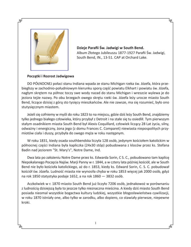 Dzieje Parafii Św. Jadwigi w South Bend. Album Złotego Jubileuszu 1877-1927 Parafii Św. Jadwigi, South Bend, IN., 13-51. CAP at Orchard Lake. Początki i Rozrost Jadwigowa DO PÓŁNOCNEJ połaci stanu Indiana wpada ze stanu Michigan rzeka św. Józefa, która przebiegłszy w zachodnio-południowym kierunku sporą część powiatu Elkhart i powiatu św. Józefa, nagłym skrętem na północ toczy swe wody nazad do stanu Michigan i wreszcie wylewa je do jeziora tejże nazwy. Po obu brzegach owego skrętu rzeki św. Józefa leży urocze miasto South Bend, liczące dzisiaj z górą sto tysięcy mieszkańców. Ale nie zawsze, ma się rozumieć, było ono stutysięcznym miastem. Jeżeli się cofniemy w myśli do roku 1823 to na miejscu, gdzie dziś leży South Bend, znajdziemy tylko jednego białego człowieka, który przybył z Detroit i na stałe się tu osiedlił. Tym pierwszym stałym osadnikiem miasta South Bend był Alexis Coquillard, człowiek liczący 28 Lat życia, silny, odważny i energiczny, żona jego (z domu Frances C. Comparet) niewiasta niepospolitych przymiotów ciała i duszy, przybyła do swego męża w roku następnym. W roku 1831, kiedy osada southbendska liczyła 128 osób, jedynym kościołem katolickim w północnej części Indiana była kapliczka (24x30 stóp) pobudowana z kloców przez ks. Stefana Badin nad jeziorem "St. Mary's", Notre Dame, Ind. Dwa lata po założeniu Notre Dame przez ks. Edwarda Sorin, C S. C., pobudowano tam kaplicę Niepokalanego Poczęcia Najśw. Marji Panny w r. 1844, a w cztery lata później kościół, ale w South Bend nie było kościoła katolickiego, aż do r. 1853, kiedy ks. Edward Sorin, C. S. C. pobudował kościół św. Józefa. Ludność miasta nie wynosiła chyba w roku 1853 więcej jak 2000 osób, gdyż na rok 1850 statystyka podaje 1652, a na rok 1860 — 3832 osób. Aczkolwiek w r. 1870 miasto South Bend już liczyło 7206 osób, jednakowoż w porównaniu z ludnością dzisiejszą była to jeszcze tylko nieznaczna mieścina. A kiedy dziś miasto South Bend posiada nieomal wszystkie bogactwa kultury ludzkiej, wszystkie błogosławieństwa cywilizacji, w roku 1870 istniały one, albo tylko w zarodku, albo dopiero, co stawiały pierwsze, niepewne kroki. 1 Pierwsi Polacy w South Bend. Między owymi mieszkańcami miasta South Bend z roku 1870-go była już i garstka polskich imigrantów, ale tylko garstka, gdyż rodacy nasi poczęli tu się osiedlać w roku 1868-ym. Najpierwsi osadnicy polscy w South Bend byli: Antoni Szybowicz (pierwszy z najpierwszych), Jan Likier, Michał Król, N. Pijanowski, Andrzej Rajter i Józef Woźniak. W następnych trzech latach liczba imigrantów polskich znacznie się powiększyła. Niepodobna tu ich wszystkich z owej drugiej grupy wymienić, ale według świadectwa wiarogodnych świadków w roku 1923 następujący z nich jeszcze żyli: Walenty Korpal, Tomasz Grześk, Jan Makielski, Jan Kowalik, Stanisław Lewiński, i Aleksander Szamecki. Ilu osadników polskich wtenczas było w South Bend tru¬dno dziś się dowiedzieć na pewno. Wiel. ks. Wacław Kruszka w swem dziele "Historia Polska w Ameryce" przytacza list ks. Bakanowskiego, C. R., z 25 stycznia 1871 r., w którym czytamy: "Niedawno byłem w South Bend, Ind. Dawałem tam misję 75 familiom polskim, nowoprzybyłym z Europy..." Czy pomienione familie wszystkie były z South Bend, czy się zjechały z pobliskich miejscowości — tego nie wiemy. Ob. Walenty Korpal, który przybył do South Bend w r. 1871, twierdzi, że było tu wtenczas o wiele mniej rodzin niż 75. Odporność i nieugiętość pionierów southbendskich. Jak pionierzy polscy po innych osadach Stanów Zjednoczonych, tak i southbendscy nacierpieli się więcej niż nam dzisiaj chce się temu dać wiarę. Dokoła nich piętrzył się szereg różnorodnych trudności, niby nieprzerwane pasmo nagich, nieprzebytych gór. Z jednej strony nieustanne borykanie się w celu zaspokojenia najelementarniejszych potrzeb życiowych; z drugiej zaś — cudza mowa, cudze zwyczaje i obyczaje, cudza narodowość, cudze nieraz wyznanie religijne. W otoczeniu tak trudnym jeden i drugi tracił siły fizyczne i padał pod ciężarem brzemienia, jeden i drugi tracił ducha, w ślad czego przychodziły pokusy, aby za "miskę soczewicy" sprzedać swą godność narodową lub nawet swą wiarę. Ale pionierzy nasi southbendscy byli to ludzie odporni i nieugięci. Z licznych walk, jakie staczali z wrogami jeszcze w Europie, wyszli zahartowani, posiadający broń przede wszystkim odporną i sposób jej używania. Toteż żywioł cudzy ich nie pochłonął. Przetrwali jak skała przy swej wierze Św., przy swych tradycjach narodowych, przy swych zwyczajach i obyczajach — przejmując się duchem przybranej ojczyzny, ale zwolna, w sposób naturalny. Jako dowód, że poczucie narodowości u tutejszych pionie¬rów polskich to nie urojenie, ale fakt historyczny, wymownie świadczy wyżej cytowany list ks. Bakanowskiego, C. R., z 25 stycznia 1871 r. Otóż w owym liście nadmieniając o misji, którą on dawał Polakom w South Bend, dodaje: "Ci (polscy osadnicy southbendscy) nawet do kościoła nie chcieli chodzić z przyczyny, że nie ma polskiego księdza. Polska tu nie zaginie." Ale i w wierze św. katolickiej imigranci tutejsi wytrwali. Owa czupurność Polaków, dzięki której nie chcieli chodzić do kościoła, dlatego, że nie było polskiego księdza, to dowód, że kościół 2 mieć chcieli — kościół rzymsko-katolicki, ale swój, polski, w którym by rozbrzmiewała mowa ich praojców. Przecież, dlatego, że byli Polakami, musieli znosić prześladowania w swej rodzinnej ziemi, dlatego tam cierpieli głód i poniżenie, tracili krewnych i przyjaciół, posady i majątki, gnili w nieprzyjacielskich więzieniach, przelewali krew na polu walki, dlatego wreszcie opuszczali, co tylko mieli najdroższego w Polsce i szukali tu za oceanem tej świętej wolności, której nie zaznali pod rządami państw z
