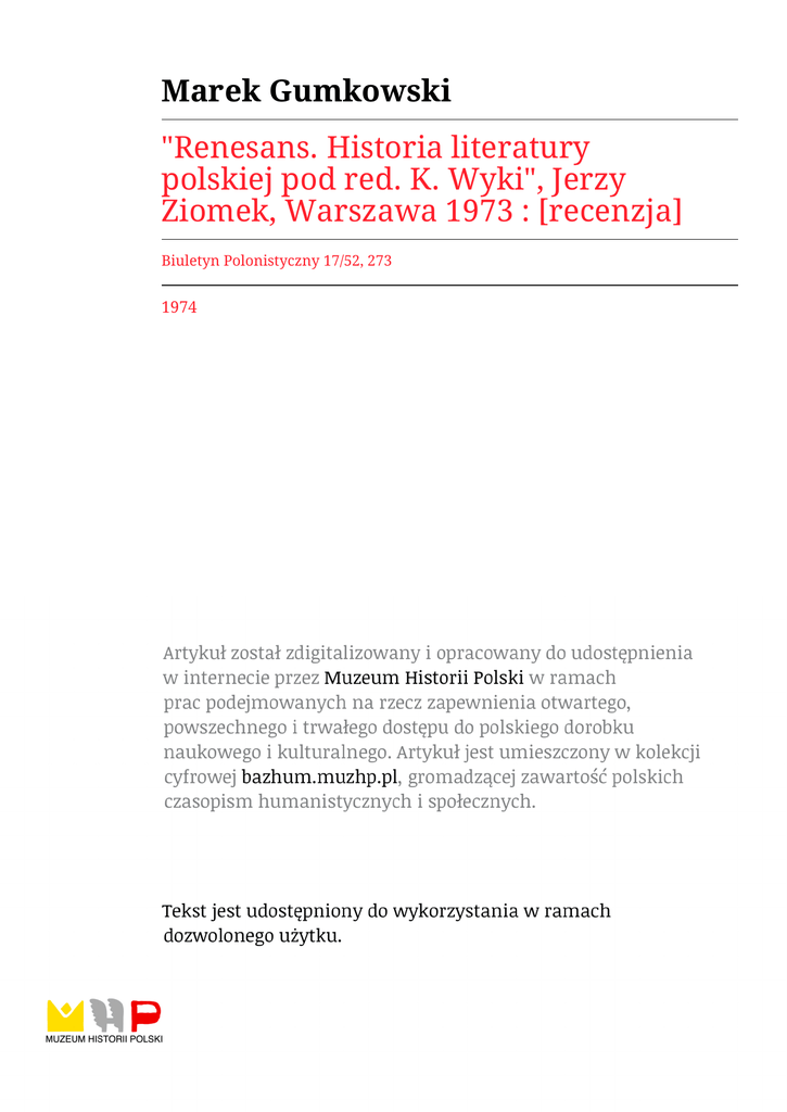 Marek Gumkowski "Renesans. Historia literatury polskiej pod red. K. Wyki", Jerzy Ziomek, Warszawa 1973 : [recenzja] Biuletyn Polonistyczny 17/52, 273 1974 (II) ZIMAND Roman: Rynek. "Teksty" 1973 nr 4 s. 103-110. Pisarstwo Kazimierza Brandysa ewoluuje zawsze w kierunku spełniania aktualnych w danej chwili pragnień czytelniczych. Ta zasada rozwoju twórczości dotyczy zarówno poruszanej przez pisarza tematyki, jak środków ekspresji, których on używa. Poszczególne utwory autora "Rynku" nie są - czego by się moż na spodziewać - bynajmniej manifestacjami awangardowyoh ten dencji w prozie - przeciwnie, "nie wychodzą poza klasycyzujący porządek słów". Brandys jest jednak, zdaniem autora,pi sarzem oennym jako "współtwórca kultury oodziennego czytelniotwa". 3P/52/93 I.Z. (II) ZIOMEK Jerzy: Renesans. Historia literatury polskiej pod red. K.Wyki. Warszawa 1973, PWN, ss. 476, zł 70,Wykład o literaturze polskiej okresu Odrodzenia jest po przedzony częścią wstępną, zawierająoą charakterystykę oałościową i przegląd podstawowych elementów renesansowej kultu ry europejskiej, a przede wszystkim tych jej aspektów, które najściślej wiążą się z literaturą (rozwój, drukarstwa 1 szkol nictwa, zmiany w dziedzinie języka). Tworzywem właśoiwej hi storycznoliterackiej częśoi tomu są rozdziały poświęcone czte rem wybitnym indywidualnościom polskiej literatury renesan sowej: Modrzewskiemu, Rejowi, J.Kochanowskiemu 1 Szarzyńsklemu. Inne partie książki zajmują się zarówno opisem 1 analizą poszozególnyoh problemów historycznoliterackich epoki pol skiego Renesansu (gatunków, poetyk, tematów), jak omówieniem dorobku innych reprezentatywnych twóroów tej epoki. Książka zaopatrzona jest w wyczerpujące "Wskazówki bibliograficzne", które podają spis ważniejszych prao dotyoząoyoh każdego z po ruszanych w tomie zagadnień. 3P/52/94 M.G.