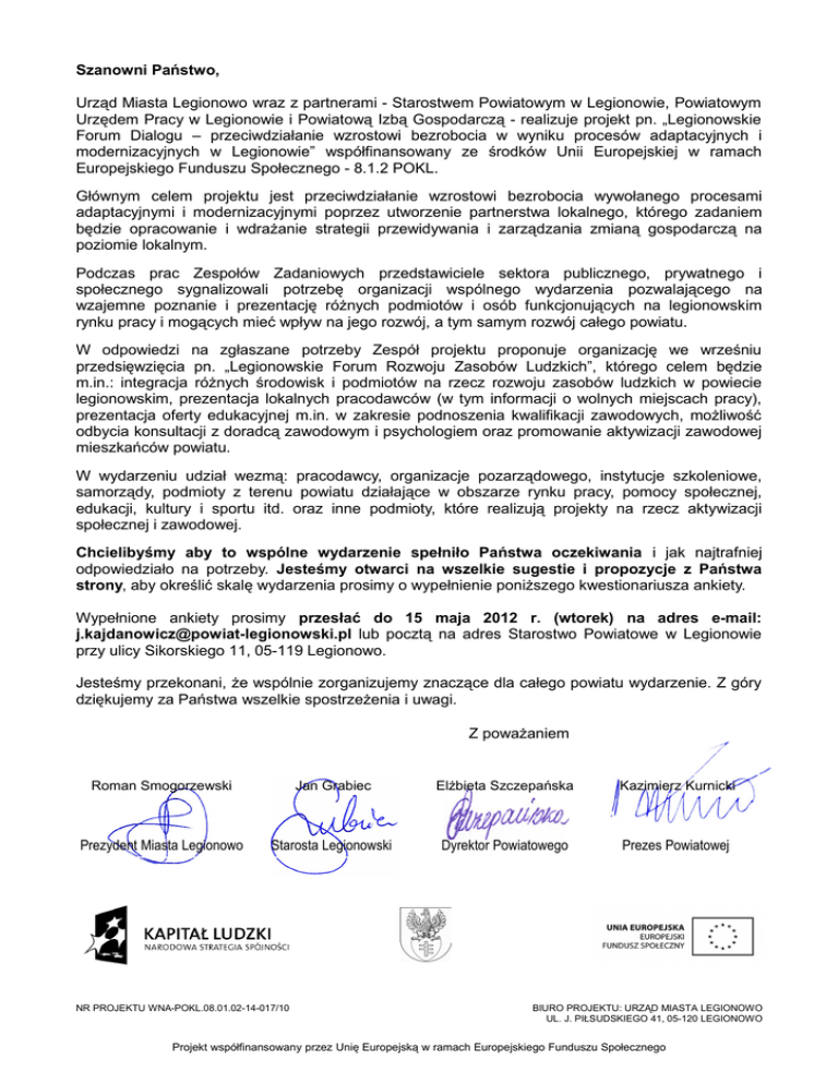 Szanowni Państwo, Urząd Miasta Legionowo wraz z partnerami - Starostwem Powiatowym w Legionowie, Powiatowym Urzędem Pracy w Legionowie i Powiatową Izbą Gospodarczą - realizuje projekt pn. „Legionowskie Forum Dialogu – przeciwdziałanie wzrostowi bezrobocia w wyniku procesów adaptacyjnych i modernizacyjnych w Legionowie” współfinansowany ze środków Unii Europejskiej w ramach Europejskiego Funduszu Społecznego - 8.1.2 POKL. Głównym celem projektu jest przeciwdziałanie wzrostowi bezrobocia wywołanego procesami adaptacyjnymi i modernizacyjnymi poprzez utworzenie partnerstwa lokalnego, którego zadaniem będzie opracowanie i wdrażanie strategii przewidywania i zarządzania zmianą gospodarczą na poziomie lokalnym. Podczas prac Zespołów Zadaniowych przedstawiciele sektora publicznego, prywatnego i społecznego sygnalizowali potrzebę organizacji wspólnego wydarzenia pozwalającego na wzajemne poznanie i prezentację różnych podmiotów i osób funkcjonujących na legionowskim rynku pracy i mogących mieć wpływ na jego rozwój, a tym samym rozwój całego powiatu. W odpowiedzi na zgłaszane potrzeby Zespół projektu proponuje organizację we wrześniu przedsięwzięcia pn. „Legionowskie Forum Rozwoju Zasobów Ludzkich”, którego celem będzie m.in.: integracja różnych środowisk i podmiotów na rzecz rozwoju zasobów ludzkich w powiecie legionowskim, prezentacja lokalnych pracodawców (w tym informacji o wolnych miejscach pracy), prezentacja oferty edukacyjnej m.in. w zakresie podnoszenia kwalifikacji zawodowych, możliwość odbycia konsultacji z doradcą zawodowym i psychologiem oraz promowanie aktywizacji zawodowej mieszkańców powiatu. W wydarzeniu udział wezmą: pracodawcy, organizacje pozarządowego, instytucje szkoleniowe, samorządy, podmioty z terenu powiatu działające w obszarze rynku pracy, pomocy społecznej, edukacji, kultury i sportu itd. oraz inne podmioty, które realizują projekty na rzecz aktywizacji społecznej i zawodowej. Chcielibyśmy aby to wspólne wydarzenie spełniło Państwa oczekiwania i jak najtrafniej odpowiedziało na potrzeby. Jesteśmy otwarci na wszelkie sugestie i propozycje z Państwa strony, aby określić skalę wydarzenia prosimy o wypełnienie poniższego kwestionariusza ankiety. Wypełnione ankiety prosimy przesłać do 15 maja 2012 r. (wtorek) na adres e-mail: [email protected] lub pocztą na adres Starostwo Powiatowe w Legionowie przy ulicy Sikorskiego 11, 05-119 Legionowo. Jesteśmy przekonani, że wspólnie zorganizujemy znaczące dla całego powiatu wydarzenie. Z góry dziękujemy za Państwa wszelkie spostrzeżenia i uwagi. Z poważaniem Roman Smogorzewski Jan Grabiec Elżbieta Szczepańska Kazimierz Kurnicki Prezydent Miasta Legionowo Starosta Legionowski Dyrektor Powiatowego Prezes Powiatowej NR PROJEKTU WNA-POKL.08.01.02-14-017/10 BIURO PROJEKTU: URZĄD MIASTA LEGIONOWO UL. J. PIŁSUDSKIEGO 41, 05-120 LEGIONOWO Projekt współfinansowany przez Unię Europejską w ramach Europejskiego Funduszu Społecznego Urzędu Pracy w Legionowie Izby Gospodarczej Prosimy o zaznaczenie właściwych odpowiedzi znakiem X. 1. Czy jesteście Państwo zainteresowani udziałem w przedsięwzięciu pn. „Legionowskie Forum Rozwoju Zasobów Ludzkich”? TAK NIE NIE WIEM 2. Jeżeli w pytaniu 1. udzieliliście Państwo odpowiedzi TAK, to proszę podać, czy chcielibyście Państwo posiadać stoisko wystawiennicze podczas w/w wydarzenia? TAK NIE Jeżeli, TAK - to proszę podać jaką rolę mogłaby odegrać Państwa instytucja w realizowanym przedsięwzięciu, bądź jakie działania realizowalibyście Państwo podczas wydarzenia np. prezentacja instytucji / podmiotu / organizacji, rekrutacja uczestników do projektów własnych, chęć pozyskania pracowników itp. …………………………………………..…………………………………………………………………………….. …………………………………………..…………………………………………………………………………….. …………………………………………..…………………………………………………………………………….. …………………………………………..…………………………………………………………………………….. …………………………………………..…………………………………………………………………………….. …………………………………………..…………………………………………………………………………….. …………………………………………..…………………………………………………………………………….. …………………………………………..…………………………………………………………………………….. …………………………………………..…………………………………………………………………………….. Nazwa instytucji, podmiotu, organizacji, którą Państwo reprezentujecie: ……………………………….…………………………………………………………………………………………………. Adres: …………………………………………………………………………………………………………………………. Dane osoby wyznaczonej do kontaktów roboczych (imię i nazwisko, tel. kontaktowy) ……………………………………………………………………………………………………..…………………………… Dziękujemy za wypełnienie ankiety. NR PROJEKTU WNA-POKL.08.01.02-14-017/10 BIURO PROJEKTU: URZĄD MIASTA LEGIONOWO UL. J. PIŁSUDSKIEGO 41, 05-120 LEGIONOWO Projekt współfinansowany przez Unię Europejską w ramach Europejskiego Funduszu Społecznego